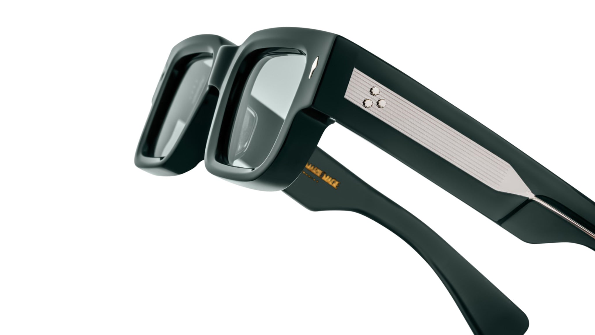 Green 10mm cured cellulose acetate frame paired with matching green lenses. Custom double-laminated acetate temples feature an exposed wirecore for subtle detailing. Sterling silver signature arrowhead front pins add a distinctive touch. The frame is fitted with a tension-secured custom 7-barrel hinge for enhanced stability. Grove CR-39 2 base lenses include a backside anti-reflective treatment and offer 100% UV protection. Rectangular shape.