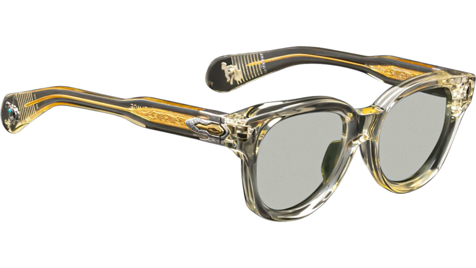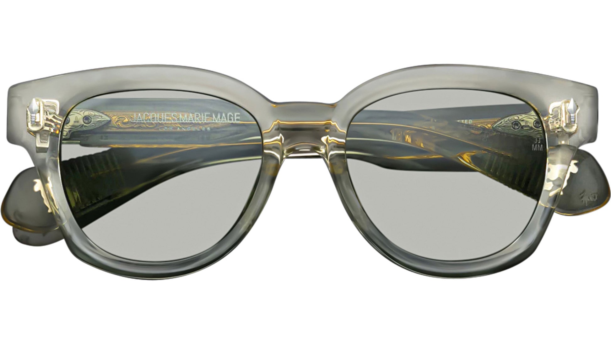 The Jacques Marie Mage Mojave sunglasses are oversized Wellington-shaped frames that blend bold craftsmanship with refined artistry. Featuring expressively engraved precious metal temple embellishments and a distinctive bronco cameo with a turquoise inlay at the temple tip, these spectacles are a testament to timeless design. Inspired by the beauty of starkness and the rarity born from experience, the Mojave embodies elegance and eloquence, handcrafted to endure both the haunting landscapes of the mind and the vast horizons of the world.