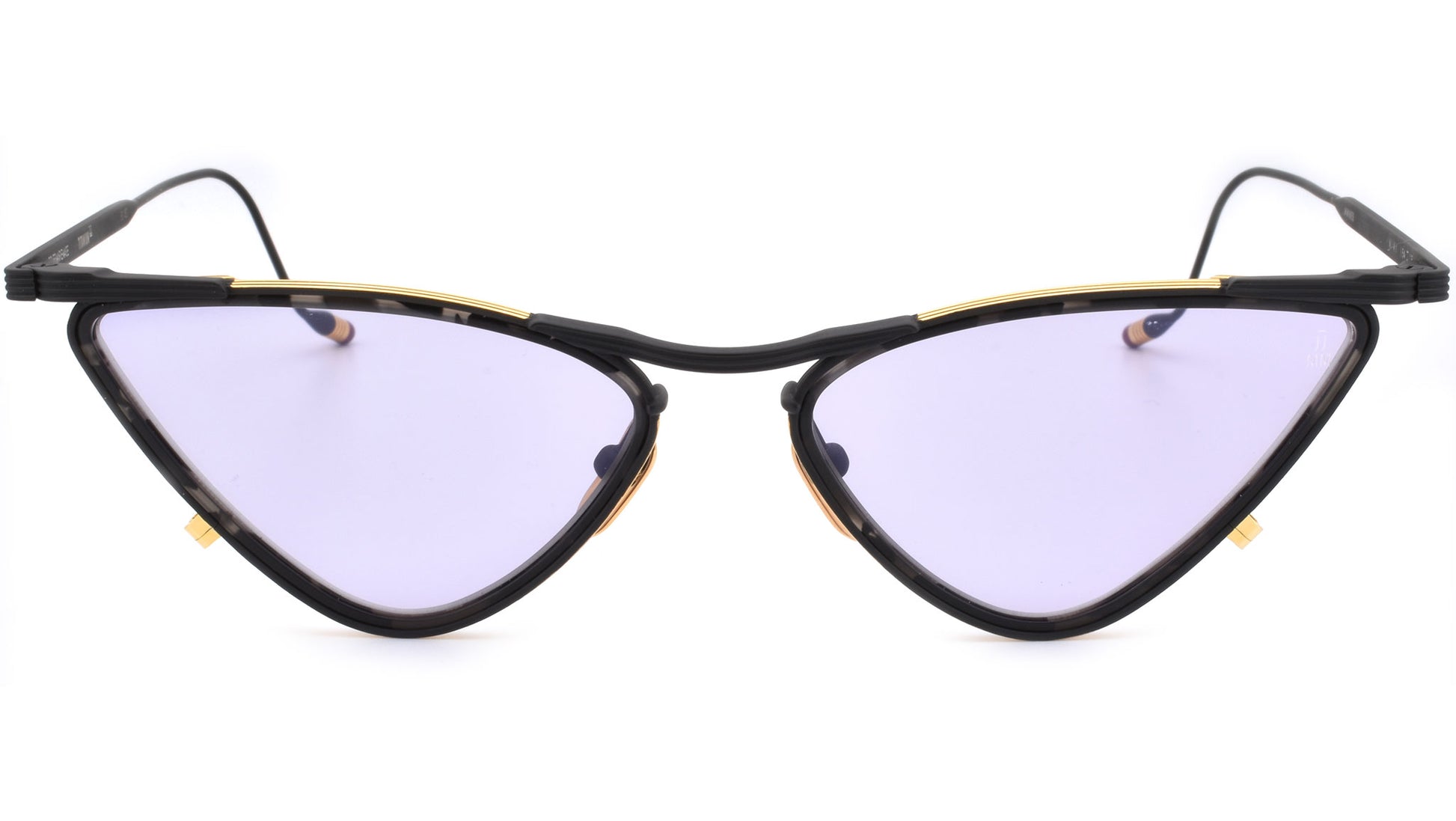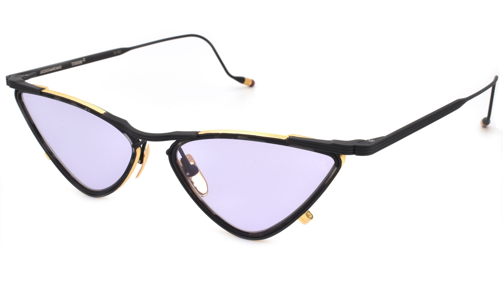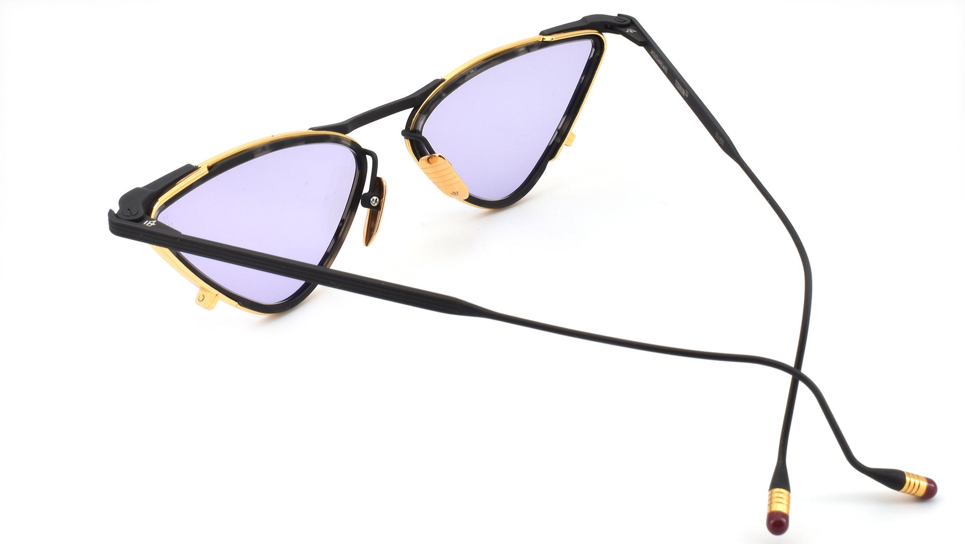 A 60's inspired angular cat eye. Confidence is second nature and competence a foregone conclusion in these trim, triangular conversation-starters inspired by the highly idiosyncratic monumental sculptures of french-american artist, filmmaker, and feminist, Niki de Saint Phalle. Material: 100% beta titanium matte black with gold polished frame. Hardware: beta titanium. Lens: purple CR39. Beta titanium frame. Beta titanium temples with custom detail tip. Monoblock titanium hinge construction. Custom 4mm rim wire with hairline detail. Custom nose pads with logo and hairline engraving. 4 base CR39 lens with backside anti-reflective treatment. 100% uv protection. Limited production batch of 200 pieces. Handcrafted in Japan.