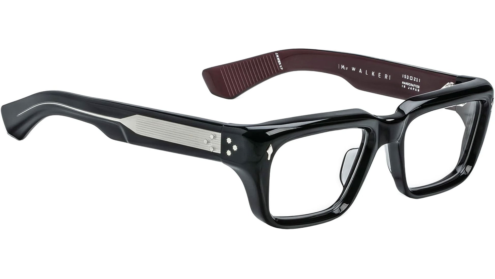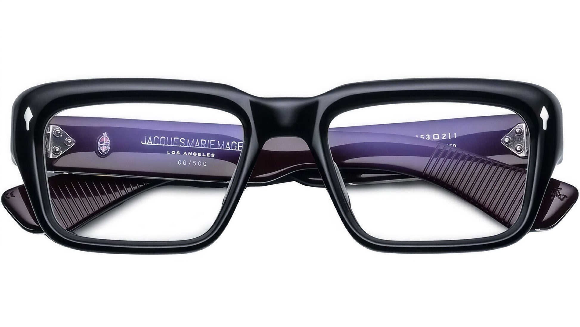 Black 10mm cured cellulose acetate frame with soft angles and custom double-laminated temples. Features a silver arrowhead front pin, exposed inner wirecore, and a tension-secured custom 9-barrel hinge with spur-shaped rivets, combining elegance with durable craftsmanship.