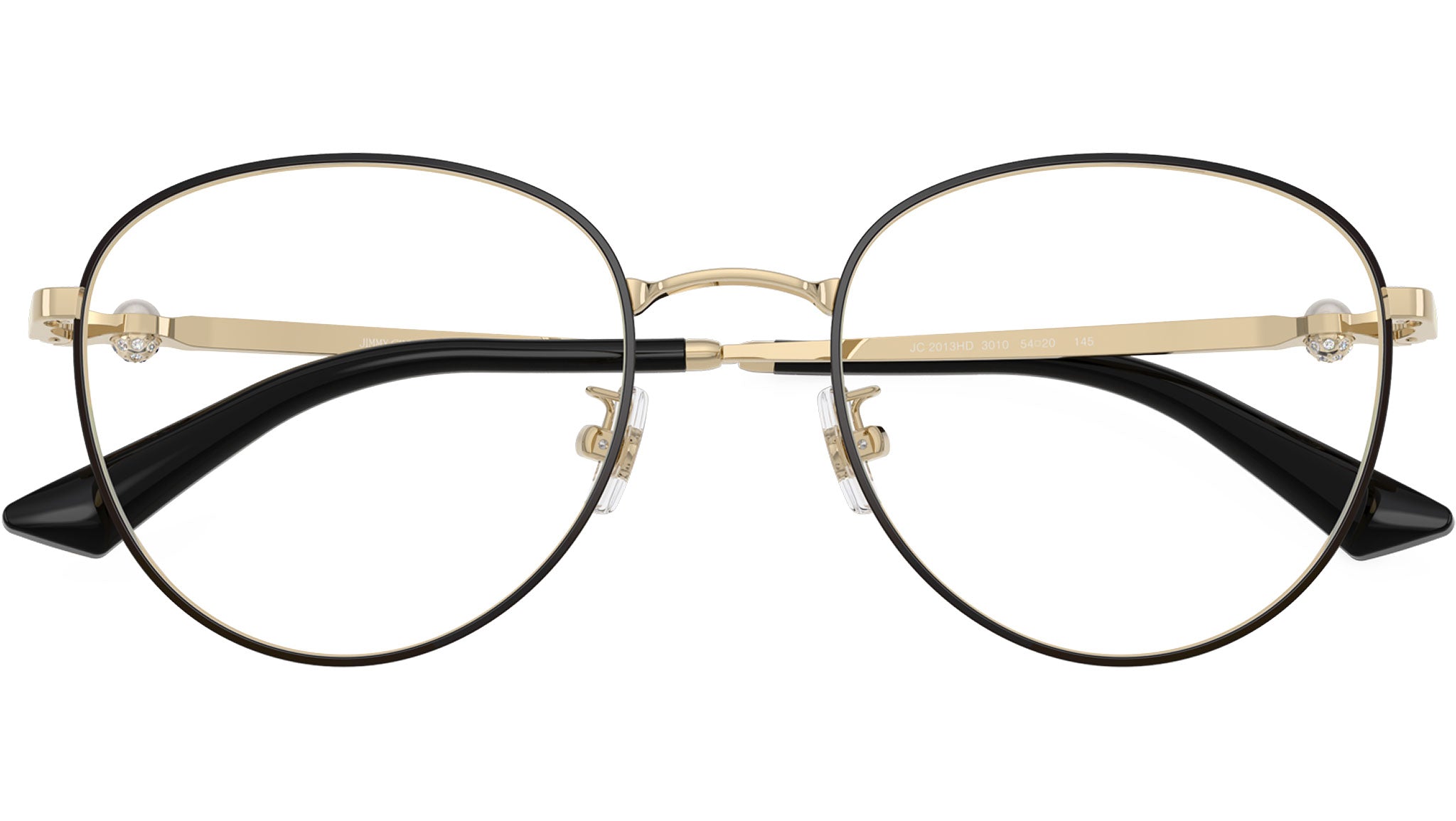 Jimmy Choo JC2013HD 3010 glasses for women, featuring pale gold / black round metal frame and demo lenses. Low bridge fit. Brand line: Pearl. Style code: 0JC2013HD. Color code: 3010. Authorized Jimmy Choo online reseller. Your glasses will include the original case and accessories and are covered by a 12-month global warranty.