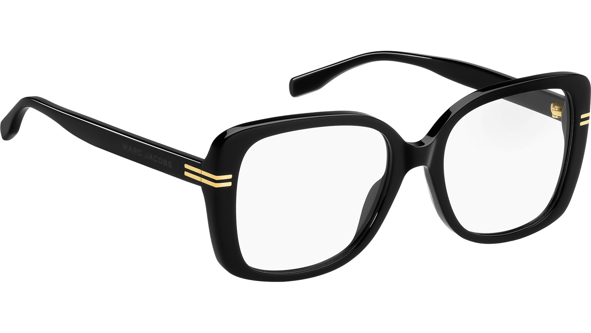 Marc Jacobs MJ 1115 807 glasses for women, featuring black rectangular acetate frame and demo lens lenses. The newest addition to Marc Jacobs' Mod women's eyewear collection, these optical glasses reimagine vintage forms through lightweight materials and exquisite details. The oversized acetate profile is accented with the iconic JJ metal trims that extend to the temples. Versatile neutral hues of black and Havana are joined by statement transparent finishes – all accented with the laser-engraved logo on the side, discreet yet instantly desirable. Brand line: Premium Woman. Style code: 108962. Color code: 807. Authorized Marc Jacobs online reseller. Your glasses will include the original case and accessories and are covered by a 12-month global warranty.