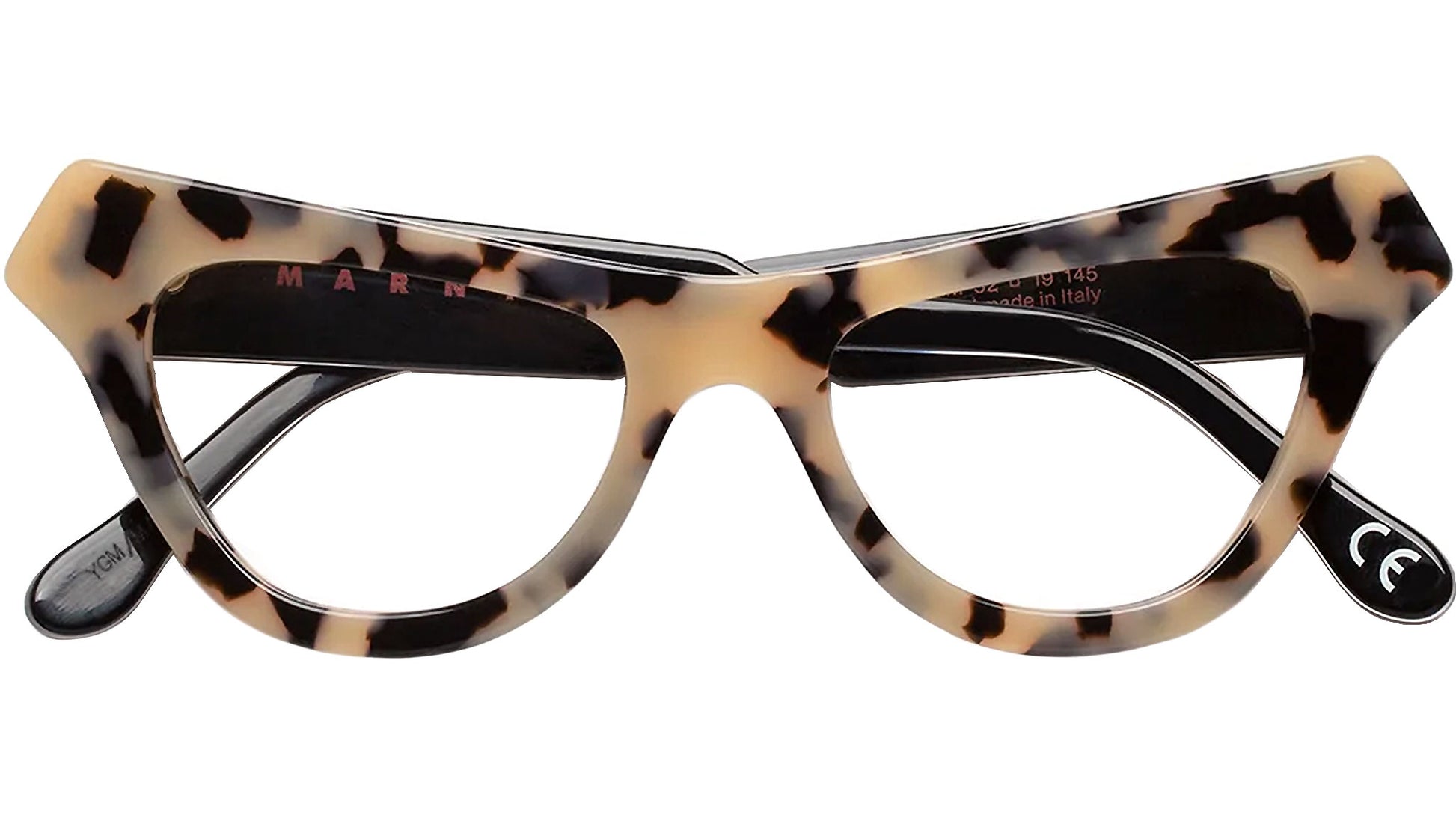 Designed exclusively for Marni, Jeju Island is a bold Optical frame characterized by a chunky acetate construction and sculpted rims. The model is a unique reinterpretation of cat-eye shapes, with triangular lenses and a pointed front. The unique v-shaped browline is matched by softly curved lenses. This version features a spotted Puma front and black temples.