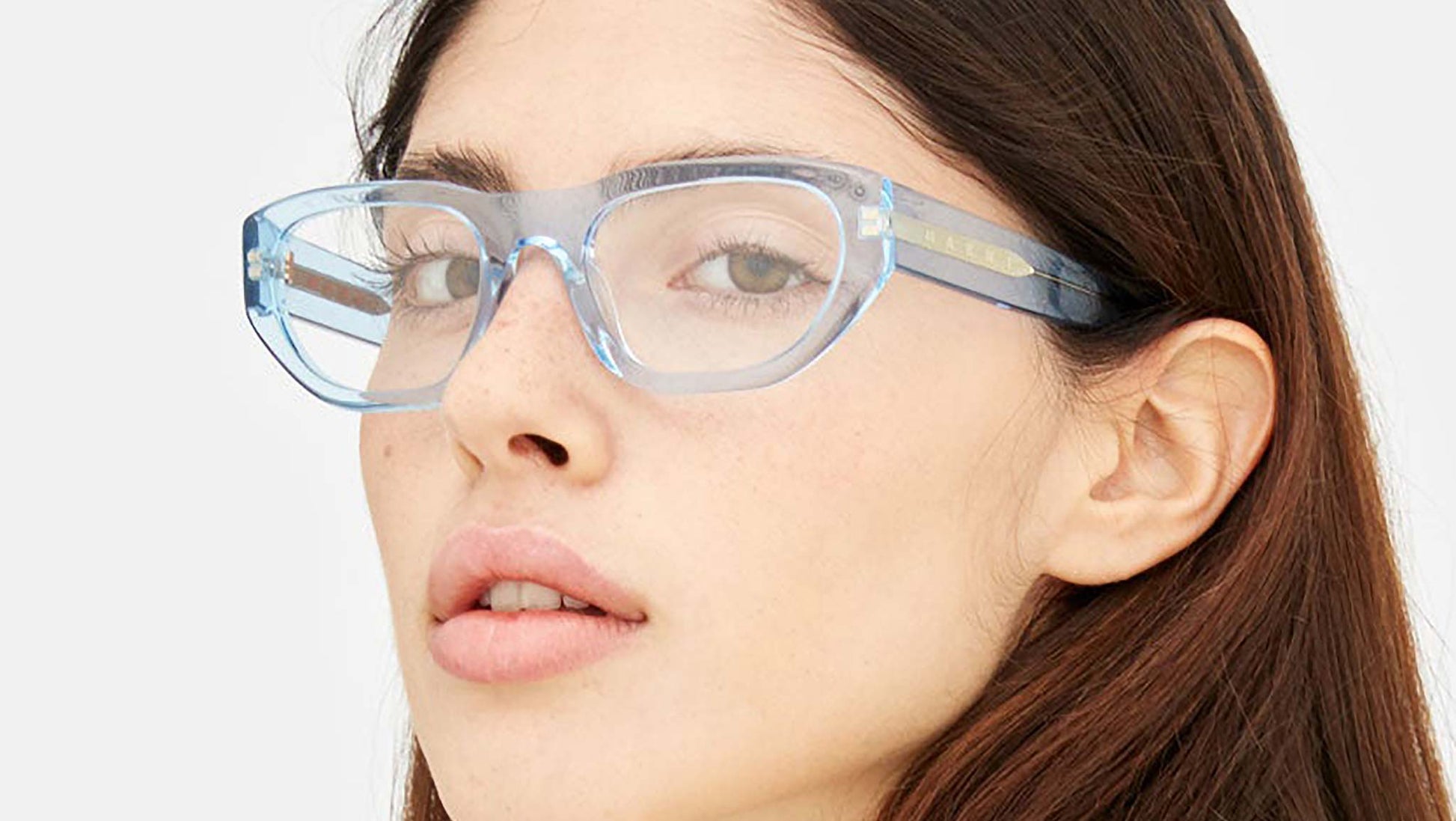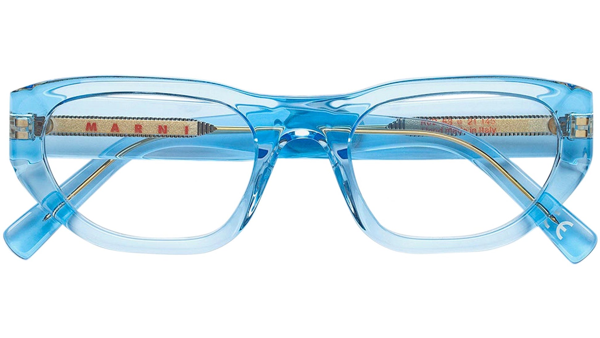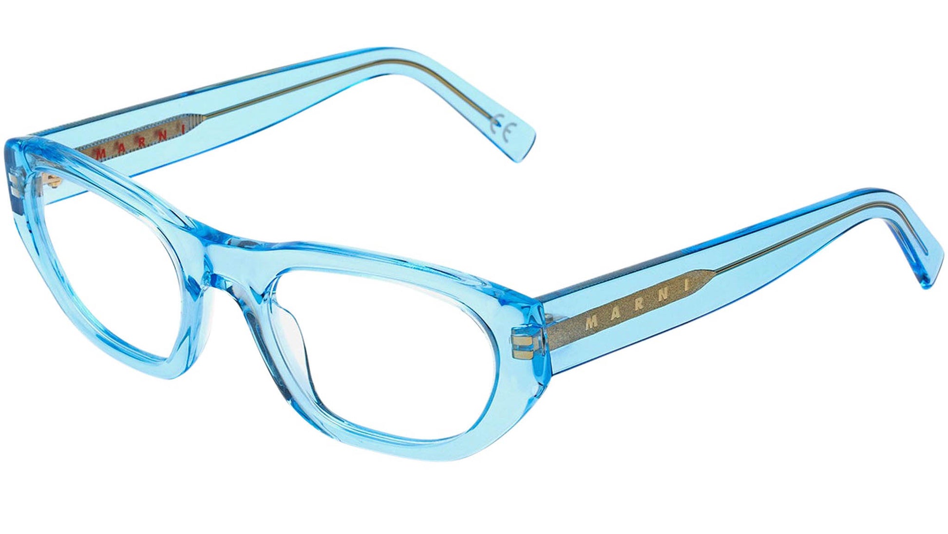 Designed exclusively for Marni, Laamu Atoll is a chunky Optical silhouette characterised by a wide, horizontal shape and a bold brow-line. The model’s thick acetate rims were carefully carved for comfort in use, with curved lines around the lenses and a slanted profile. This version comes in a light crystal blue acetate. Sizes: R Lens Width: 53 mm. Frame Front: Frame Side: 145 mm. Product Code Size R: KJB