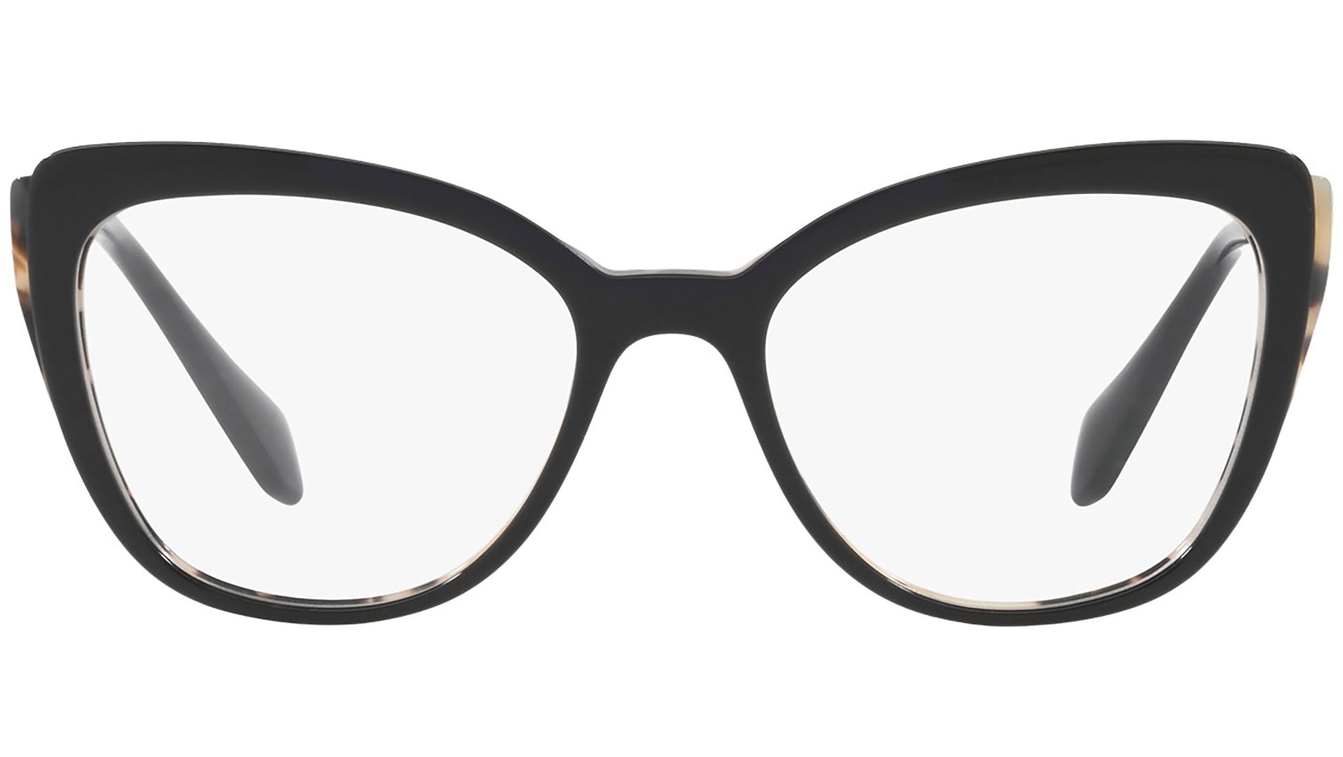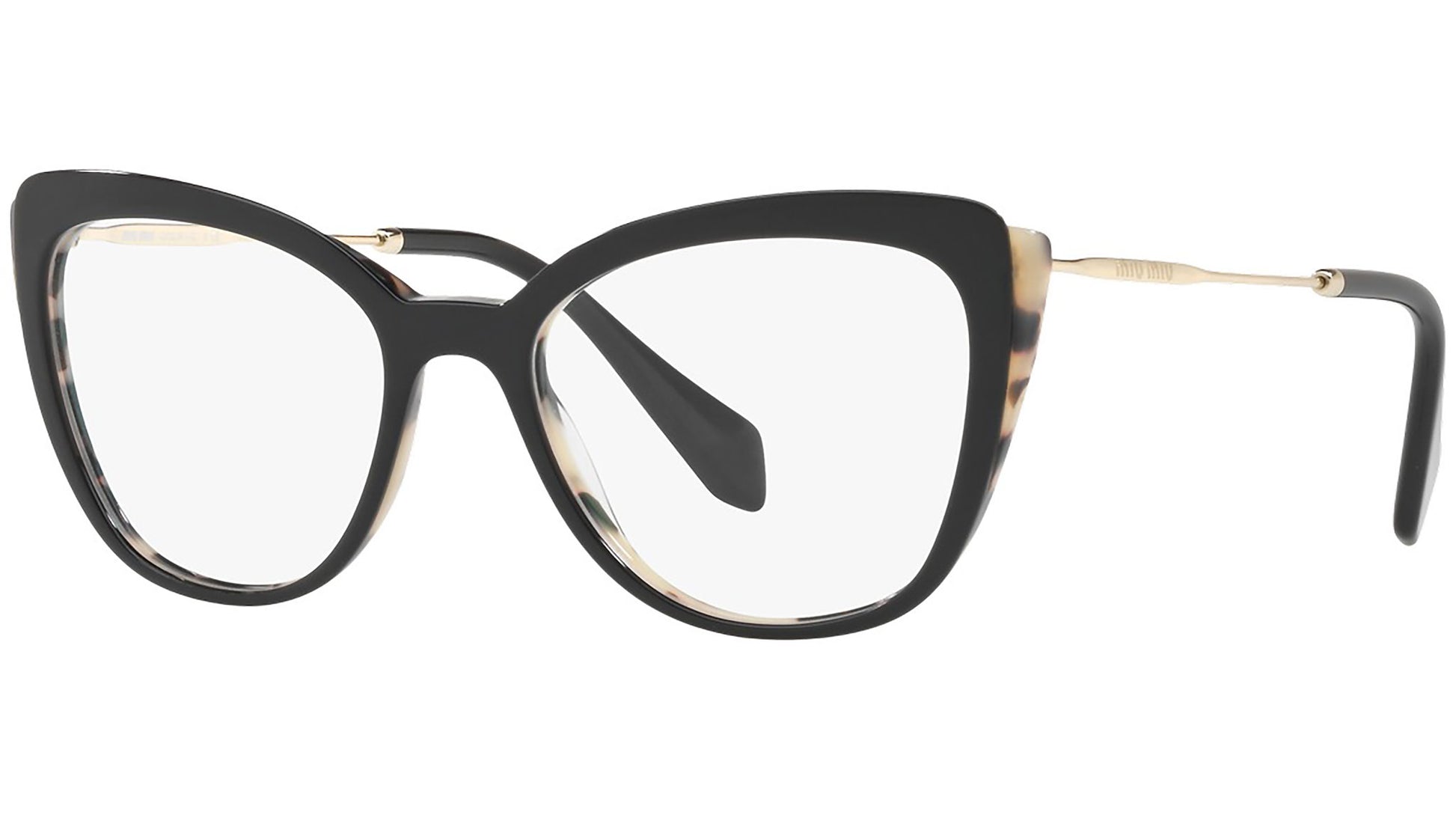 Miu Miu Eyewear Collection model MU 02QV color code ROK1O1 featuring black / gold full rim acetate frame and demo lens. The glasses from Miu Miu eyewear collection are unique creations, the result of the constant stylistic research and skillful craftsmanship of the brand. A unique blend of playful experimentation and rich detailing that perfectly embodies the stylistic codes that have always characterized the House, confirming once again Miu Miu’s undisputed talent in combining unconventional designs with retro-inspired romanticism.