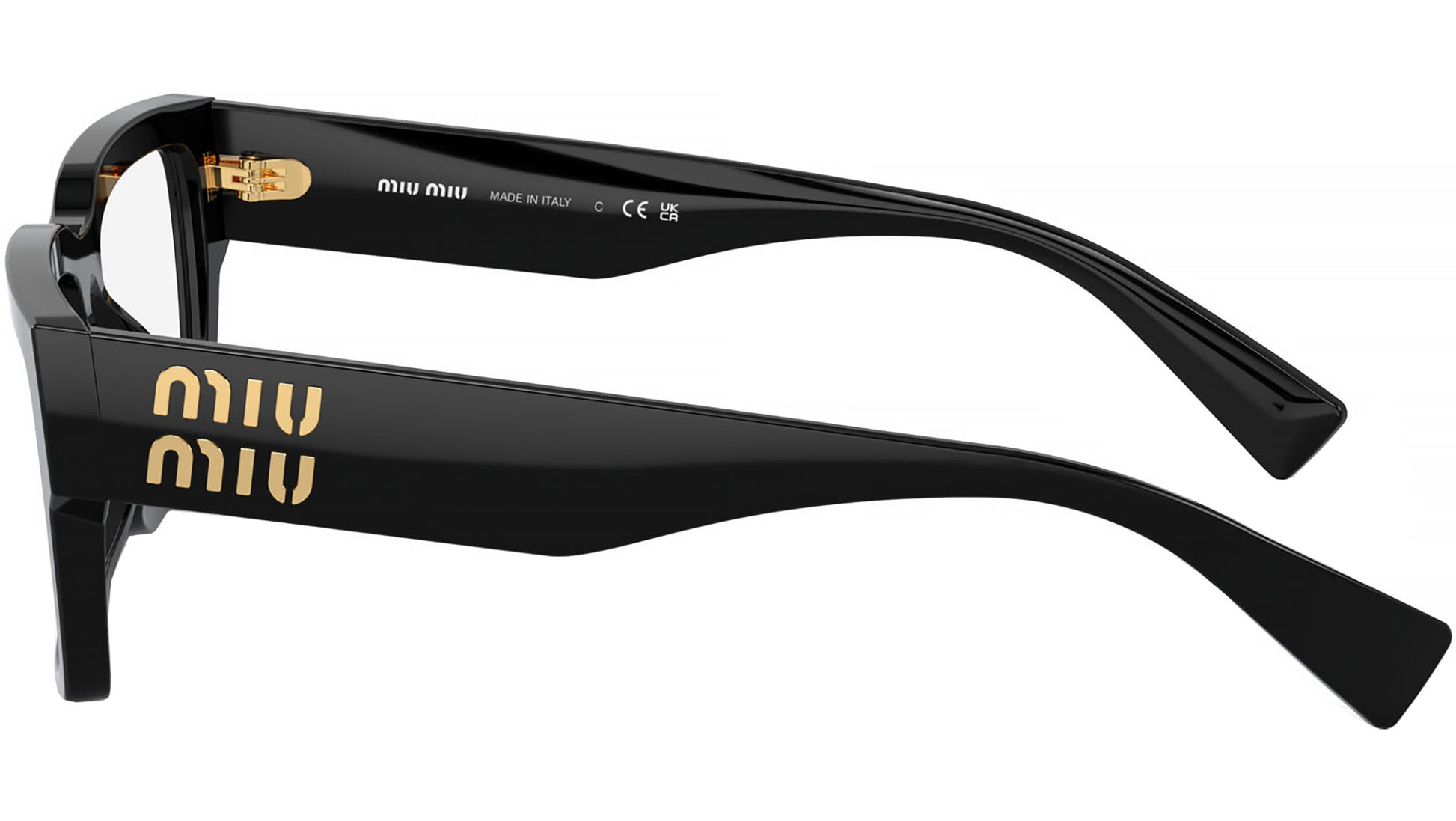 Miu Miu Immediate eyeglasses collection model MU 02XV black full rim rectangle acetate frame with demo lens. Product code MU02XV, color code 1AB1O1. Miu Miu eyeglasses are the epitome of chic and sophisticated fashion. The line showcases unique and avant-garde designs, featuring bold frames, vibrant colors, and intricate detailing