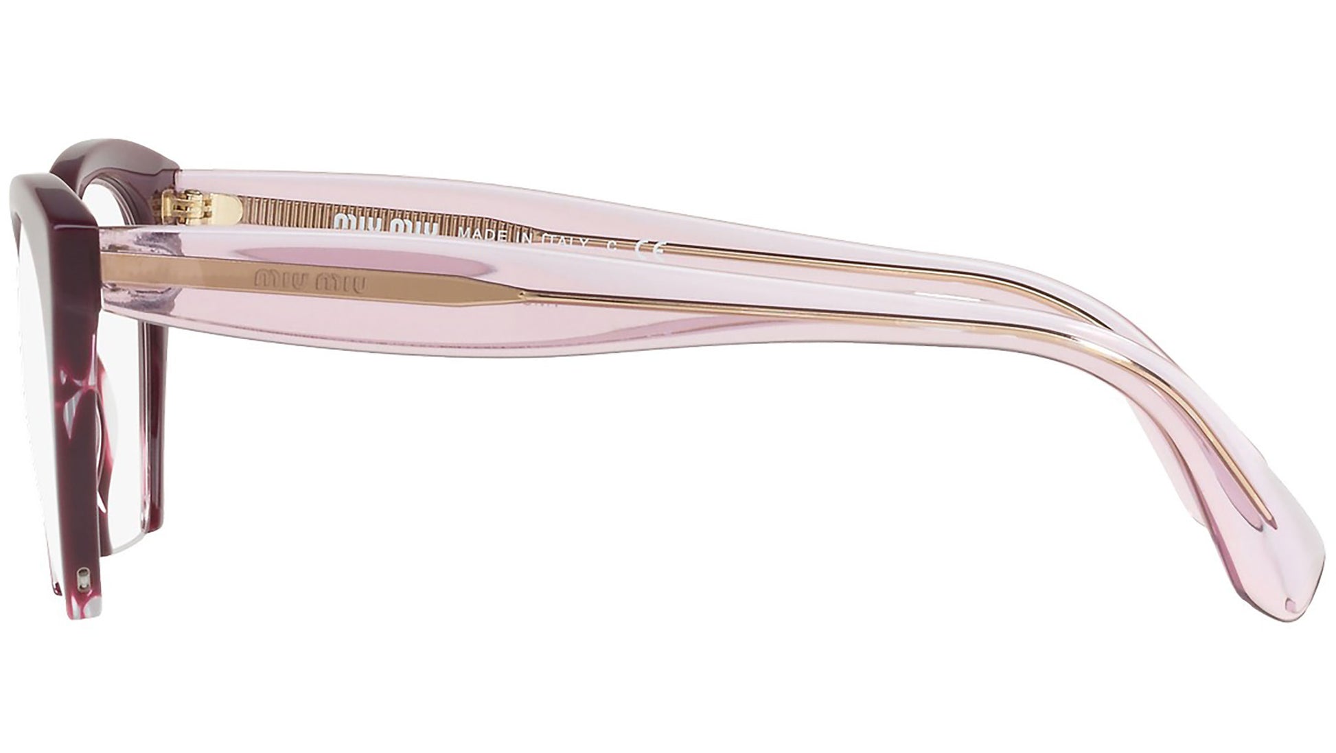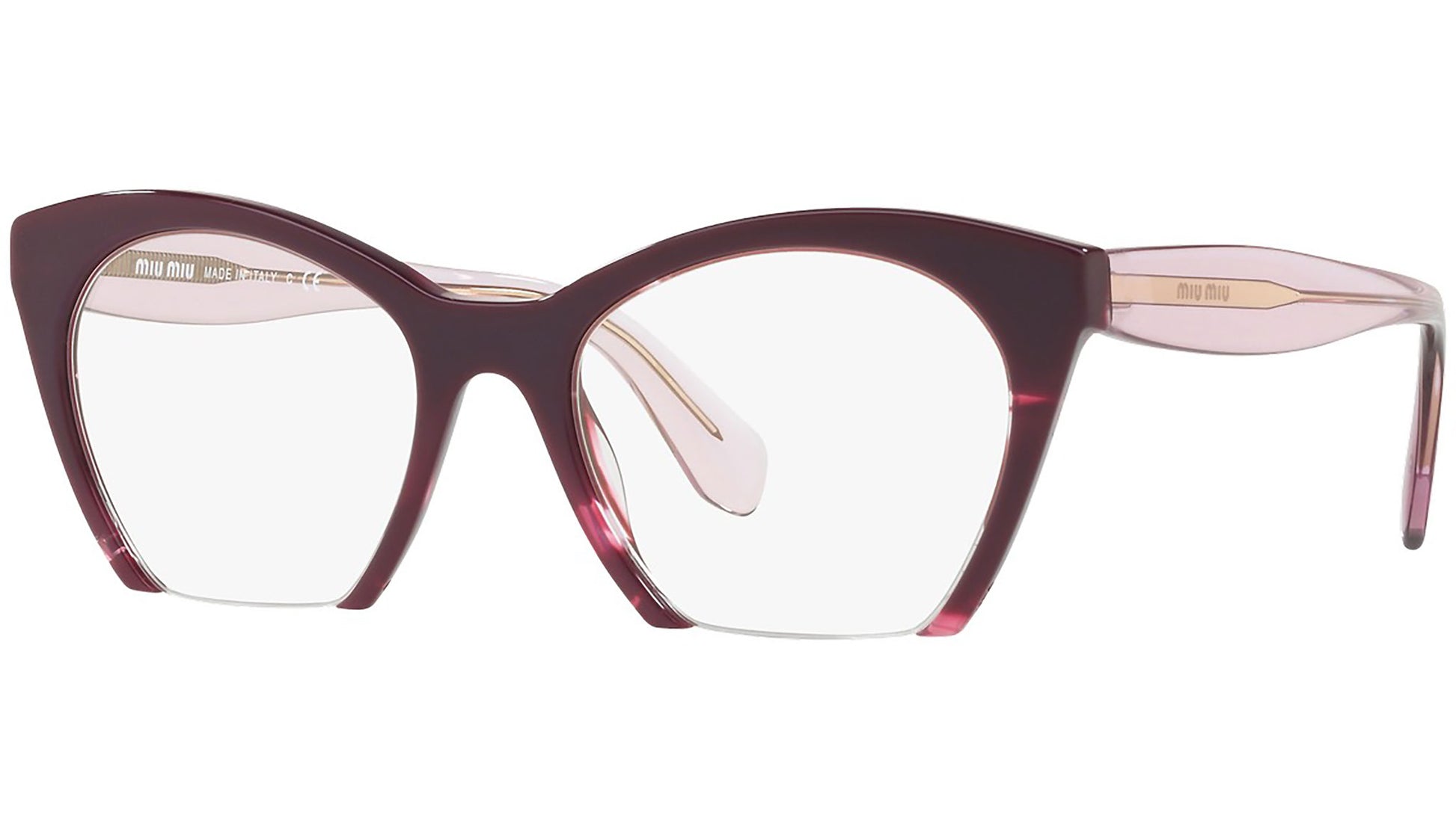 Miu Miu Eyewear Collection model MU 03QV color code Q041O1 featuring grape and pink semi rim acetate frame and demo lens. The glasses from Miu Miu eyewear collection are unique creations, the result of the constant stylistic research and skillful craftsmanship of the brand. A unique blend of playful experimentation and rich detailing that perfectly embodies the stylistic codes that have always characterized the House, confirming once again Miu Miu’s undisputed talent in combining unconventional designs with retro-inspired romanticism.