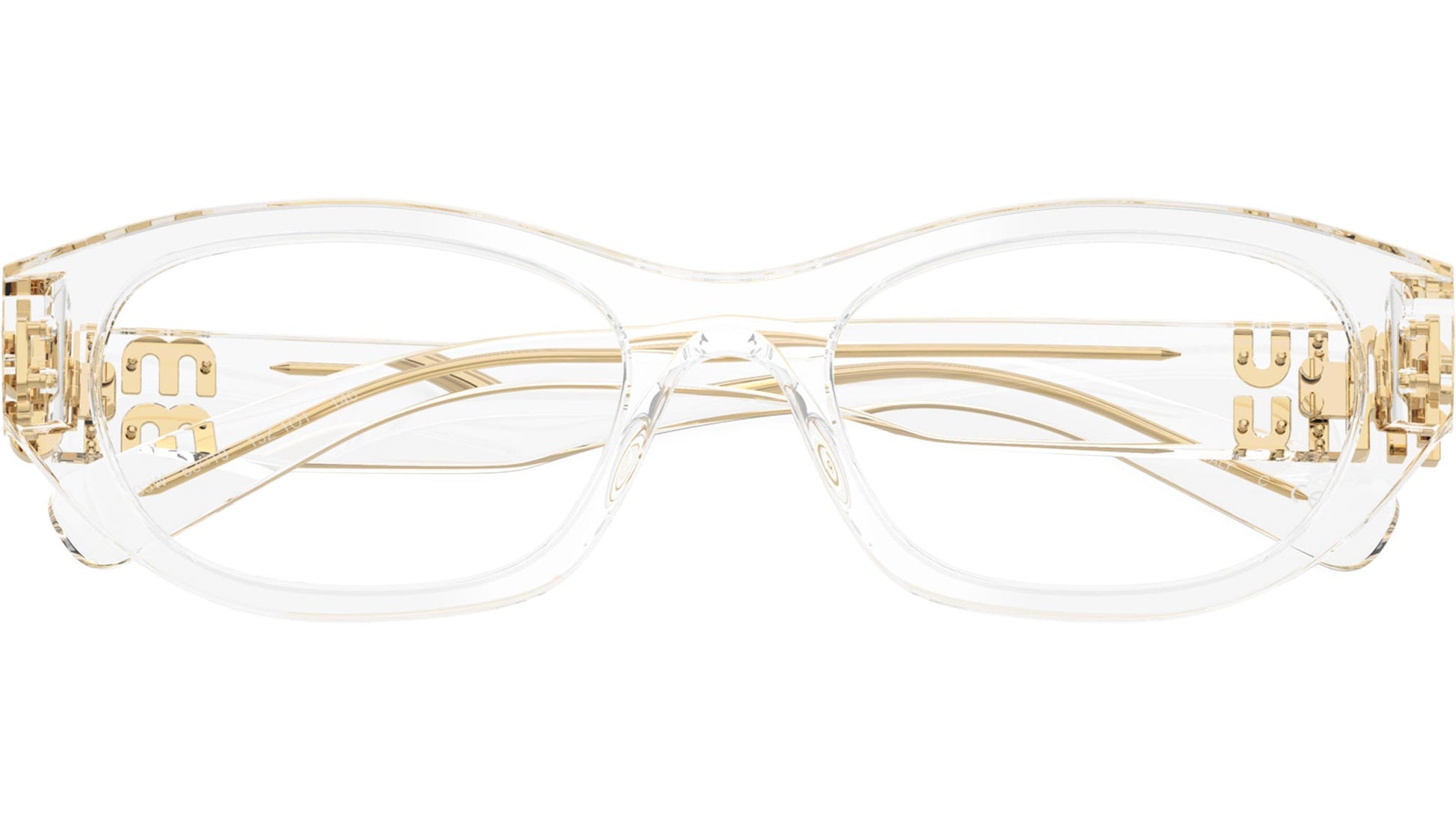 Miu Miu MU 03WV 15Z1O1 glasses for women, featuring transparent geometric acetate frame and demo lenses. High bridge fit. Brand line: Miu Glimpse. Style code: 0MU 03WV. Color code: 15Z1O1. Made in Italy. Authorized Miu Miu online reseller. Your glasses will include the original case and accessories and are covered by a 12-month global warranty.