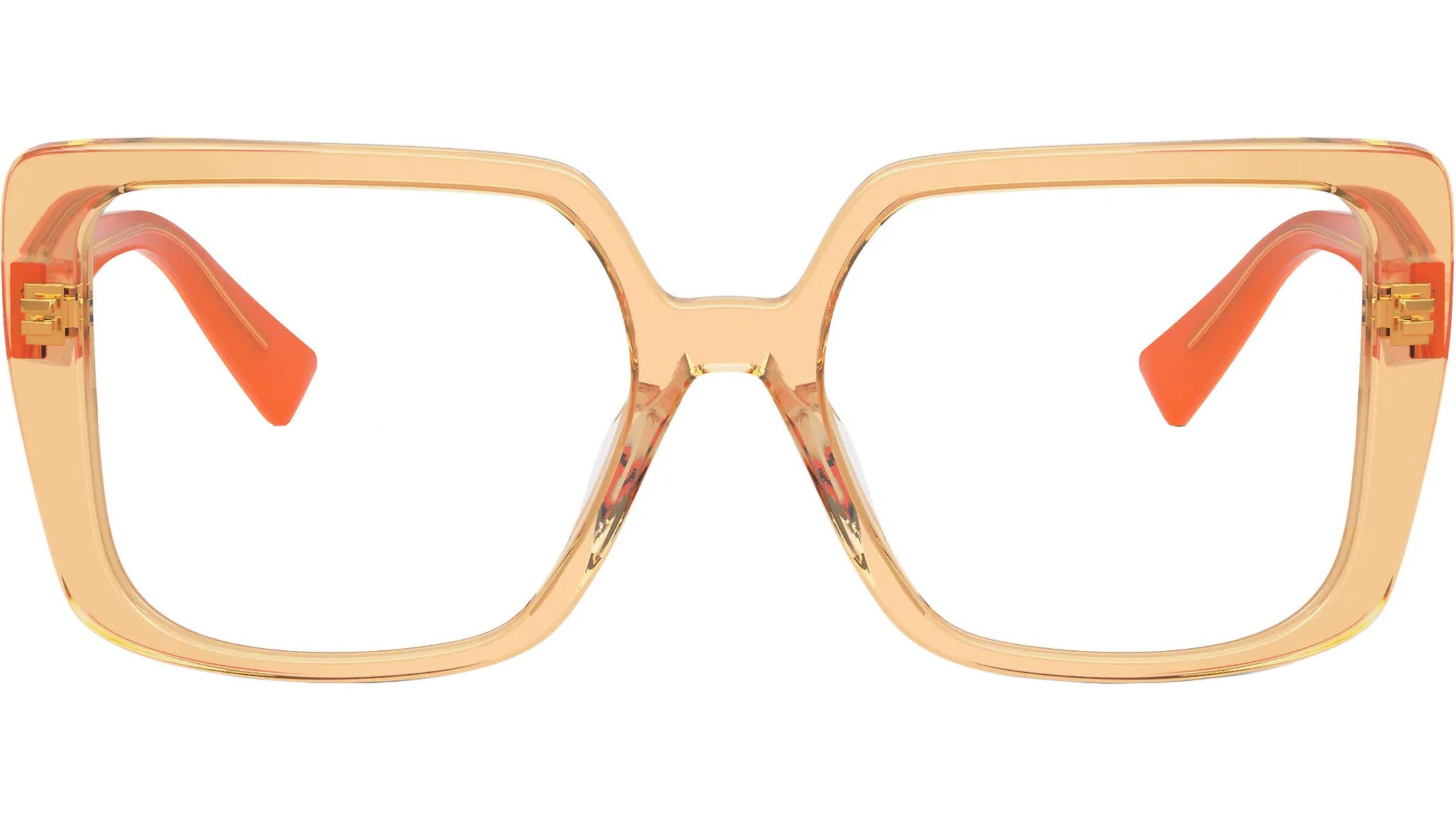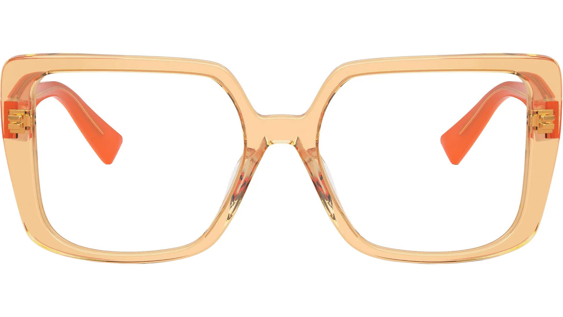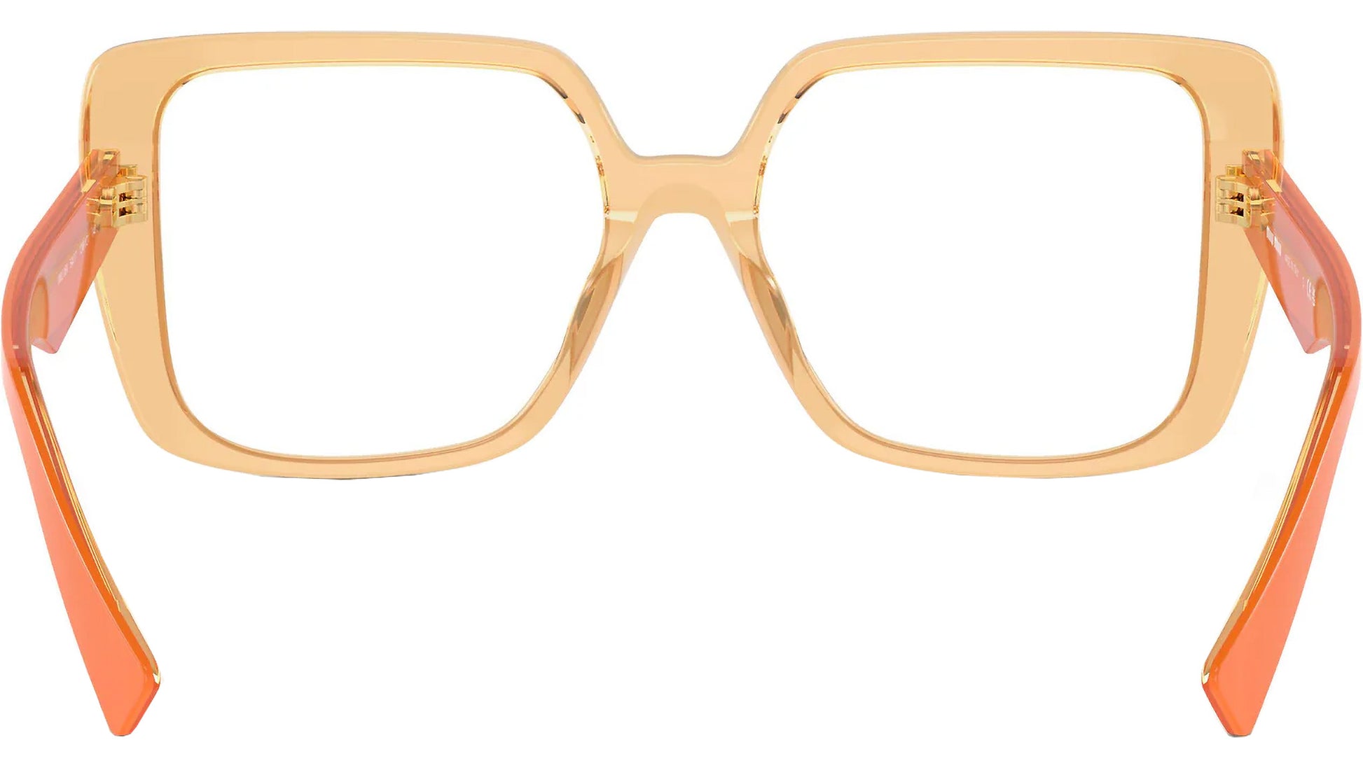 Miu Miu Eyewear Collection model MU 06VV color code 12M1O1 featuring orange full rim acetate frame and demo lens. The glasses from Miu Miu eyewear collection are unique creations, the result of the constant stylistic research and skillful craftsmanship of the brand. A unique blend of playful experimentation and rich detailing that perfectly embodies the stylistic codes that have always characterized the House, confirming once again Miu Miu’s undisputed talent in combining unconventional designs with retro-inspired romanticism.