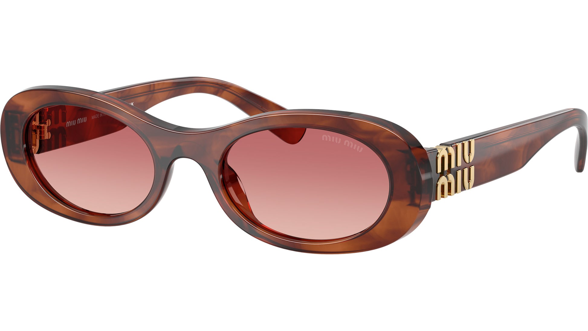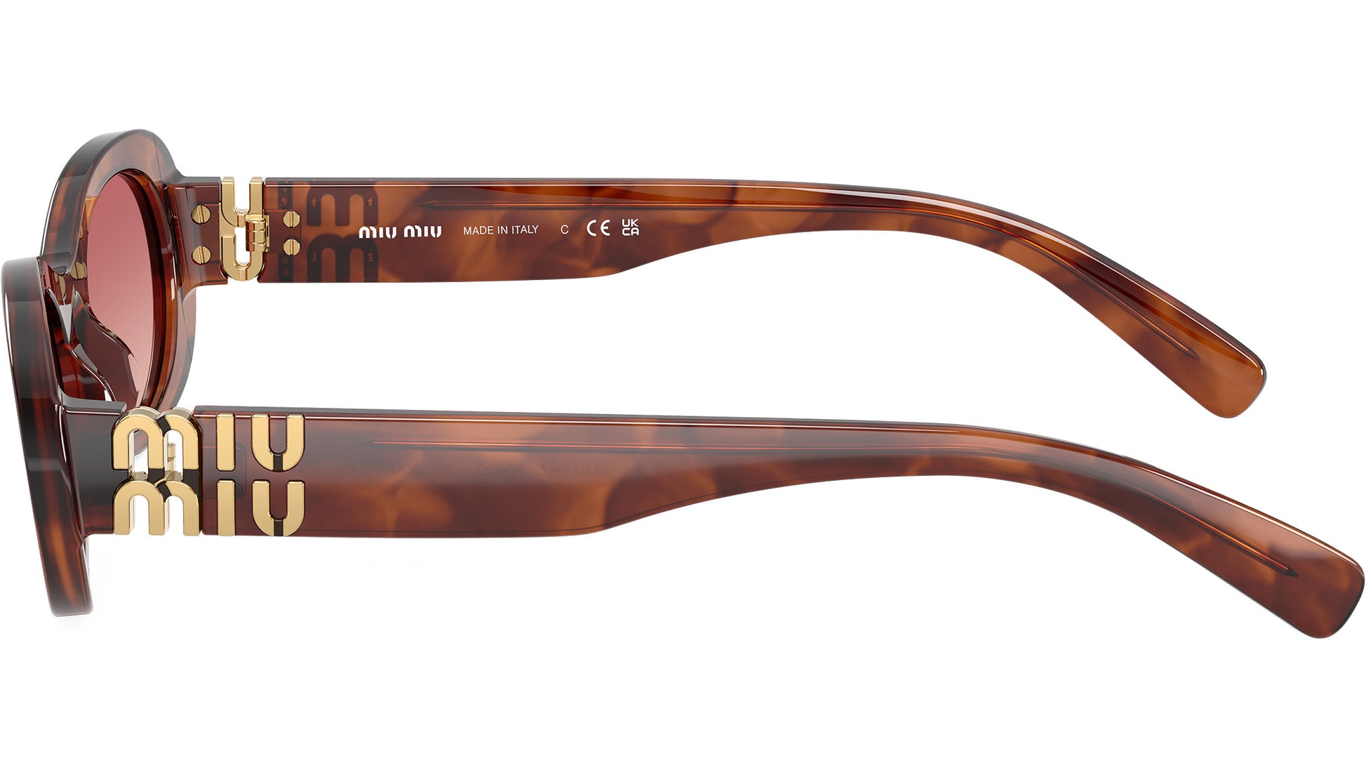 Miu Miu MU 06ZS 26E50U sunglasses for women, featuring striped tobacco oval acetate frame and etruscan bio polyamide lenses. Adjustable nosepads. Brand line: Irreverently Sophisticated. Style code: 0MU 06ZS. Color code: 26E50U. Made in Italy. Authorized Miu Miu online reseller. Your glasses will include the original case and accessories and are covered by a 12-month global warranty.