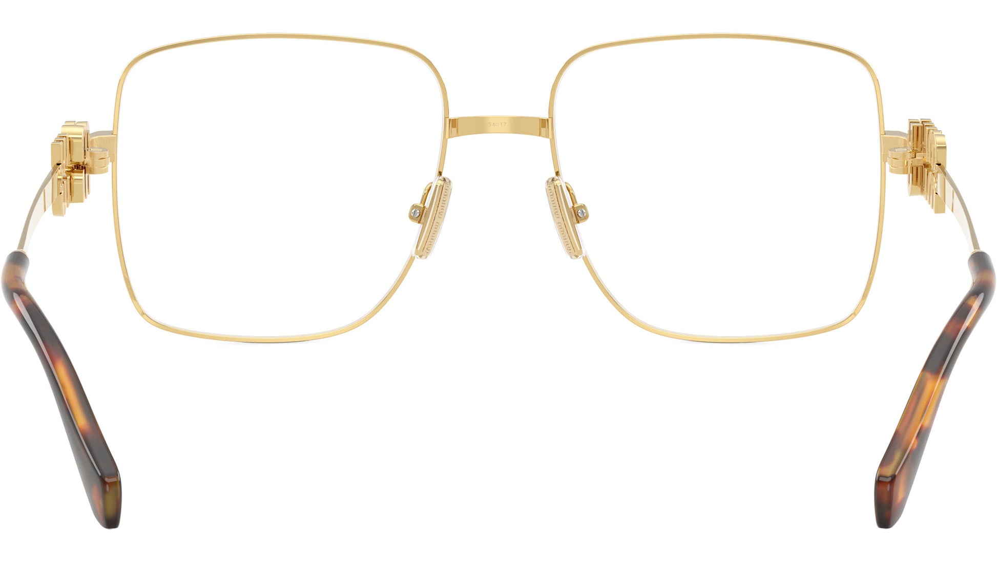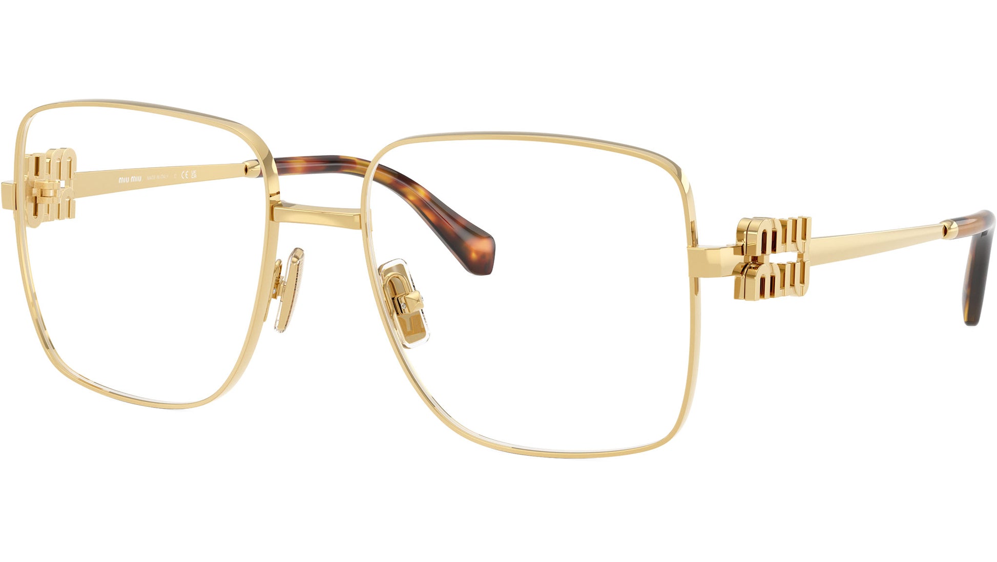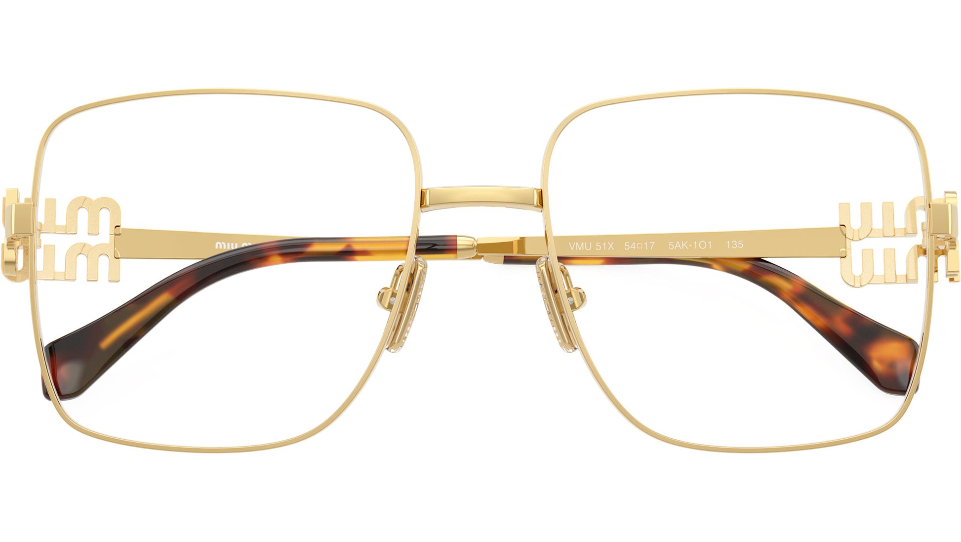 Miu Miu MU 51XV 5AK1O1 glasses for women, featuring gold squared metal frame and demo lenses. Adjustable nosepads. Brand line: Irreverently Sophisticated. Style code: 0MU 51XV. Color code: 5AK1O1. Made in Italy. Authorized Miu Miu online reseller. Your glasses will include the original case and accessories and are covered by a 12-month global warranty.