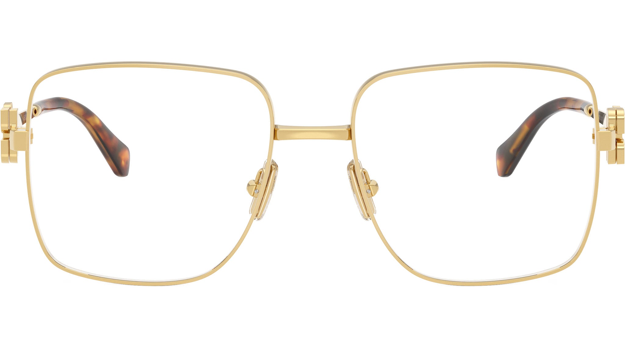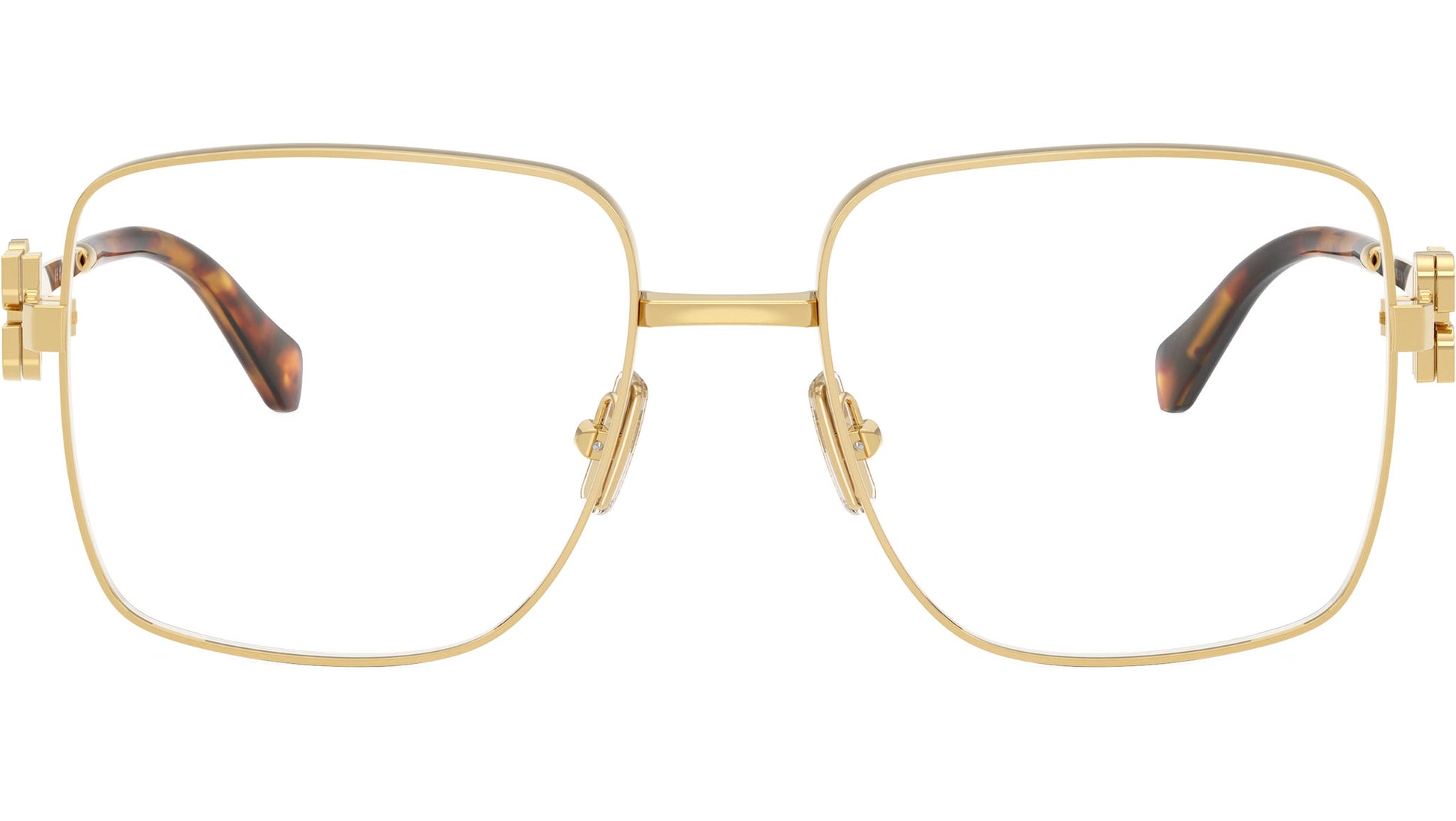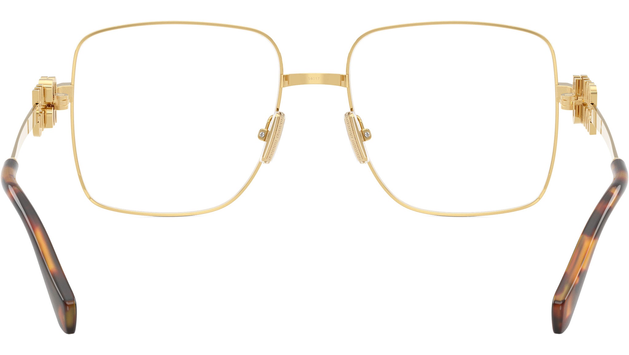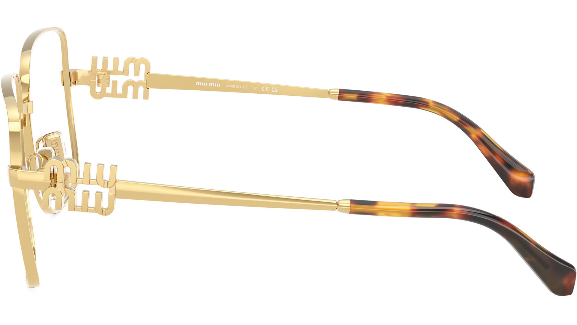 Miu Miu MU 51XV 5AK1O1 glasses for women, featuring gold squared metal frame and demo lenses. Adjustable nosepads. Brand line: Irreverently Sophisticated. Style code: 0MU 51XV. Color code: 5AK1O1. Made in Italy. Authorized Miu Miu online reseller. Your glasses will include the original case and accessories and are covered by a 12-month global warranty.