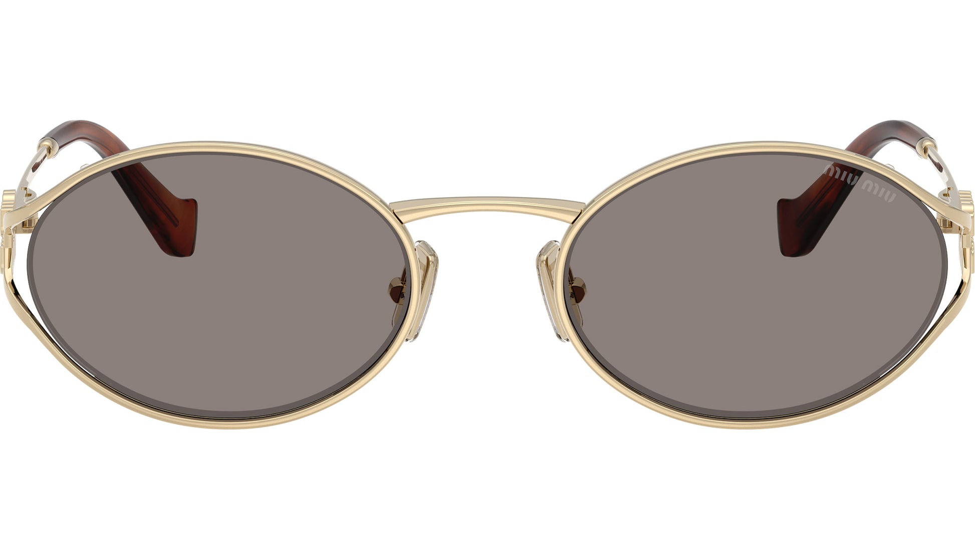 Miu Miu MU 52YS ZVN80Q sunglasses for women, featuring pale gold oval metal frame and dark grey bio polyamide lenses. High bridge fit. Brand line: Irreverently Sophisticated. Style code: 0MU 52YS. Color code: ZVN80Q. Made in Italy. Authorized Miu Miu online reseller. Your glasses will include the original case and accessories and are covered by a 12-month global warranty.
