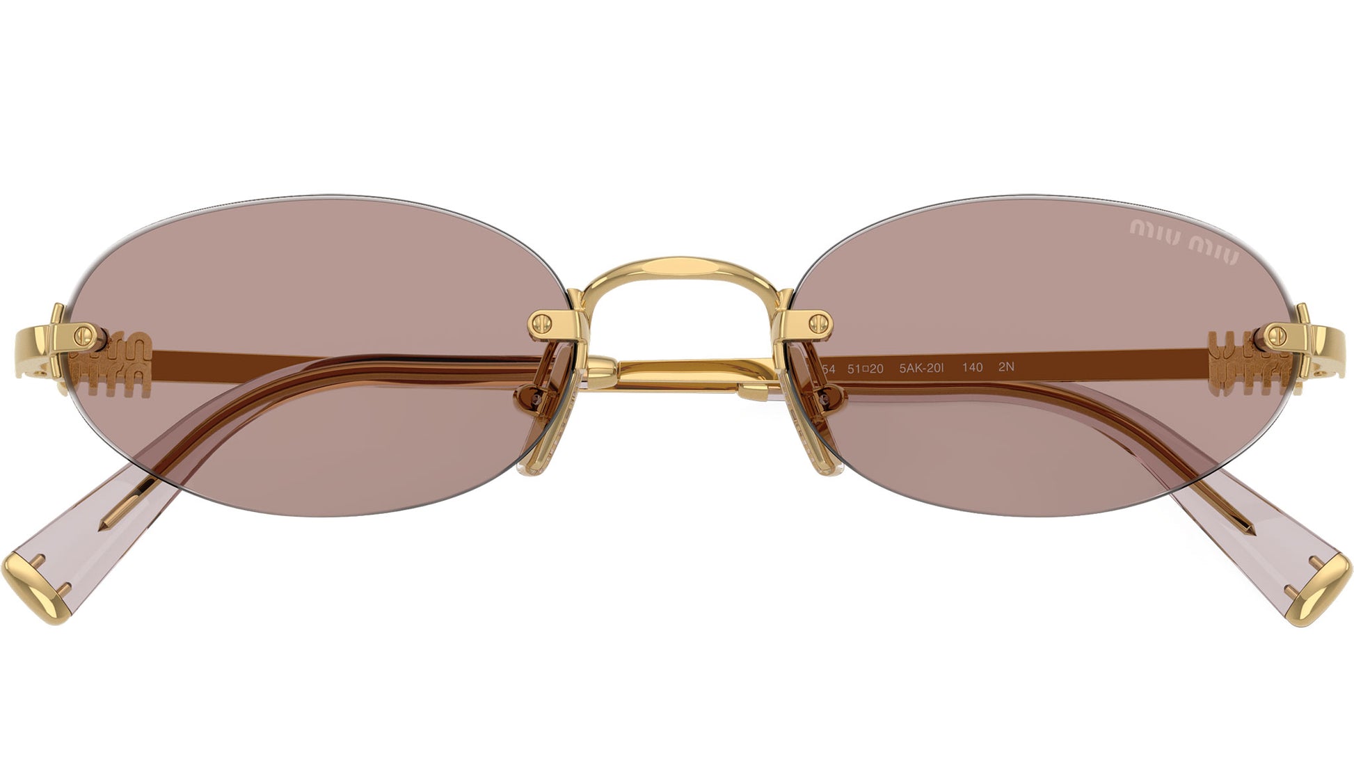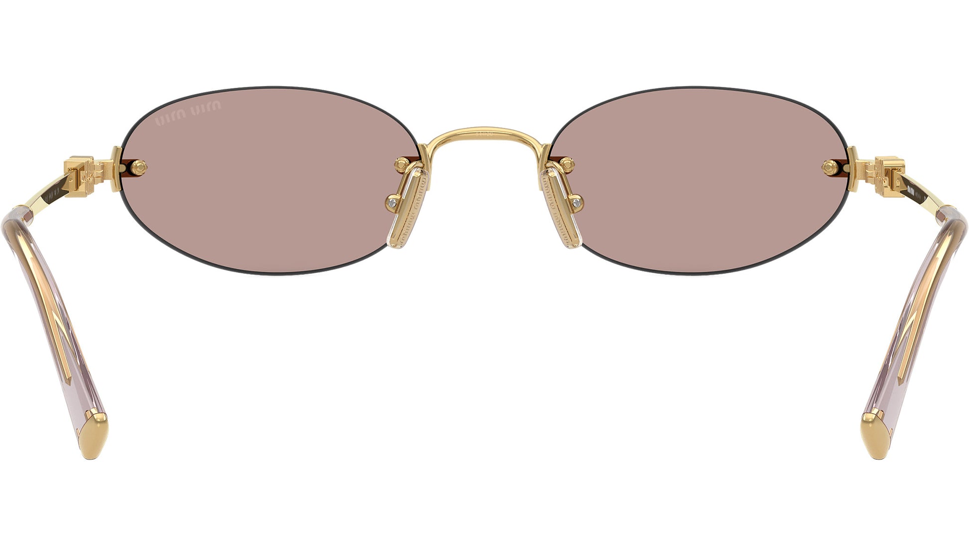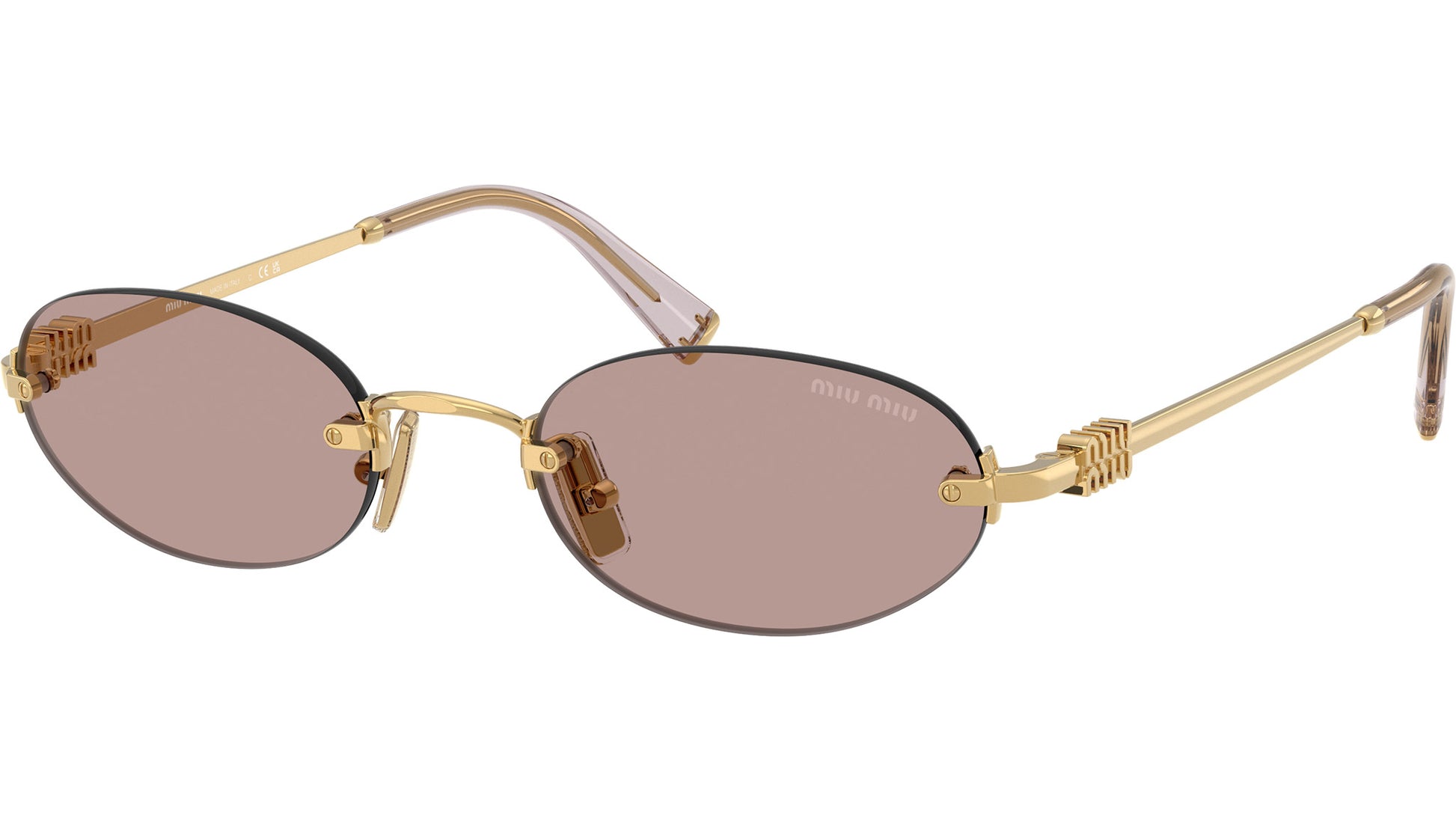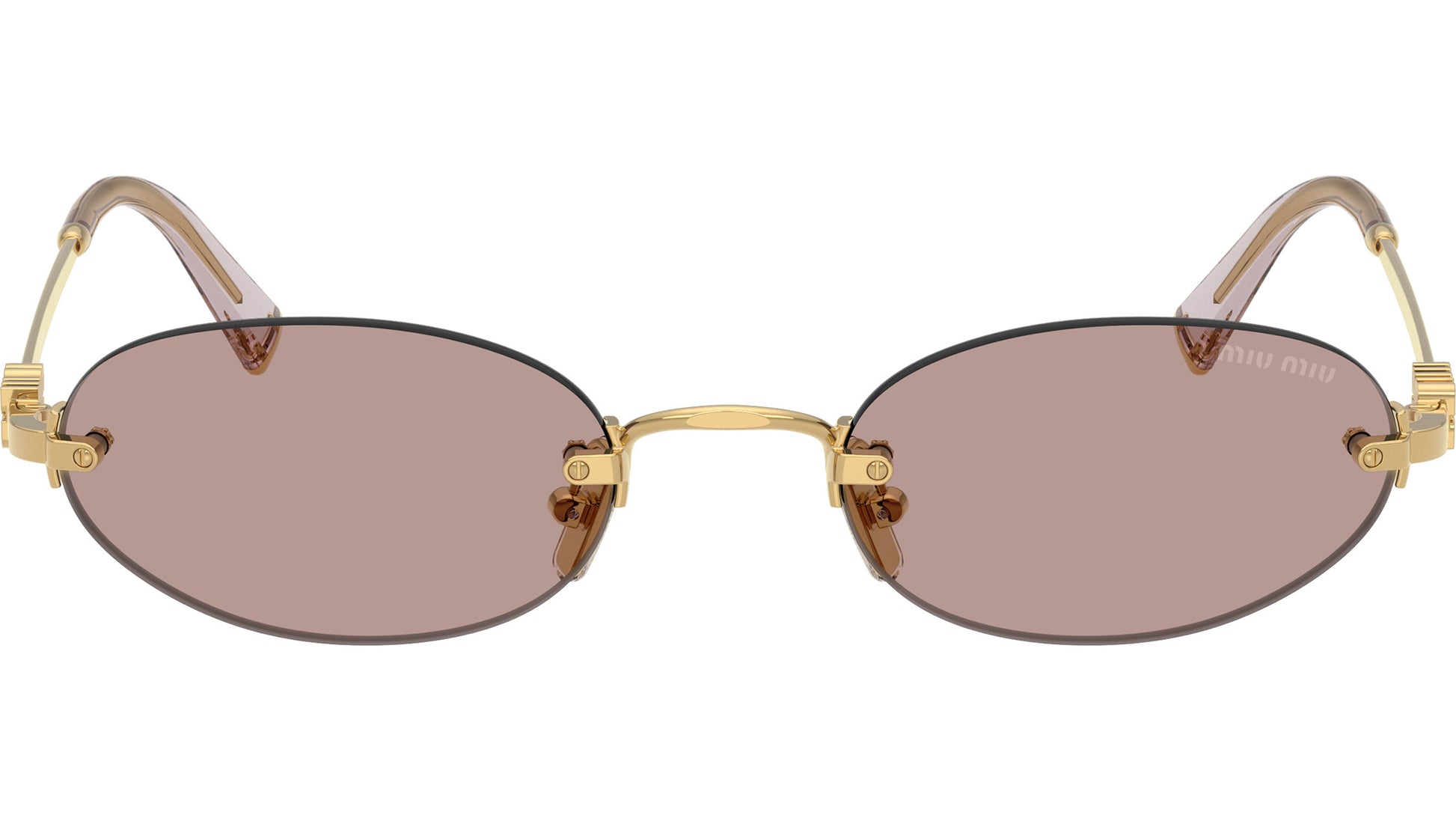 Miu Miu MU A54S 5AK20I sunglasses for women, featuring gold oval metal frame and light purple brown bio polyamide lenses. Adjustable nosepads. Brand line: Miu Regard. Style code: 0MU A54S. Color code: 5AK20I. Made in Italy. Authorized Miu Miu online reseller. Your glasses will include the original case and accessories and are covered by a 12-month global warranty.