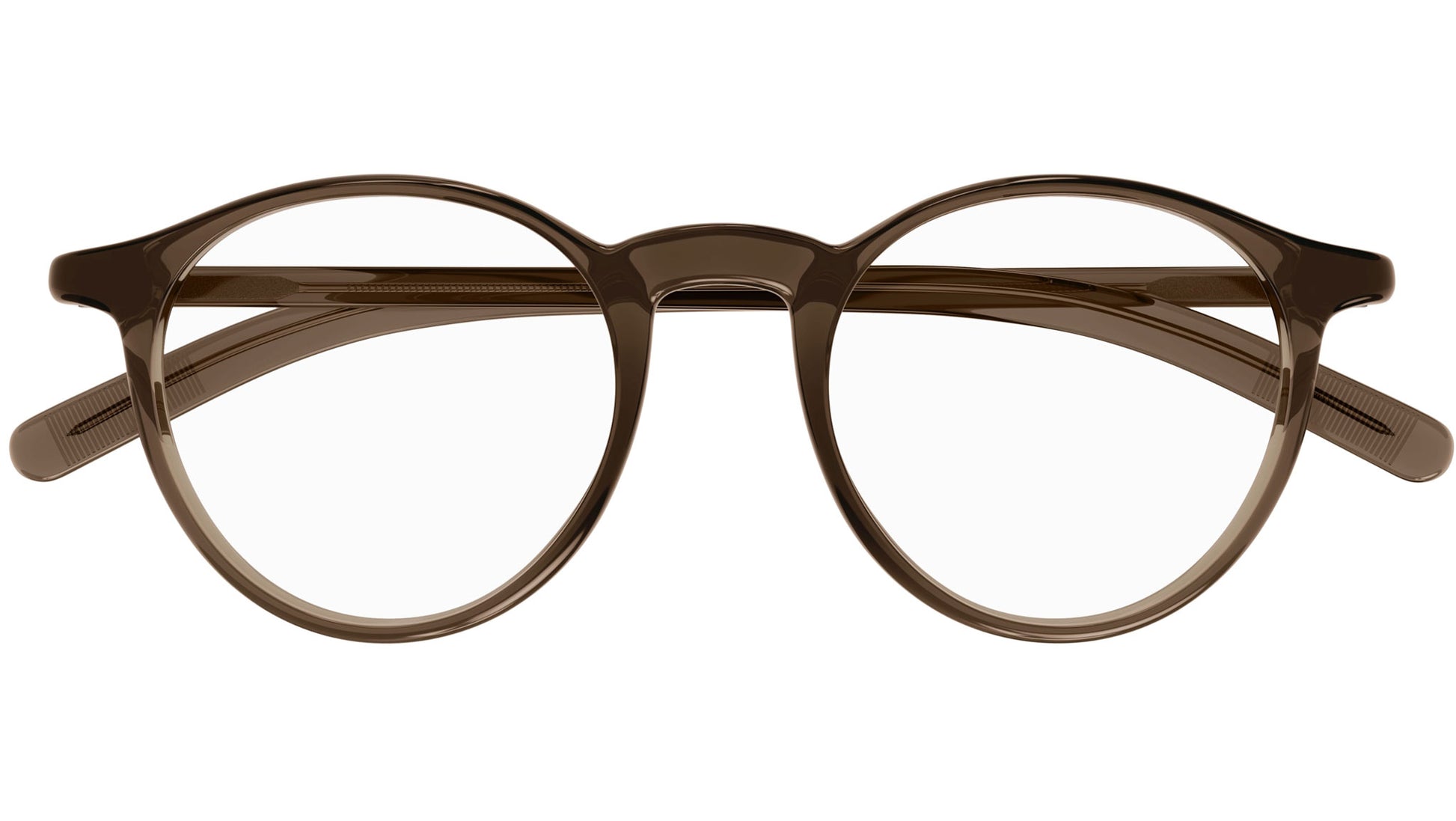 Montblanc eyewear model MB0329O Snowcap line panthos recycled injected acetate glasses, color code 003 shiny transparent brown with brown temple and demo lens.