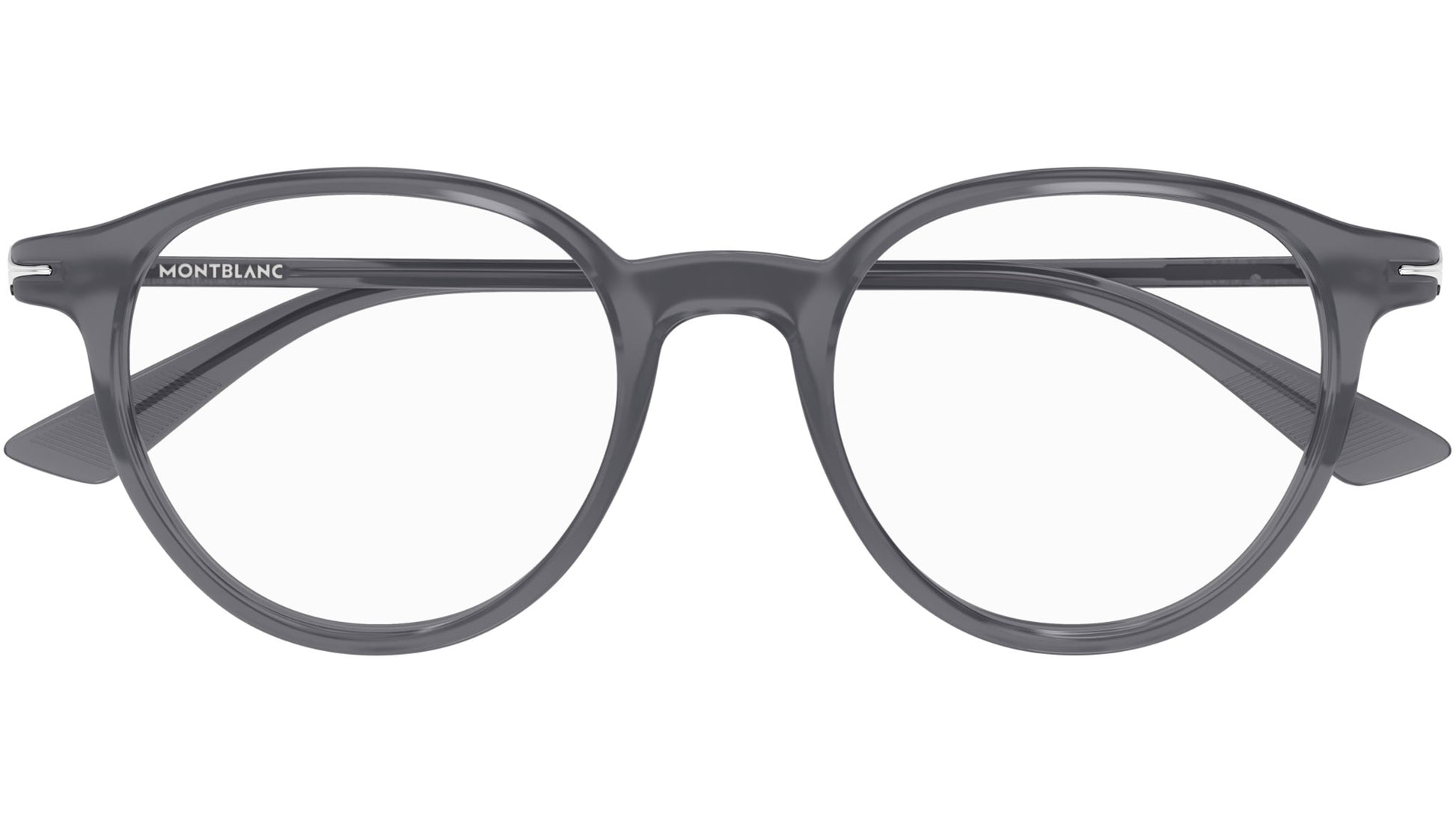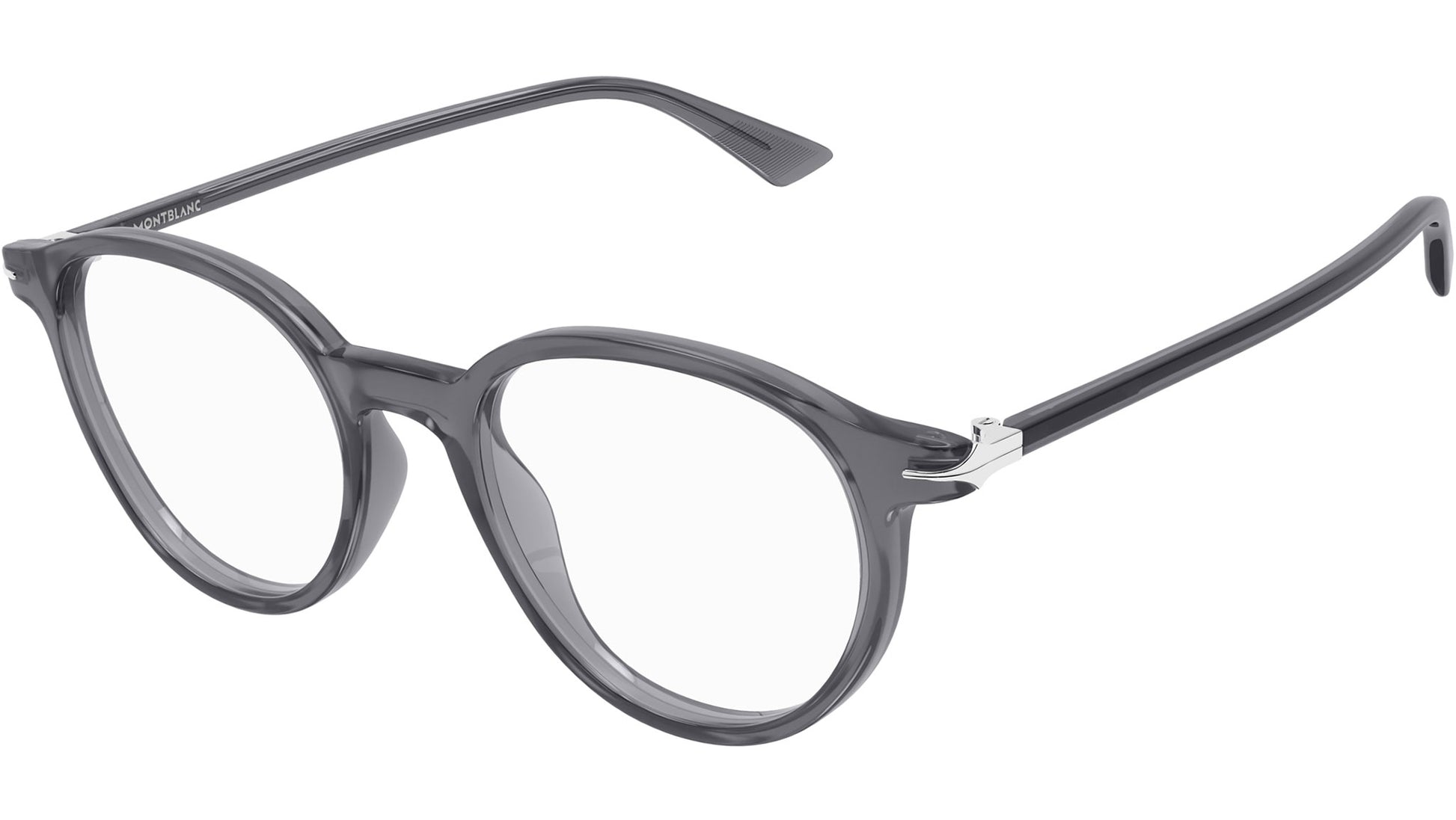 Montblanc eyewear model MB0340O Nib line rectangle recycled acetate glasses, color code 004 shiny transparent grey with grey temple and demo lens.