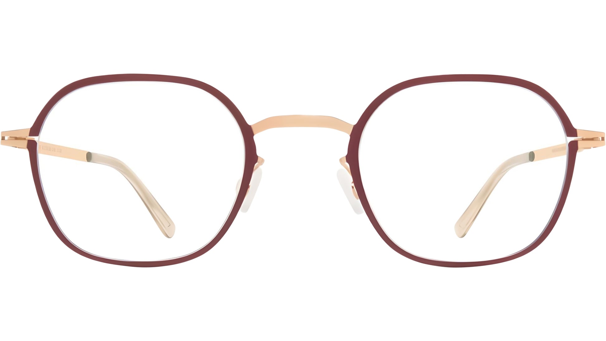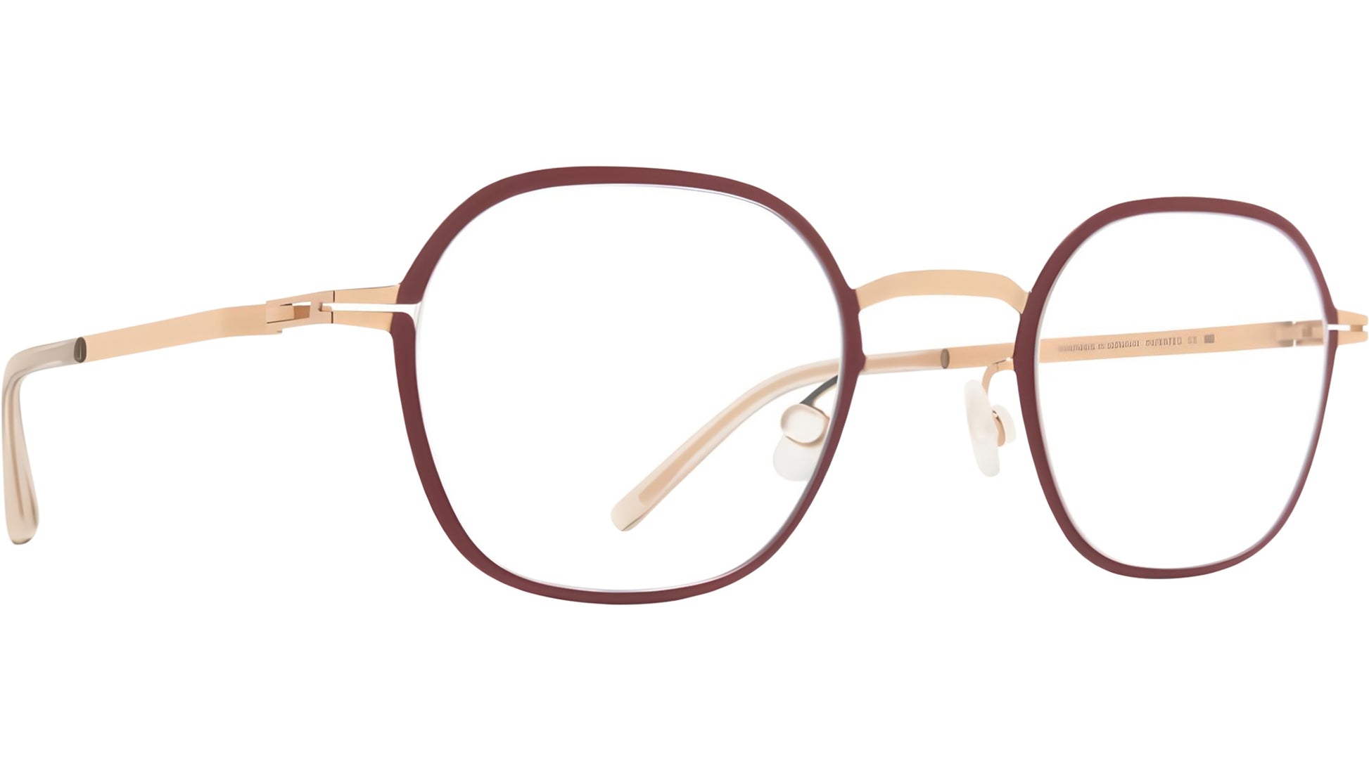 Mykita JES 435 glasses for men and woman, featuring champagne gold / cranberrry squared stainless steel frame and demo lenses. The LITE collection embodies modern minimalism with contemporary shapes and balanced constructions that offer exceptional comfort and refined aesthetics. Featuring pure stainless steel frames and mixed material models with acetate elements, the collection is defined by slim 3mm steel temples and a distinctive spiral hinge. Brand line: LITE. Style code: 10081268. Color code: 435. Made in Germany. Authorized Mykita online reseller. Your glasses will include the original case and accessories and are covered by a 12-month global warranty.