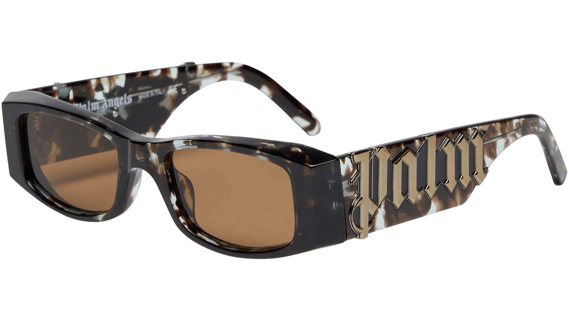 Angel by Palm Angel is a subtle 90s feeling, matching with a rock attitude. Angel presents a solid structure, where the maxi Palm Angels logo in the iconic goth font of the brand steadily marks its personality, clashing with the ordinary. The Angel sunglasses with a bold rectangular shape are characterized by the statement logo featured on their temple. The frame is made entirely of acetate and plays on contrasts and volume. The temple is adorned with galvanized metal over the logo in relief. A statement frame for a 90s rock styling.