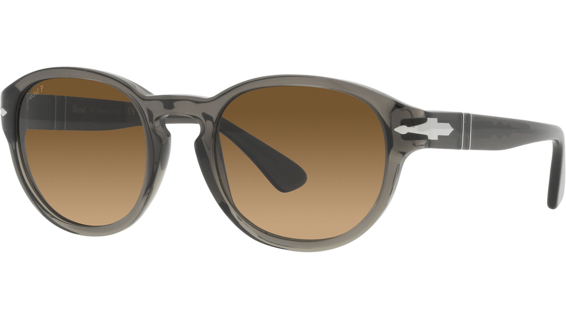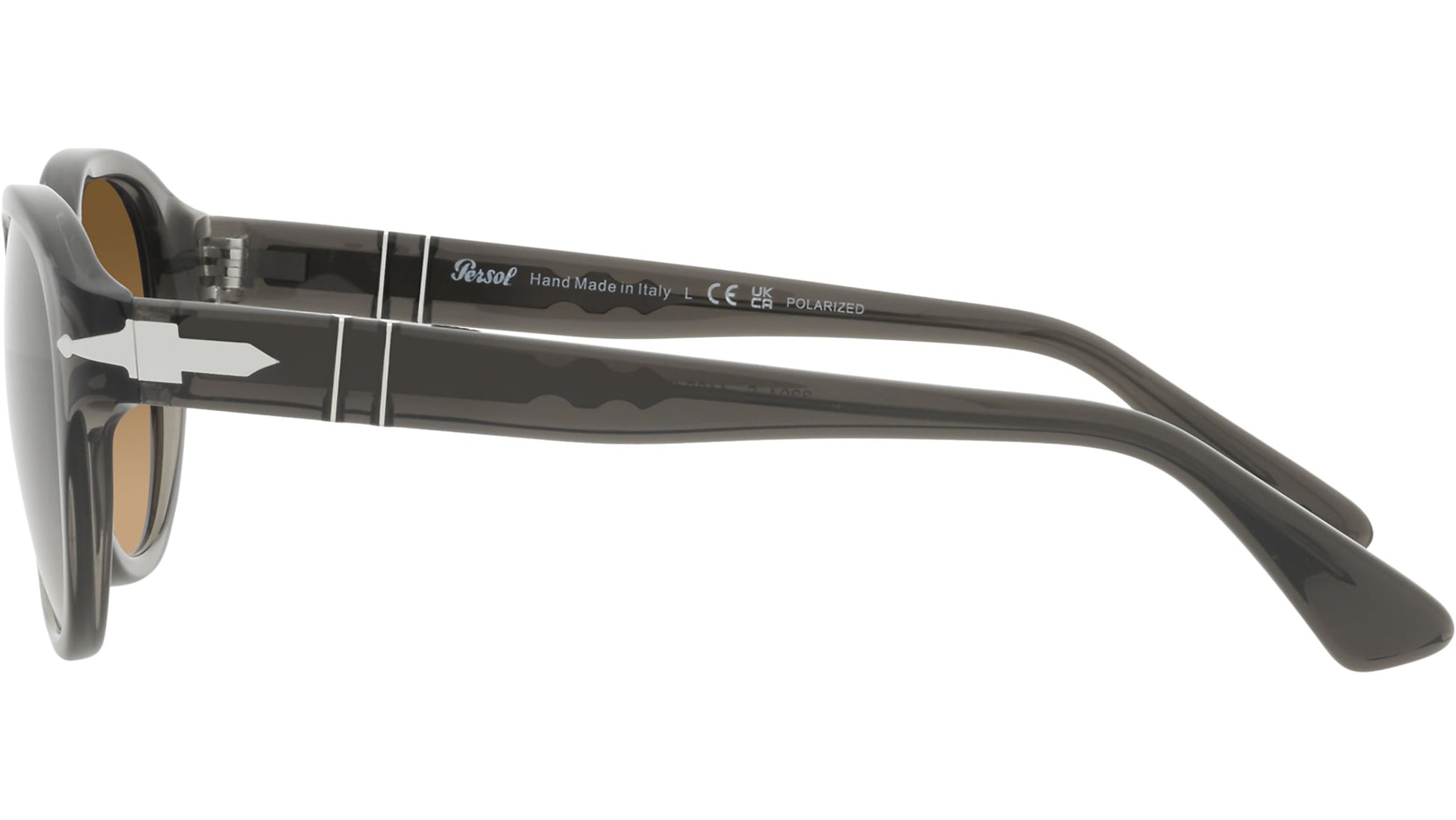 Persol sunglasses model PO3304S color code 1103M2 featuring grey taupe transparent full rim acetate frame and glass marrone polarizzate lenses. Meticulous attention to every intricate detail ensures distinct styles and practical solutions. Driven by an unwavering passion for skill refinement and an unrelenting pursuit of innovation, Persol embodies true quality. Embodying its evocative name, which signifies “for sun” this brand stands as a testament to a rich heritage of superior craftsmanship and excellence. Persol seamlessly blends aesthetics and technology, representing the epitome of handcrafted Italian manufacturing. Renowned for its timeless design and artistry, the brand has become a beloved choice within the realm of cinema.