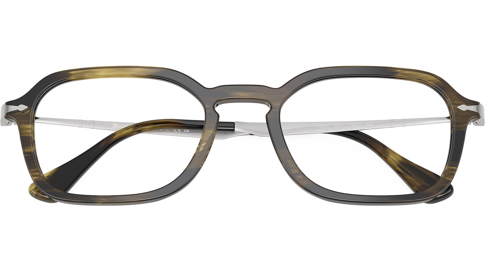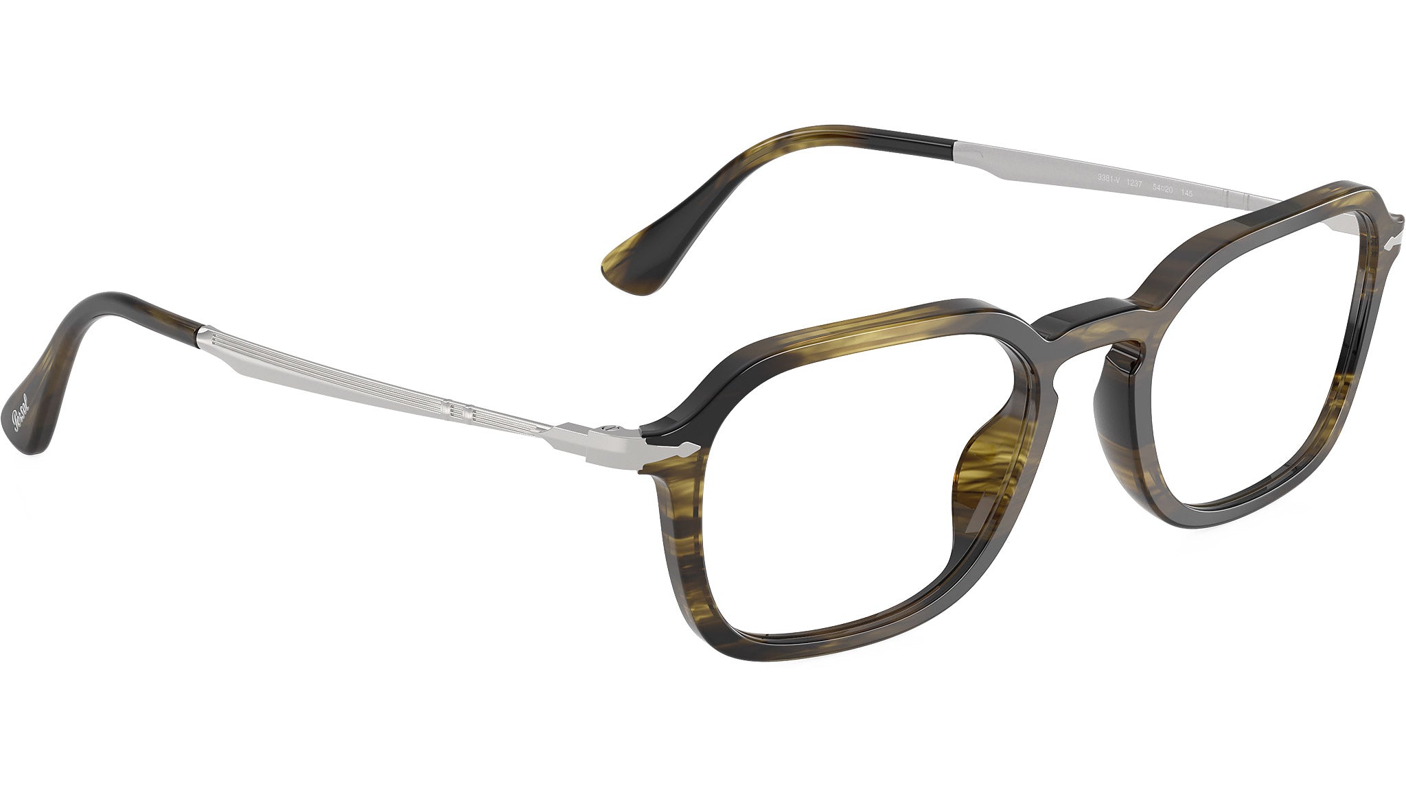 Persol glasses for men and woman model PO3381V 1237 featuring striped black & olive green acetate frame and demo lenses. High bridge fit. Frame line: Galleria. Brand code: 0PO3381V. Color code: 1237. Authorised Persol Eyewear Online Reseller. Your glasses will come including the original case and accessories and will be covered by 12 month global warranty.