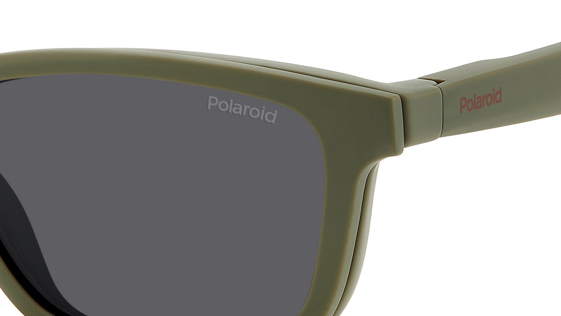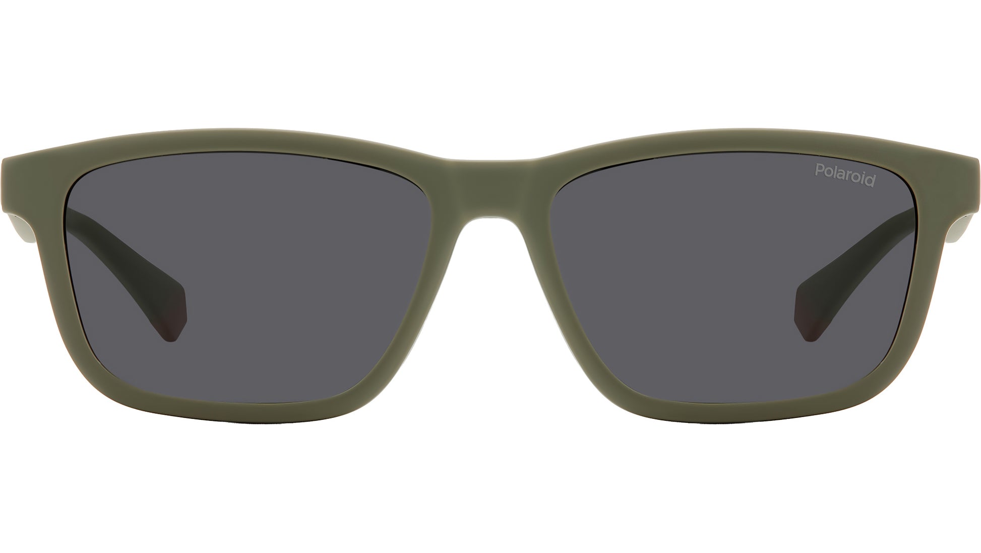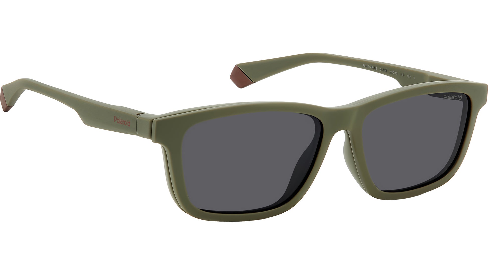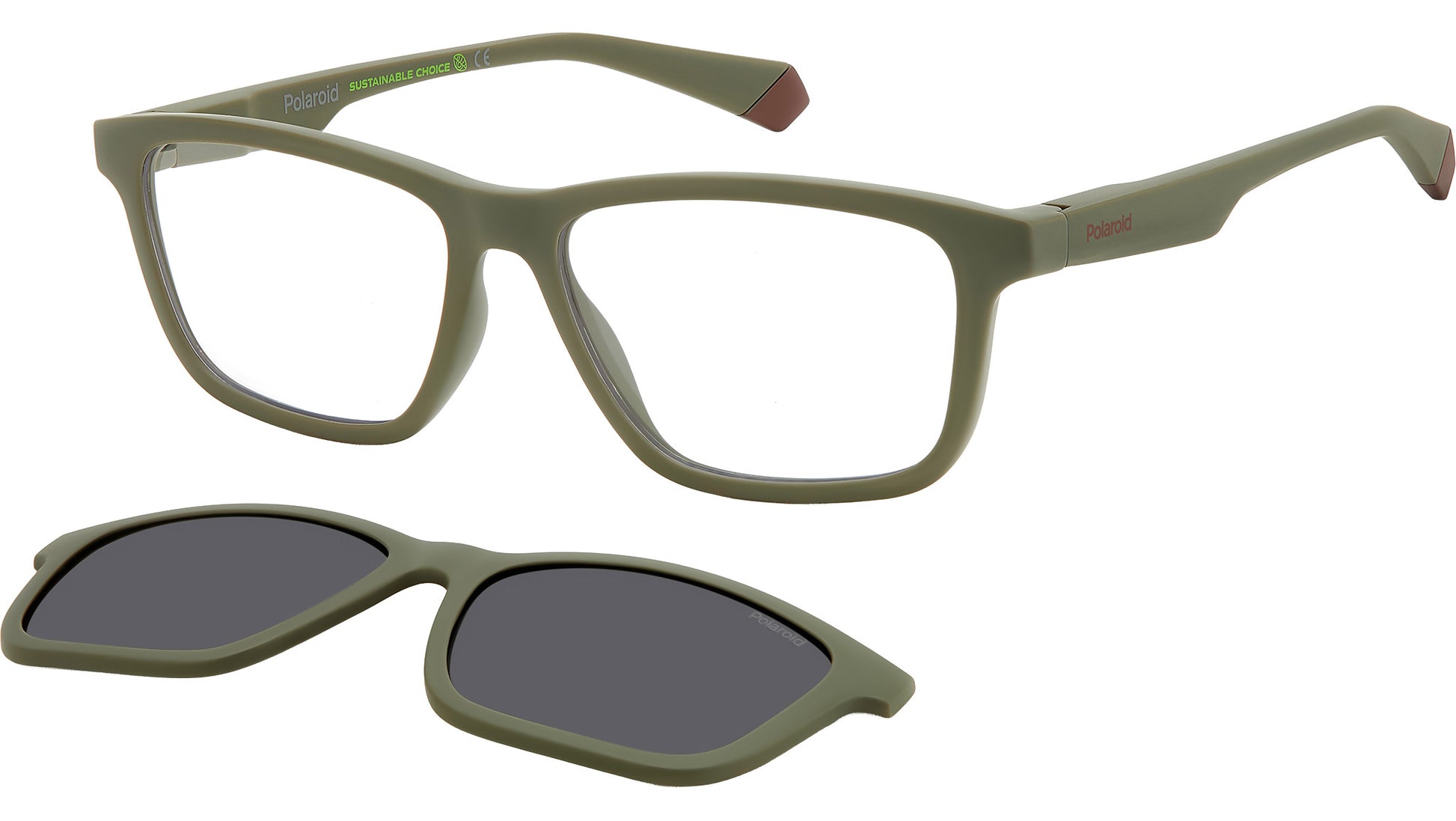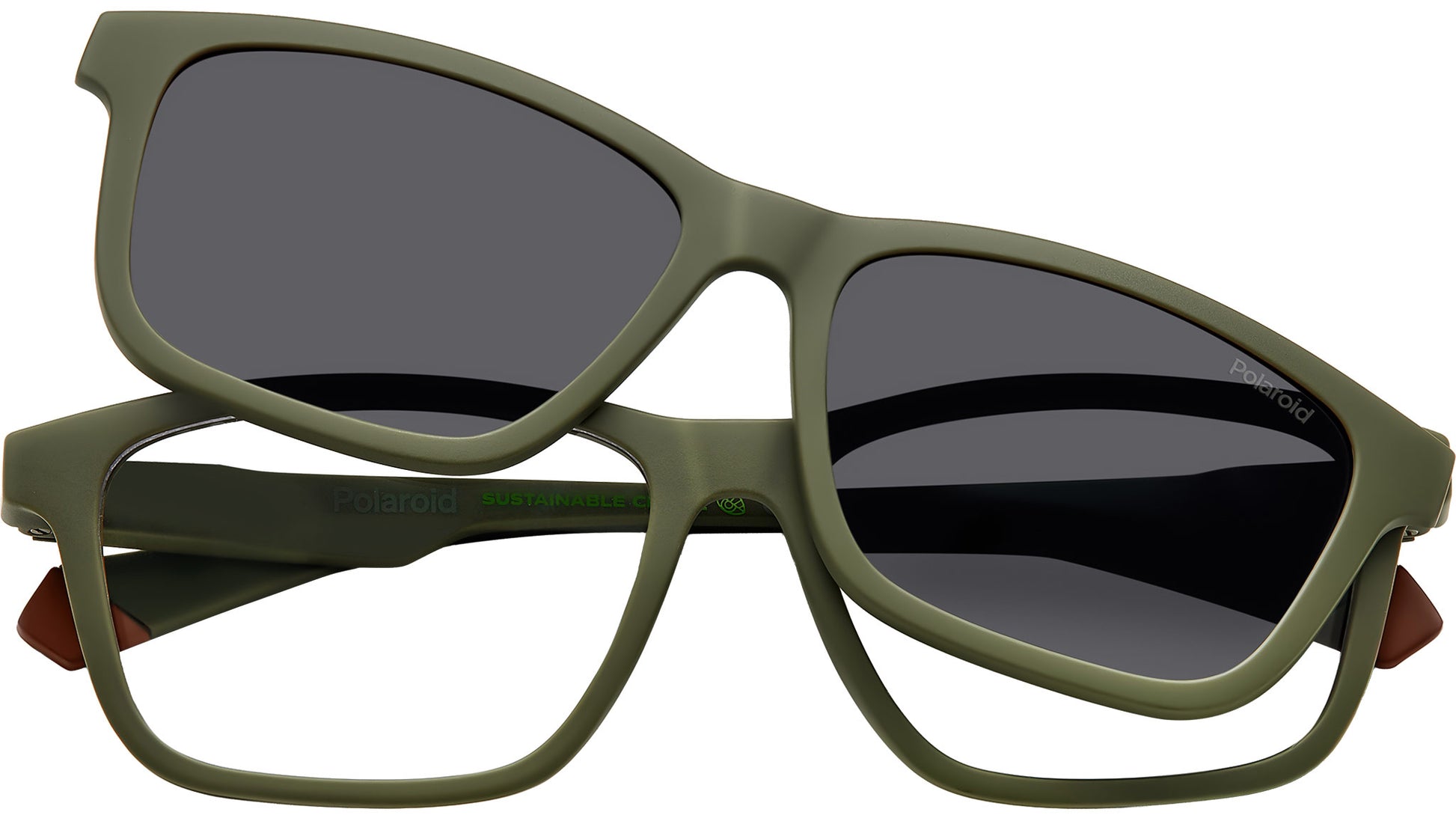 Polaroid PLD 2147/CS DLD M9 sunglasses for men and women, featuring matte green rectangular eco polyamide frame and grey polarized lenses. These Polaroid eyeglasses transform in a snap thanks to their matching clip-on sun lenses. They’re made to be worn from morning to evening, while the eco-polyamide construction echoes the brand’s commitment to sustainable fashion. Juxtaposed colours make them distinct: the matching hue of the Polaroid logo and the end tips stands out on the matt finish structure. Brand line: Active. Style code: 205721. Color code: DLD M9. Authorized Polaroid online reseller. Your glasses will include the original case and accessories and are covered by a 12-month global warranty.