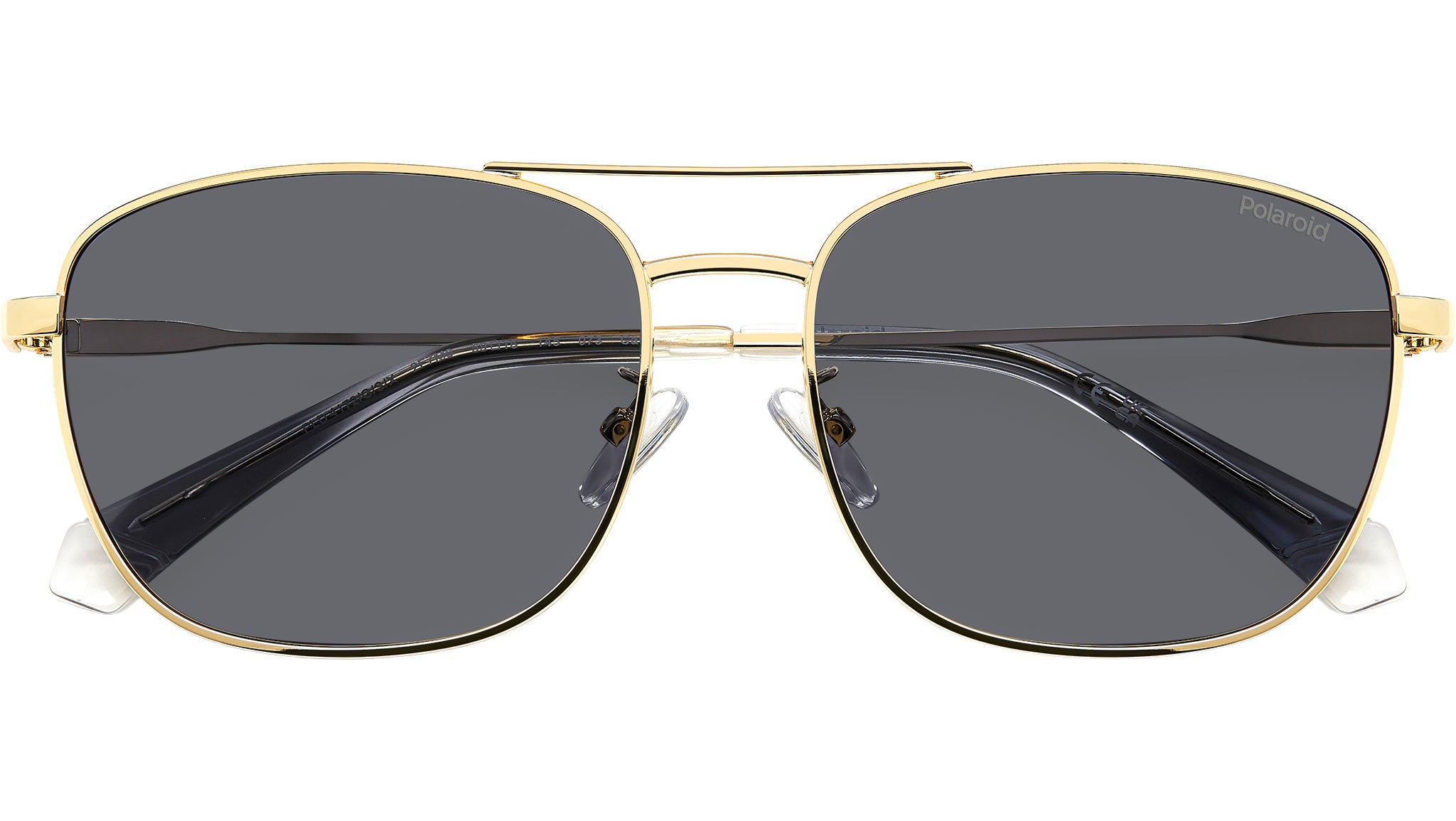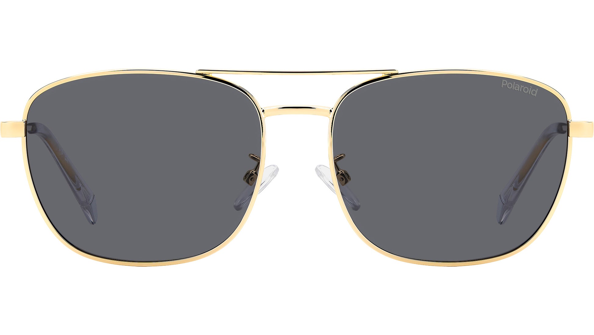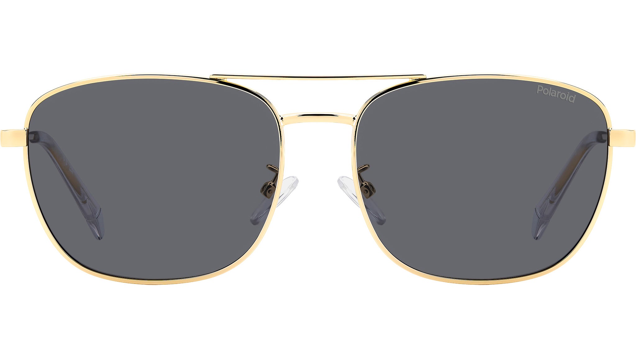 Polaroid PLD 4172/G/S/X 2F7 M9 sunglasses for men, featuring gold grey squared metal frame and grey polarized lenses. Polaroid sunglasses for demanding men who want to elevate their style. The vintage vibe comes from the lightweight stainless steel frames, connected by a double bridge and resting on nose pads. Polaroid always includes a pop touch, in this case it's the colourful line and laser-engraved logo on the temples. The rims can hold prescription lenses, and the Global Fit of this style adapts to all nose shapes. Brand line: Essential. Style code: 206793. Color code: 2F7 M9. Authorized Polaroid online reseller. Your glasses will include the original case and accessories and are covered by a 12-month global warranty.