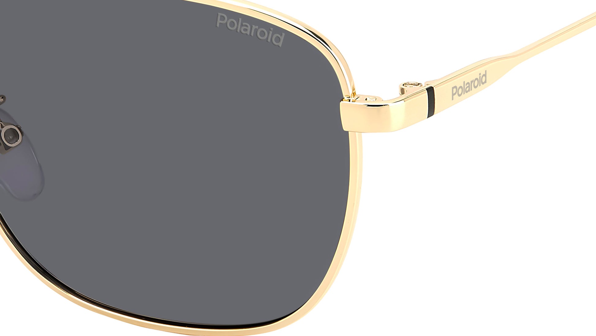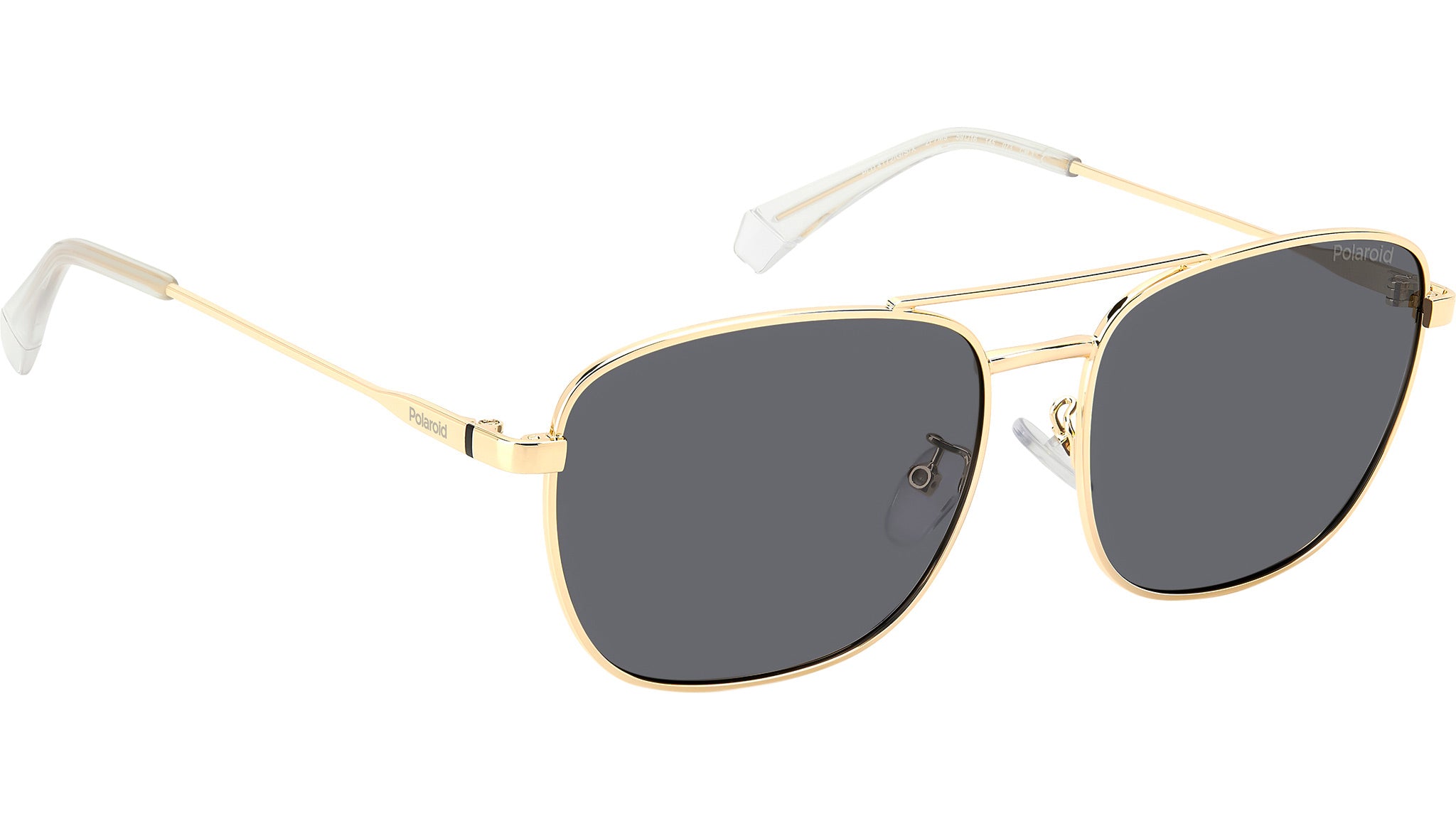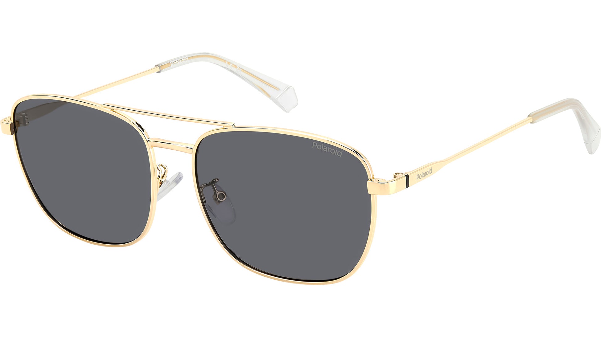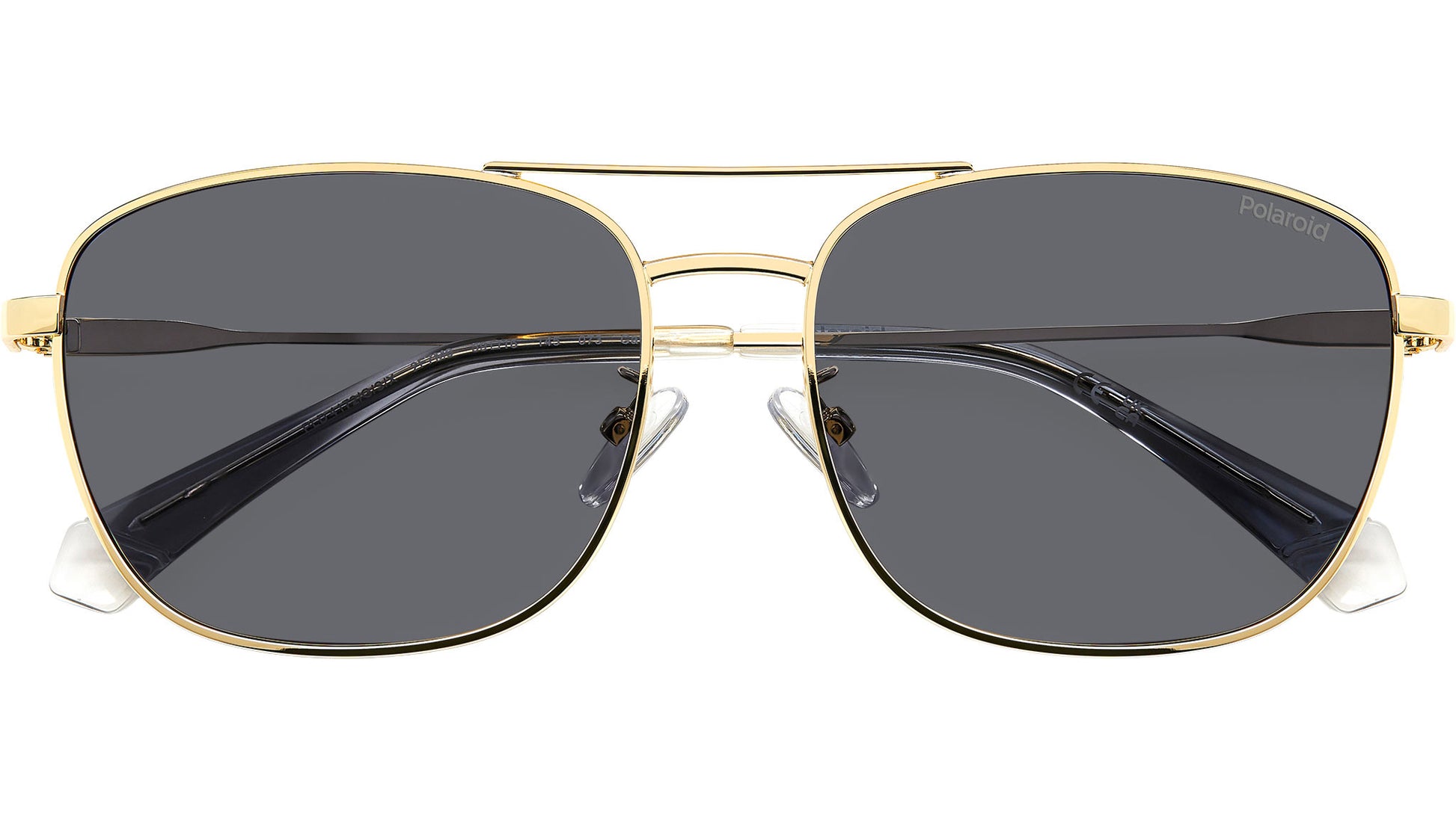 Polaroid PLD 4172/G/S/X 2F7 M9 sunglasses for men, featuring gold grey squared metal frame and grey polarized lenses. Polaroid sunglasses for demanding men who want to elevate their style. The vintage vibe comes from the lightweight stainless steel frames, connected by a double bridge and resting on nose pads. Polaroid always includes a pop touch, in this case it's the colourful line and laser-engraved logo on the temples. The rims can hold prescription lenses, and the Global Fit of this style adapts to all nose shapes. Brand line: Essential. Style code: 206793. Color code: 2F7 M9. Authorized Polaroid online reseller. Your glasses will include the original case and accessories and are covered by a 12-month global warranty.