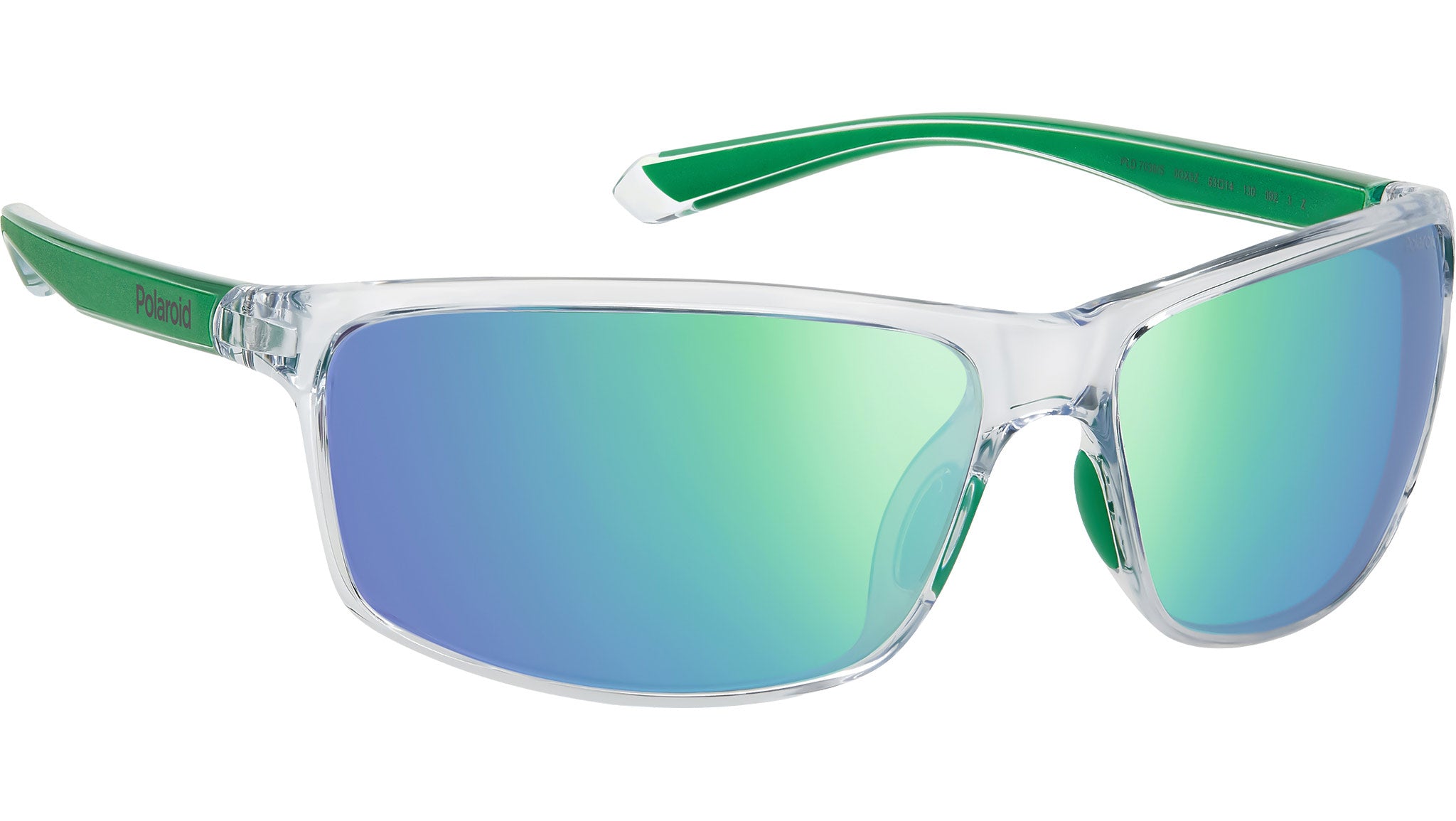 Polaroid PLD 7036/S 0OX 5Z sunglasses for men and women, featuring crystal green rectangular polycarbonate frame and greygreen mirror polarized lenses. Brand line: Active. Style code: 203921. Color code: 0OX 5Z. Authorized Polaroid online reseller. Your glasses will include the original case and accessories and are covered by a 12-month global warranty.