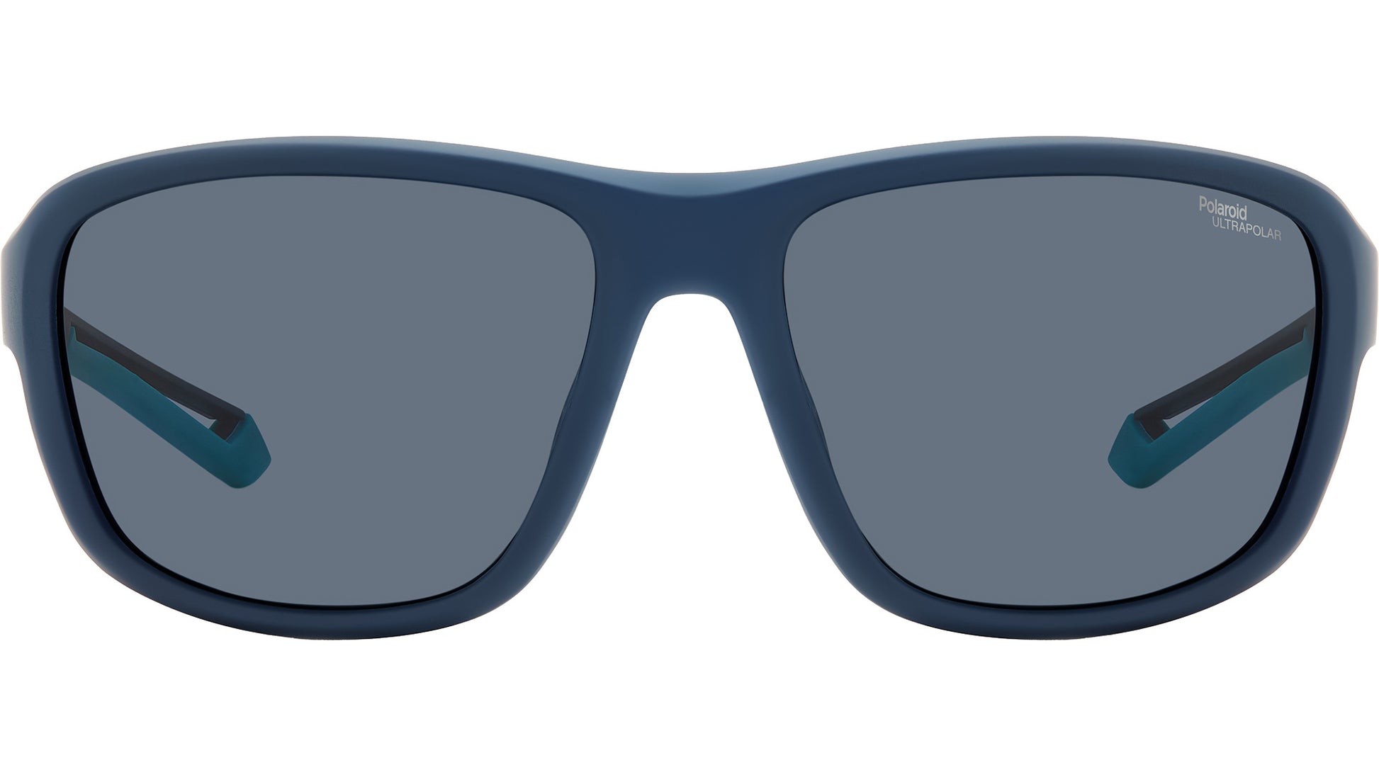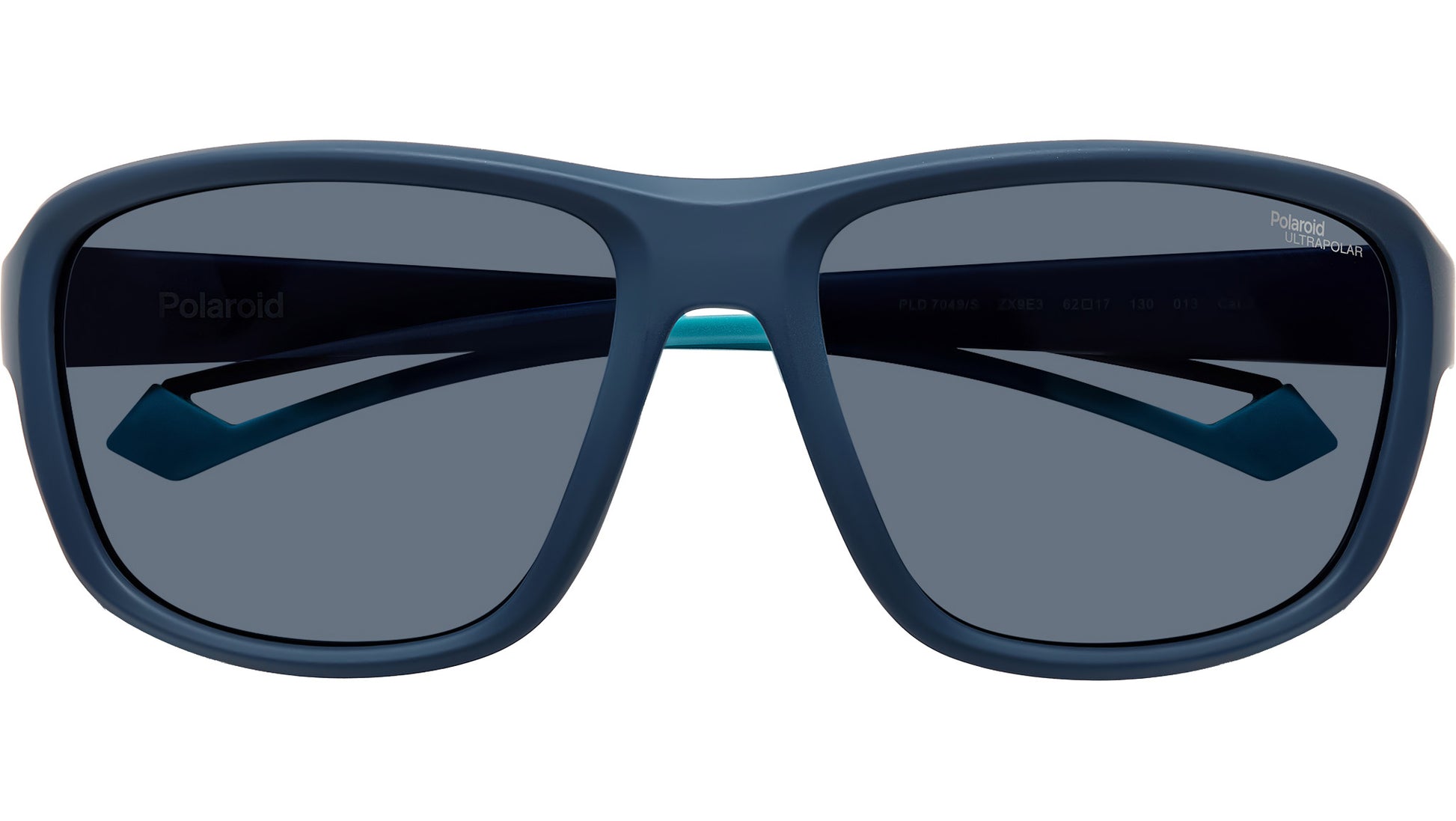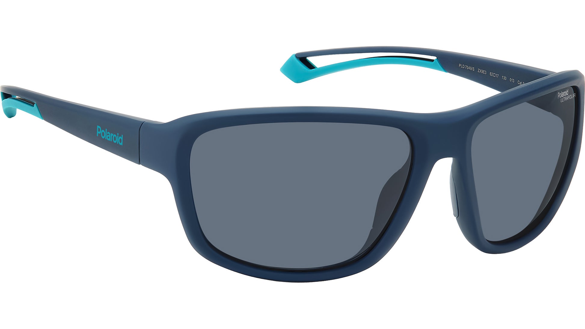 Polaroid PLD 7049/S ZX9 E3 sunglasses for men and women, featuring blue azure rectangular polycarbonate frame and grey polarized high contrast lenses. These unisex sunglasses are ideal for outdoor sports. Polaroid designed them with a wrap-around polycarbonate frame featuring temples with air ducts and a coloured logo to match the tips. The front has rubber nose pads for excellent grip and Ultrapolar lenses, protecting the eyes from UV light and ensuring high-definition vision with sharper colours thanks to High Contrast technology. Brand line: Active. Style code: 205728. Color code: ZX9 E3. Authorized Polaroid online reseller. Your glasses will include the original case and accessories and are covered by a 12-month global warranty.