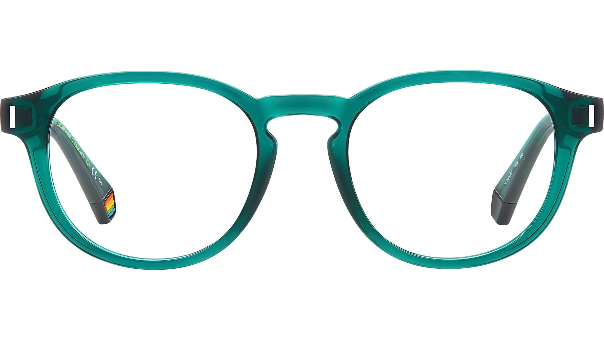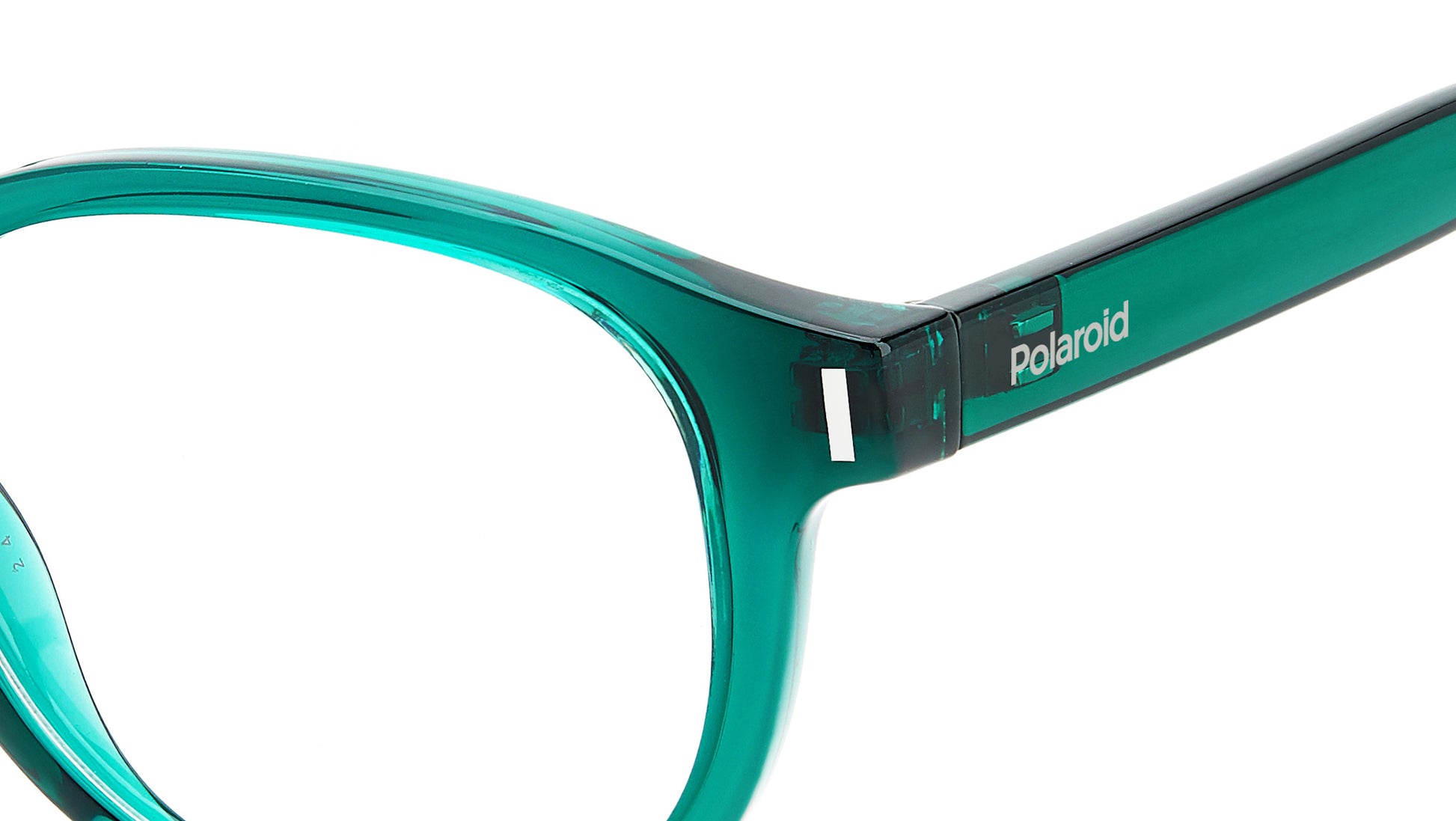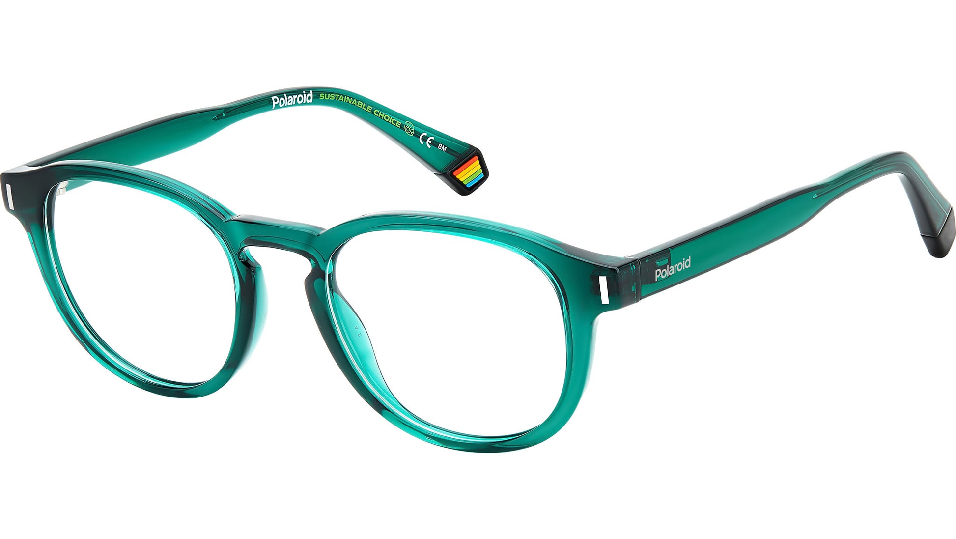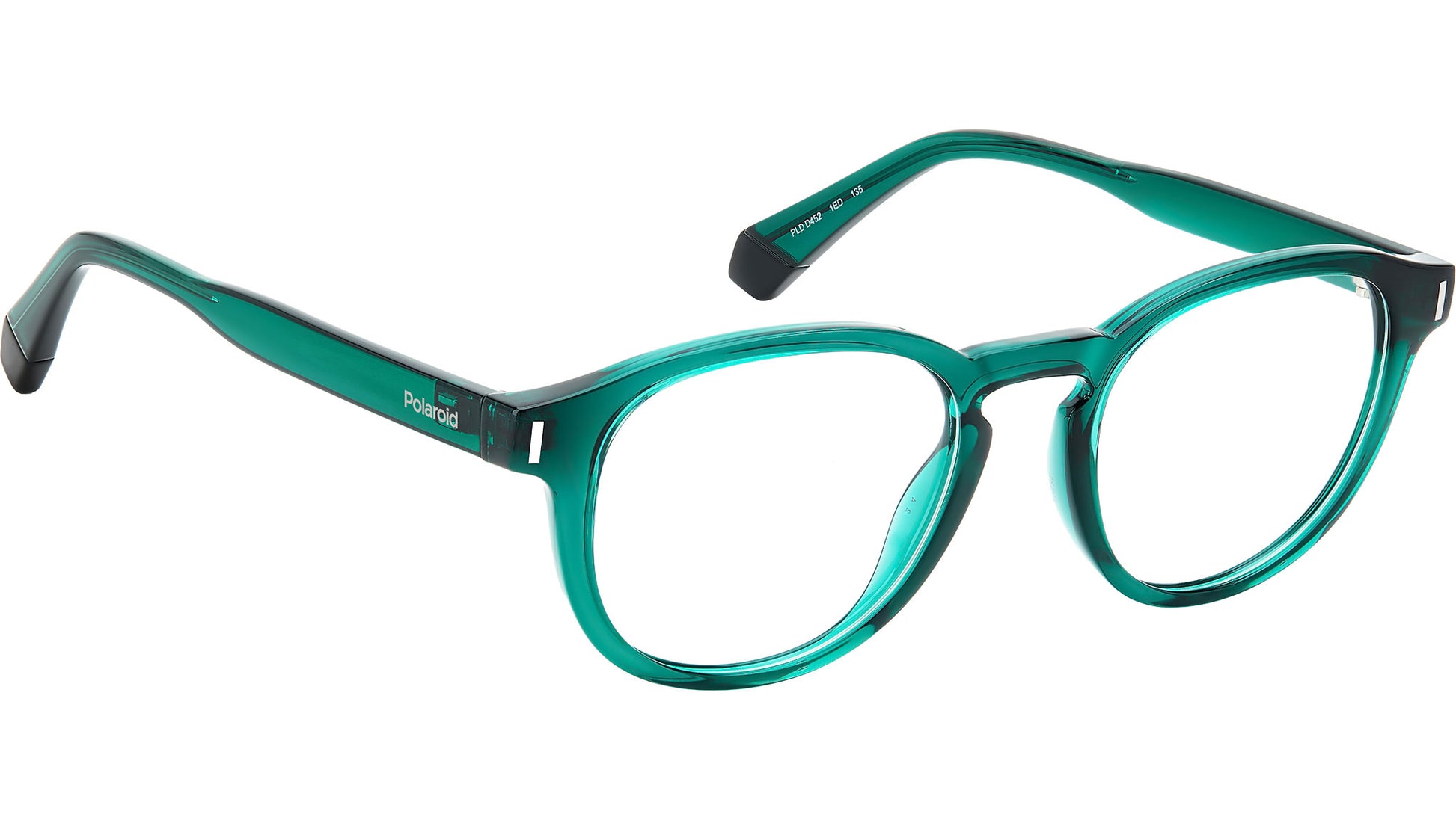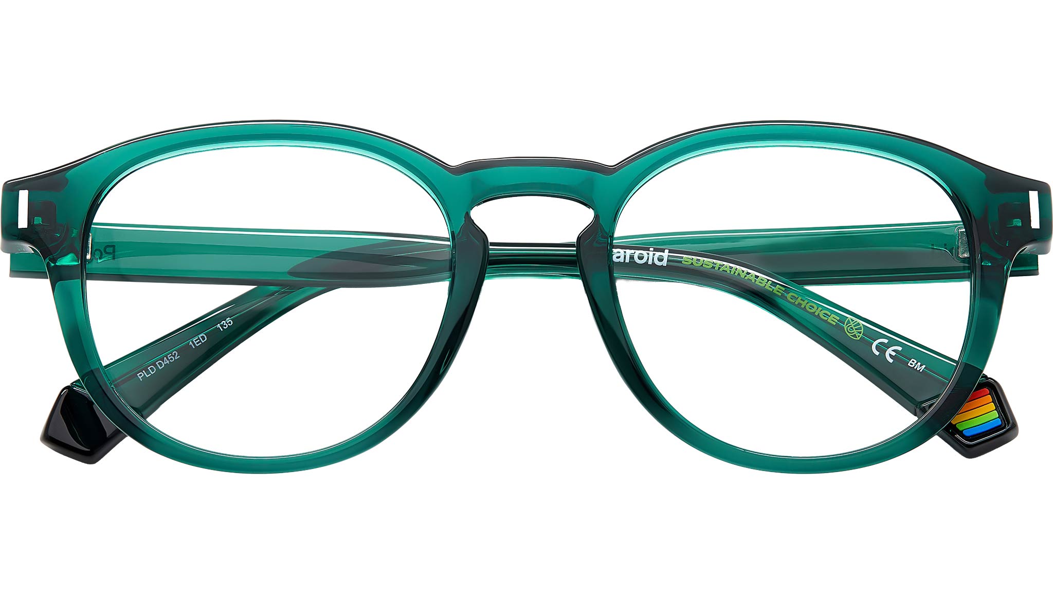 Polaroid PLD D452 1ED glasses for men and women, featuring green rectangular eco polyamide frame and demo lens lenses. For these eyeglasses, Polaroid has made a sustainable choice: the use of eco-polyamide, a type of plastic that derives from natural materials. Original elements trim this unisex accessory, including the unique temples that taper around the ears, Polaroid's iconic rainbow rubber insert on the end tips, and metal rivets on the oval frames. Brand line: Cool. Style code: 105812. Color code: 1ED. Authorized Polaroid online reseller. Your glasses will include the original case and accessories and are covered by a 12-month global warranty.