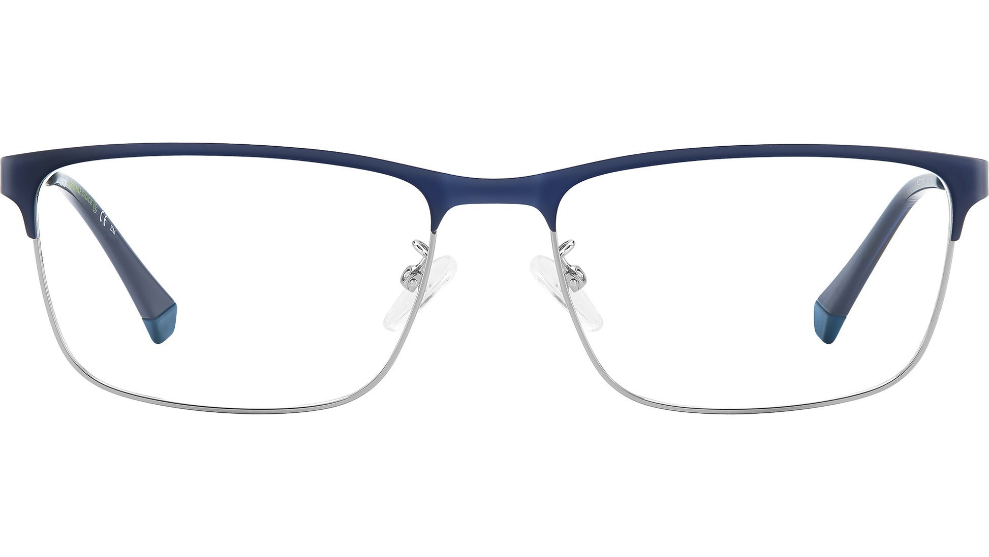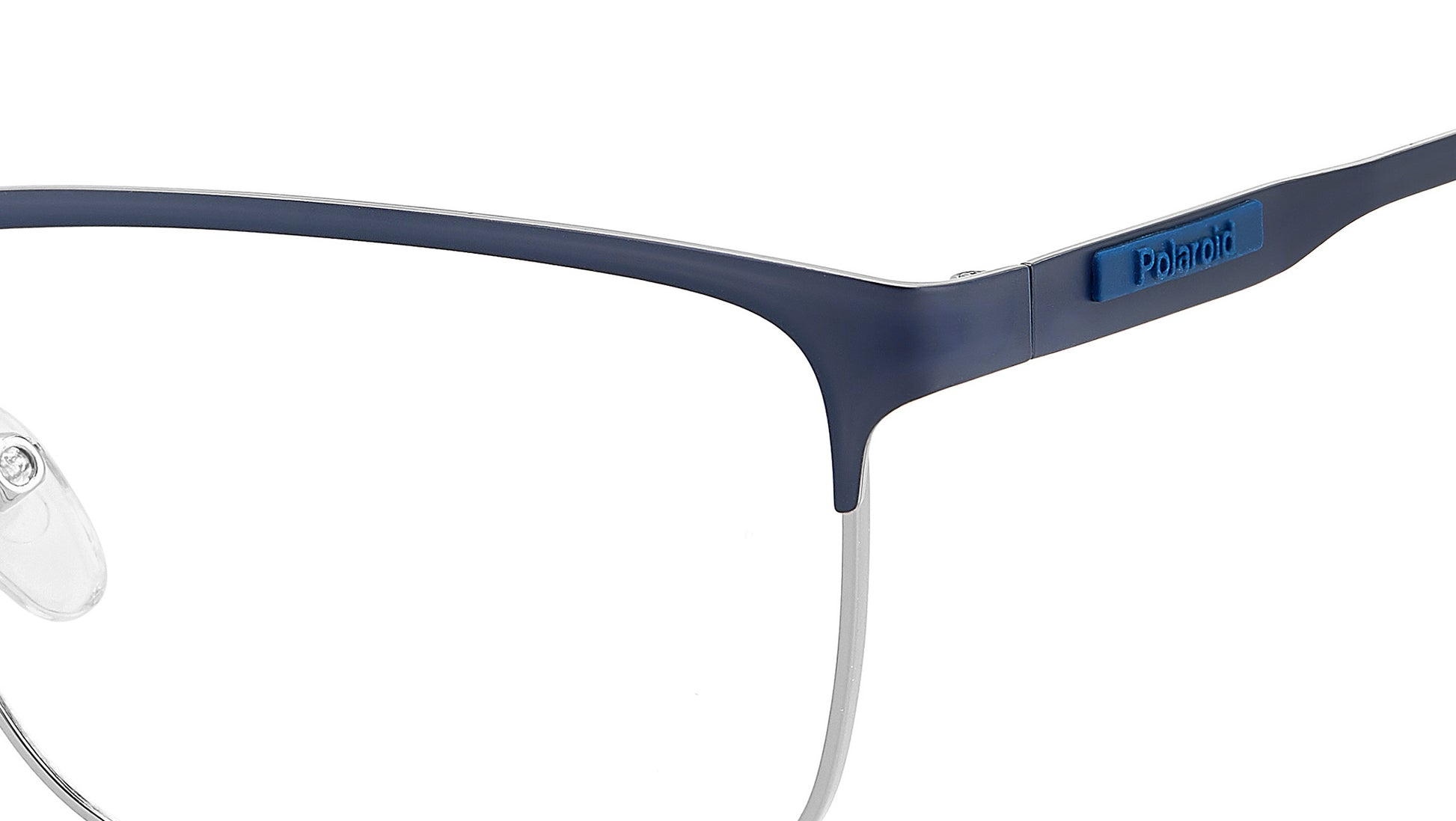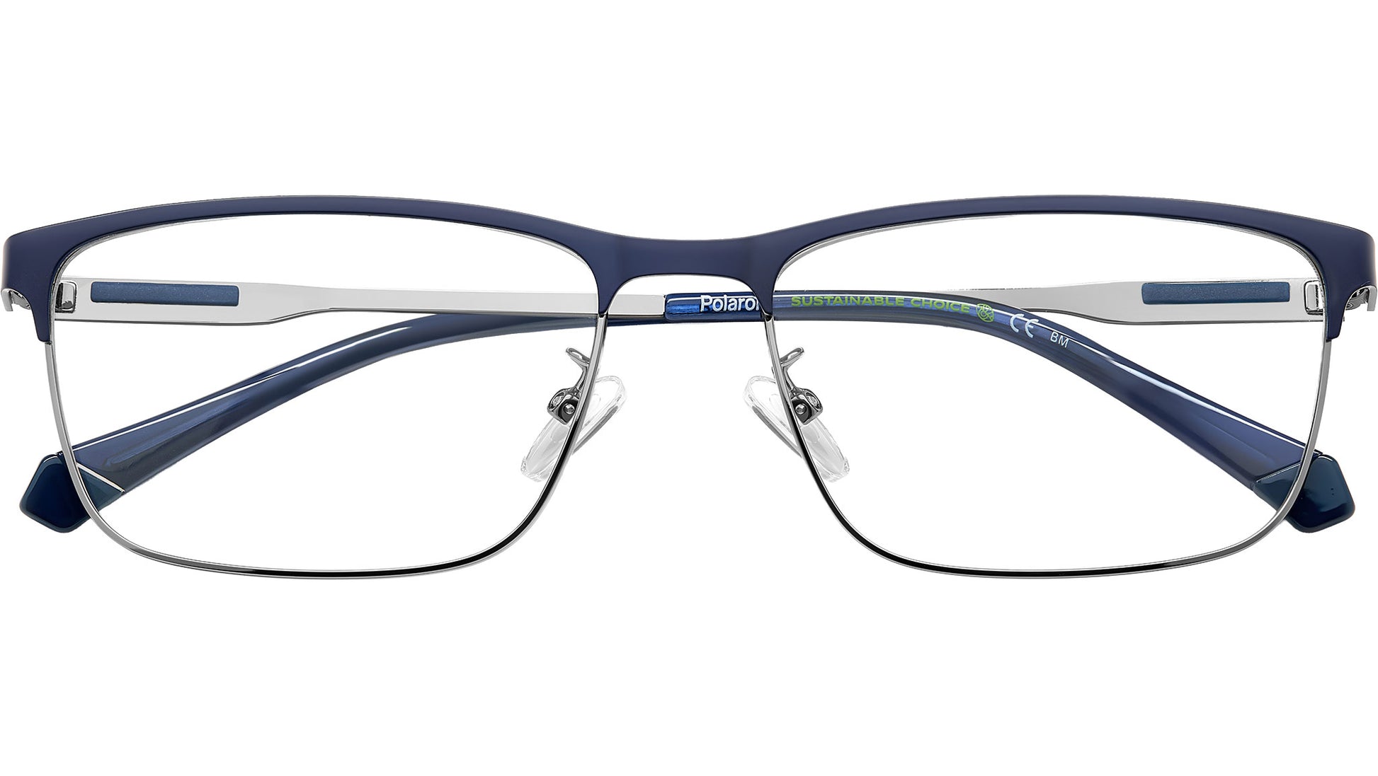 Polaroid PLD D495/G KU0 glasses for men, featuring matte blue ruthenium rectangular metal frame and demo lens lenses. A rectangular outline and colourful accents define the clean lines of these high-performing, masculine Polaroid optical glasses. Stainless steel construction and nose pads ensure they rest lightly yet stably on the face, while the two-tone palette makes them distinct. The rubber insert with the brand's logo stands out on the temple, adding interest with a contrast of colours and materials. Available in two frame sizes. Brand line: Active. Style code: 106898. Color code: KU0. Authorized Polaroid online reseller. Your glasses will include the original case and accessories and are covered by a 12-month global warranty.