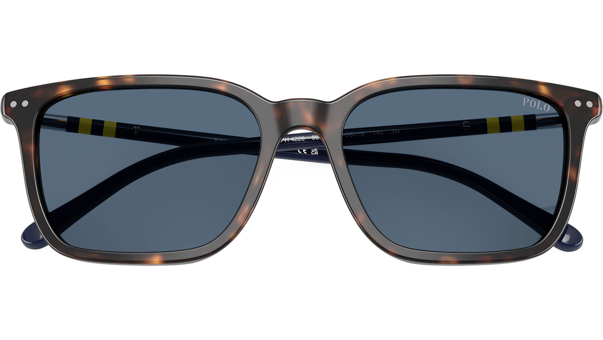 Polo PH4226 500380 sunglasses, featuring shiny havana d-frame acetate frame and dark blue bio polyamide lenses. High bridge fit. Brand line: Core Aspirational. Style code: 0PH4226. Color code: 500380. Authorized Polo online reseller. Your glasses will include the original case and accessories and are covered by a 12-month global warranty.