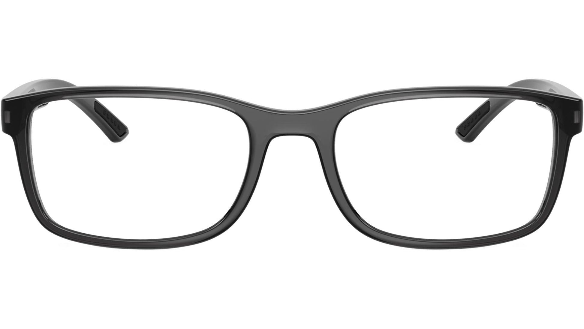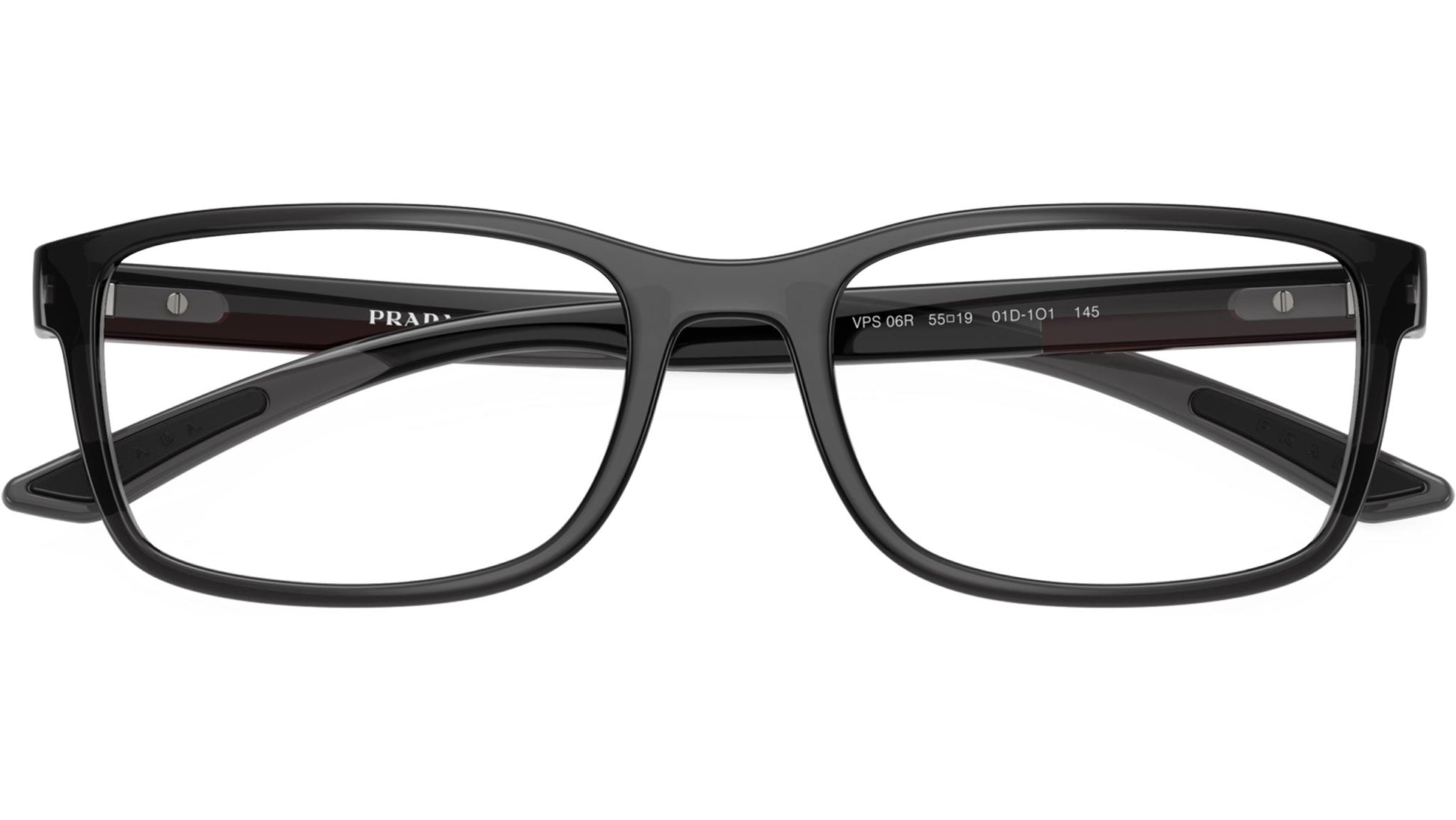Prada Linea Rossa PS 06RV 01D1O1 glasses for men, featuring transparent grey d-frame injection frame and demo lenses. High bridge fit. Brand line: Lifestyle. Style code: PS06RV. Color code: 01D1O1. Made in Italy. Authorized Prada Sport online reseller. Your glasses will include the original case and accessories and are covered by a 12-month global warranty.