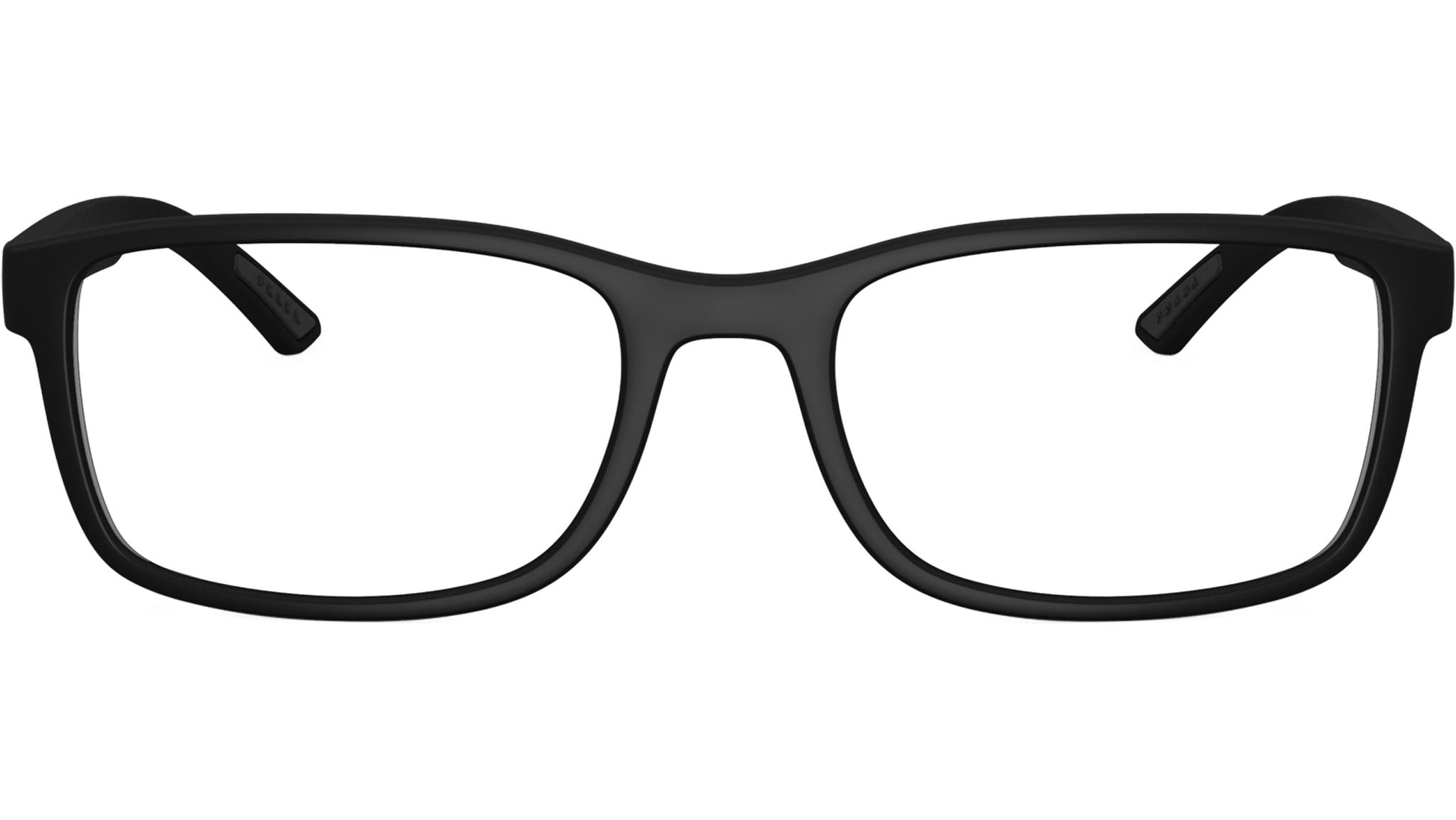 Prada Linea Rossa PS 06RV DG01O1 glasses for men, featuring black rubber d-frame injection frame and demo lenses. High bridge fit. Brand line: Lifestyle. Style code: PS06RV. Color code: DG01O1. Made in Italy. Authorized Prada Sport online reseller. Your glasses will include the original case and accessories and are covered by a 12-month global warranty.