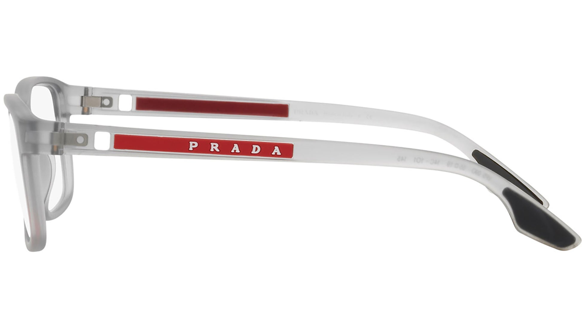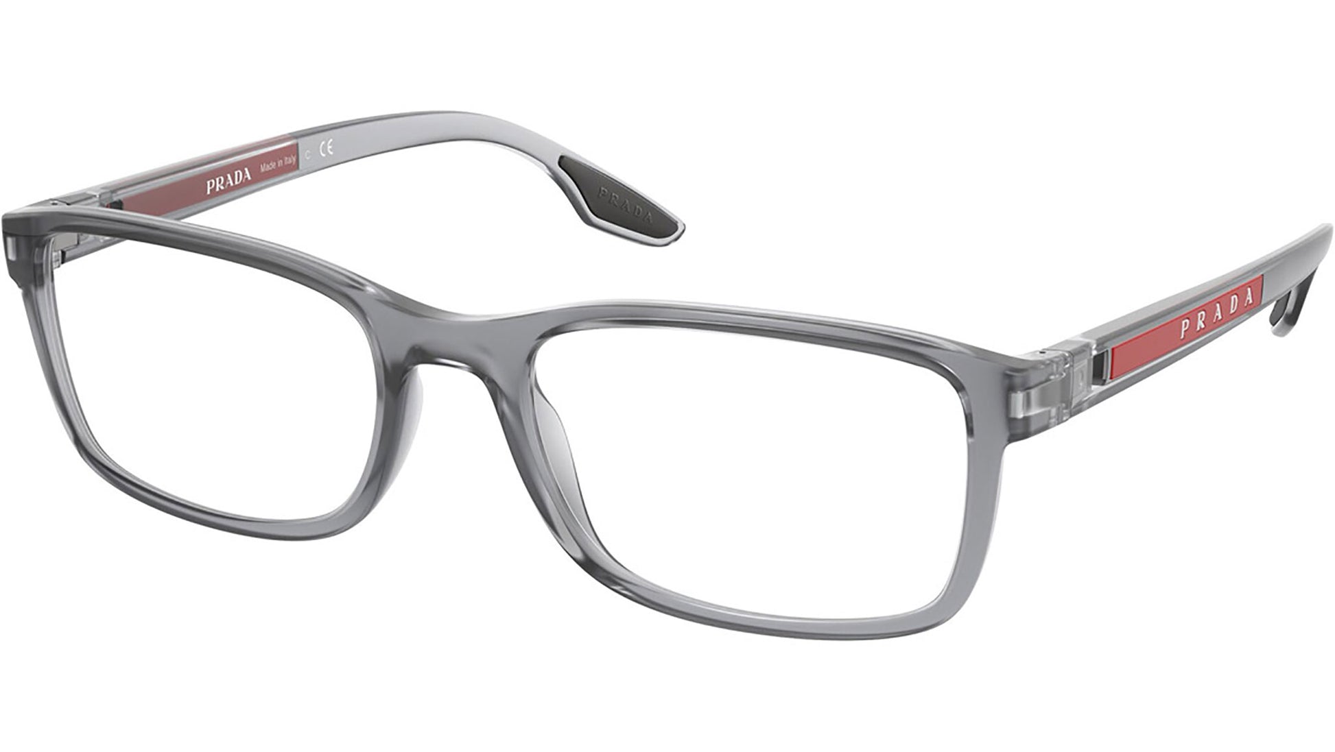 Prada Linea Rossa Eyewear Collection model PS 09OV grey transparent frame variant, color code 14C1O1. A new perspective, a fusion of sportswear and contemporary elegance: the Prada Linea Rossa Eyewear Collection conveys an everyday casual style with all the quality and craftsmanship of the Prada brand.