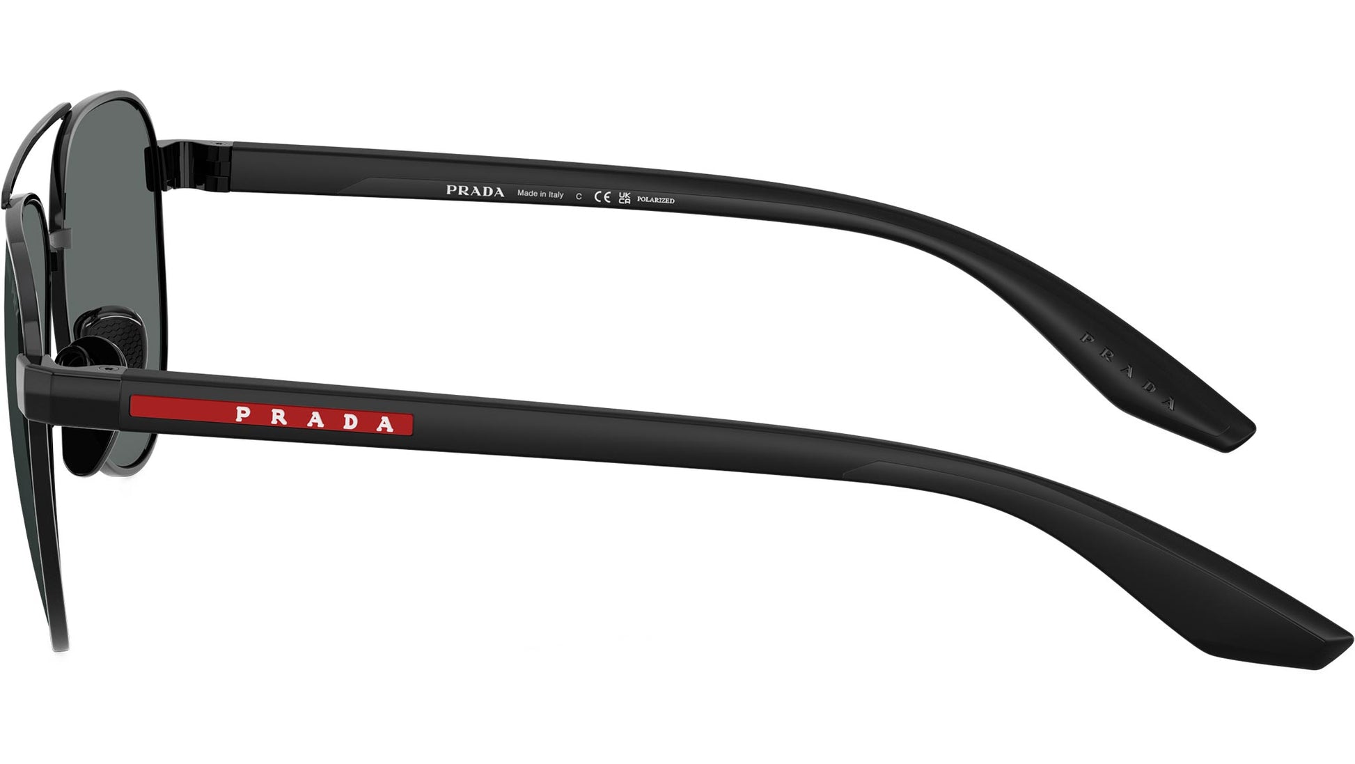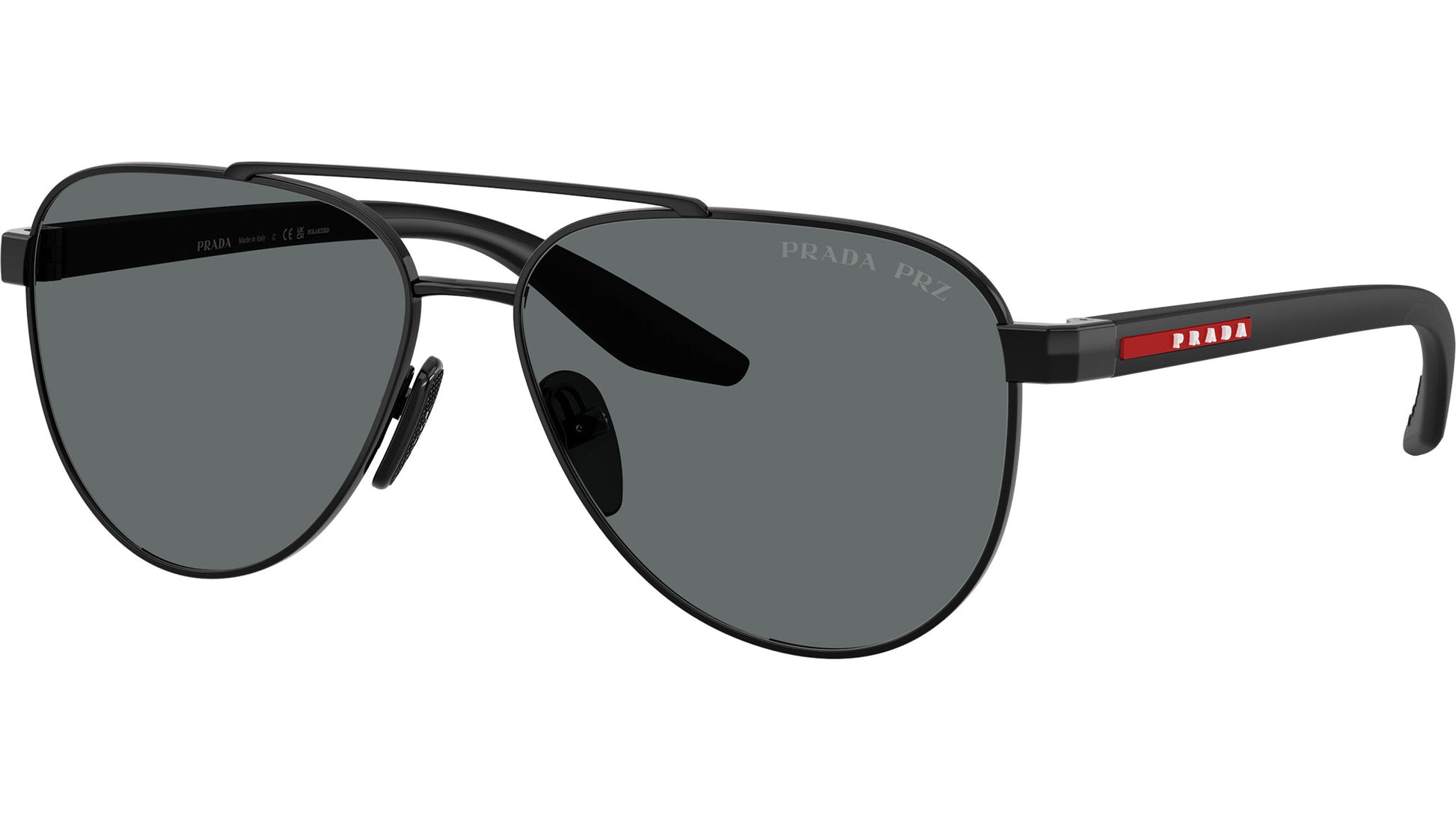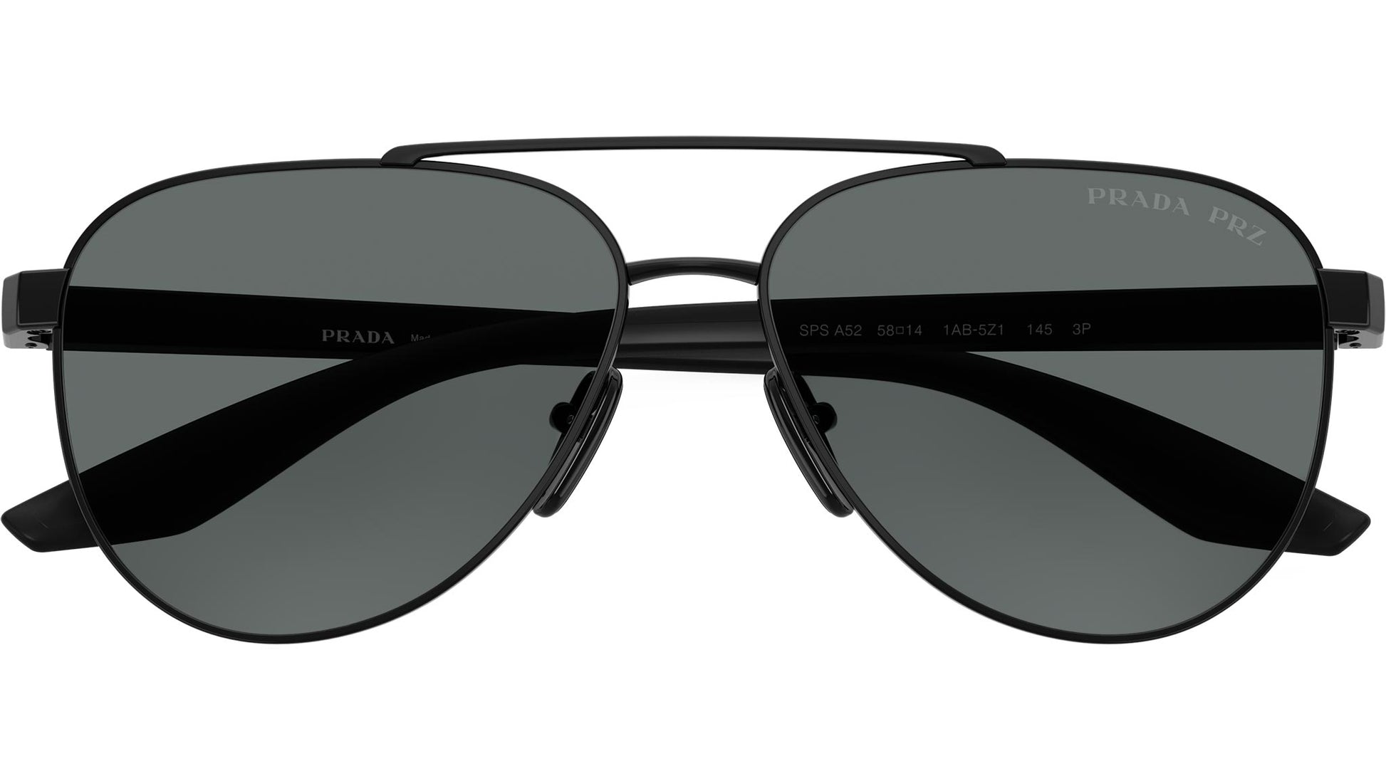 Prada Linea Rossa PS A52S 1AB5Z1 sunglasses for men, featuring black pilot metal frame and polar dark grey polycarbonate lenses. Universal fit. Brand line: Lifestyle. Style code: PSA52S. Color code: 1AB5Z1. Made in Italy. Authorized Prada Sport online reseller. Your glasses will include the original case and accessories and are covered by a 12-month global warranty.