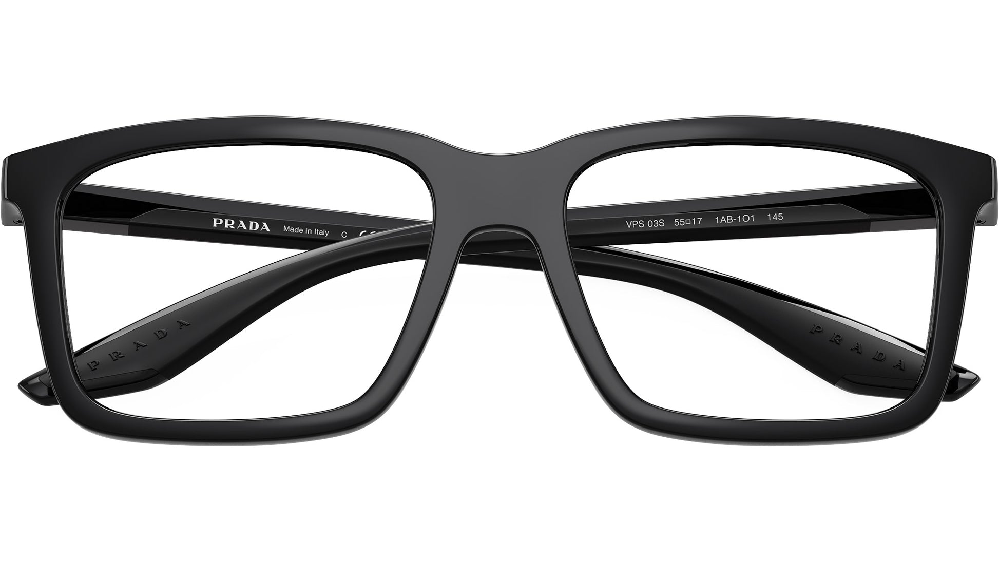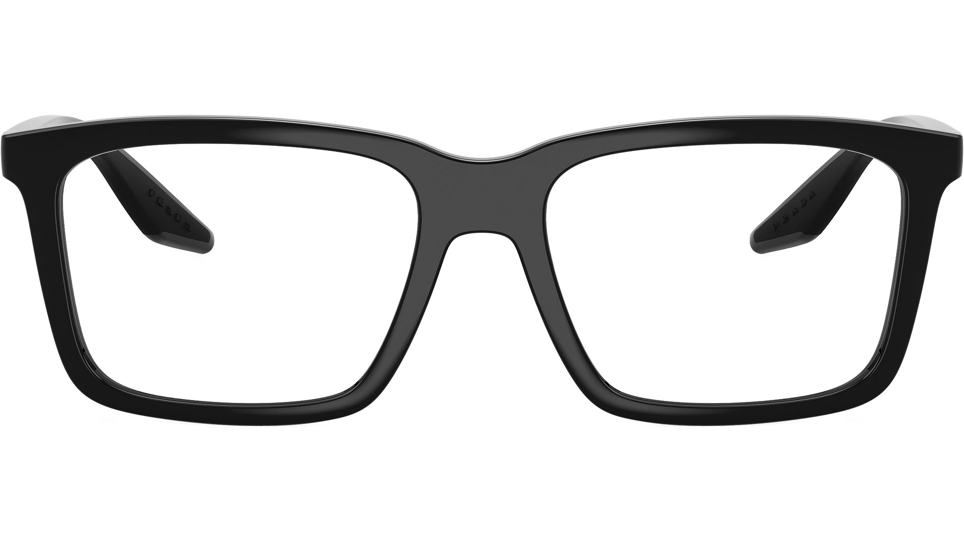 Prada Linea Rossa PS 03SV 1AB1O1 glasses for men, featuring black rectangular injection frame and demo lenses. High bridge fit. Brand line: Lifestyle. Style code: PS03SV. Color code: 1AB1O1. Made in Italy. Authorized Prada Sport online reseller. Your glasses will include the original case and accessories and are covered by a 12-month global warranty.