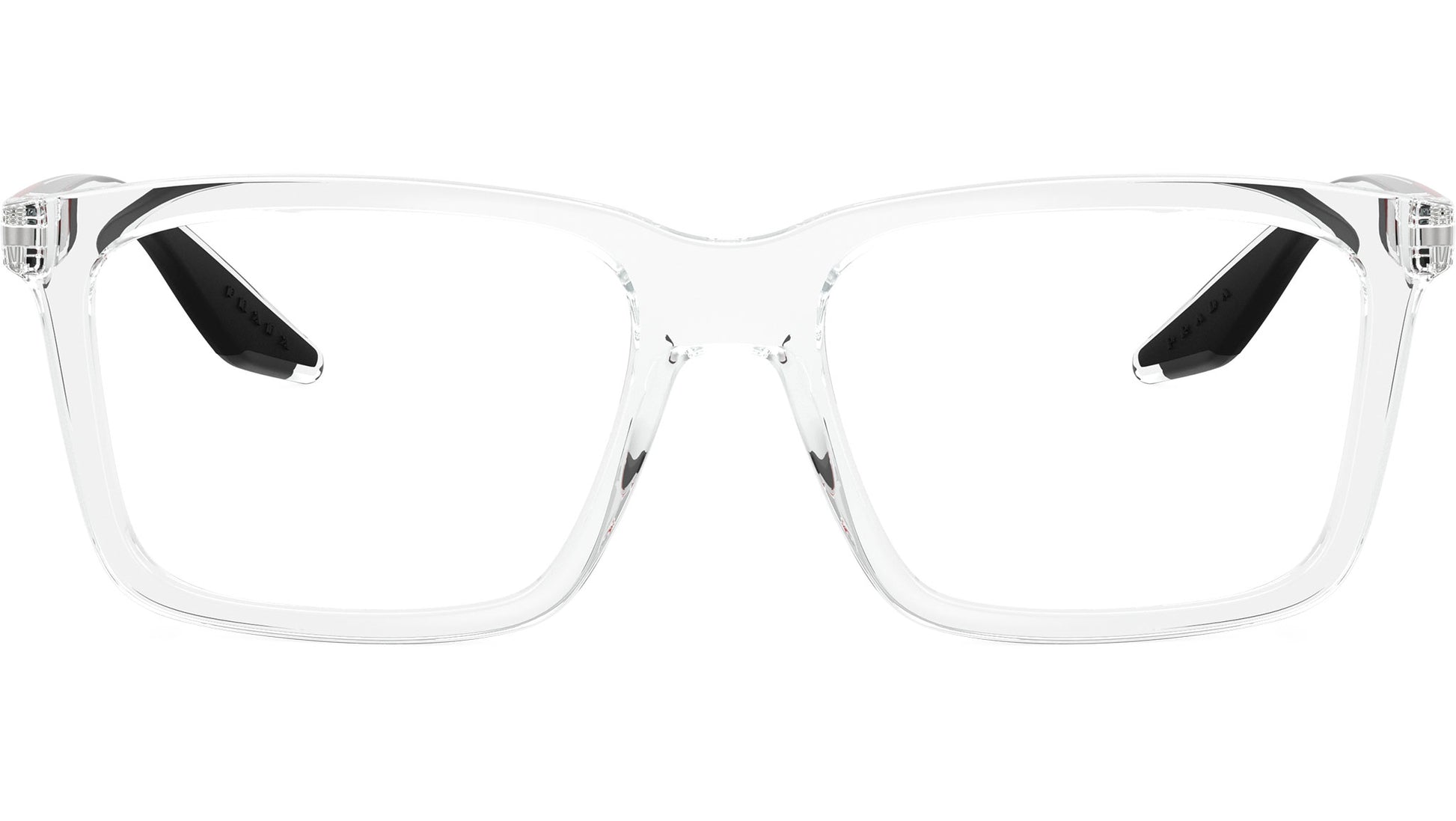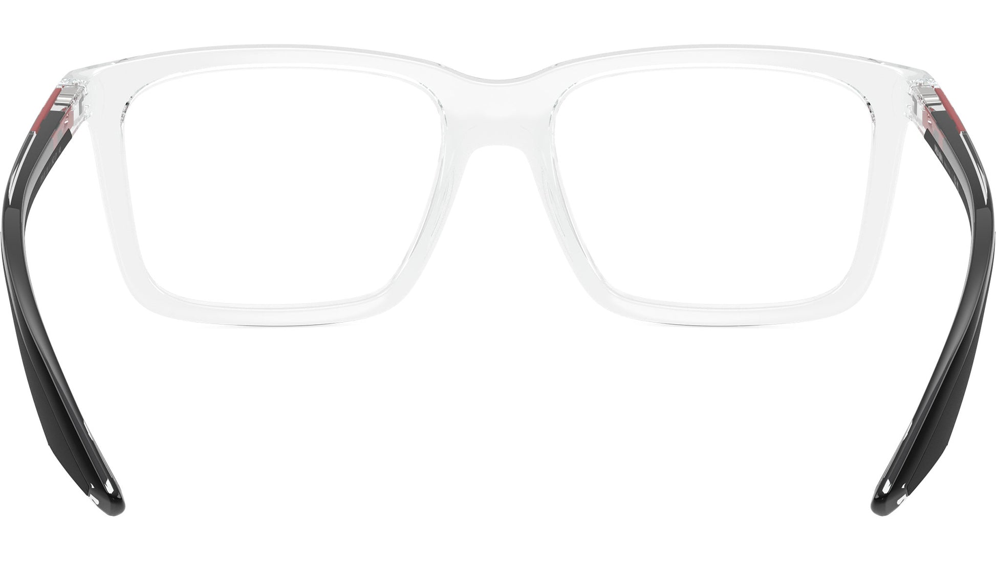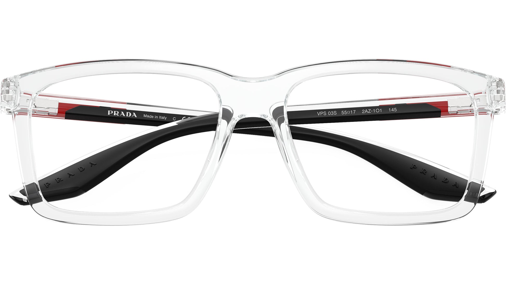 Prada Linea Rossa PS 03SV 2AZ1O1 glasses for men, featuring crystal rectangular injection frame and demo lenses. High bridge fit. Brand line: Lifestyle. Style code: PS03SV. Color code: 2AZ1O1. Made in Italy. Authorized Prada Sport online reseller. Your glasses will include the original case and accessories and are covered by a 12-month global warranty.