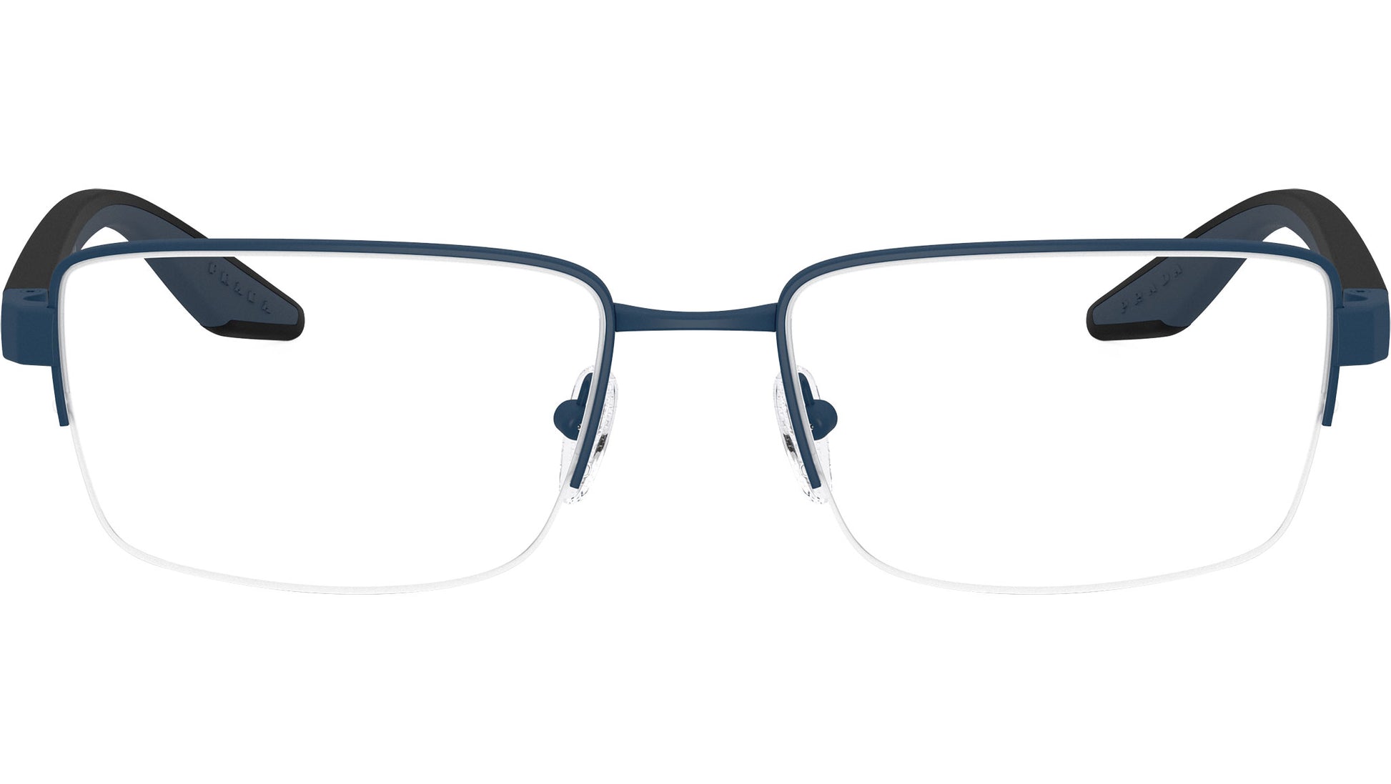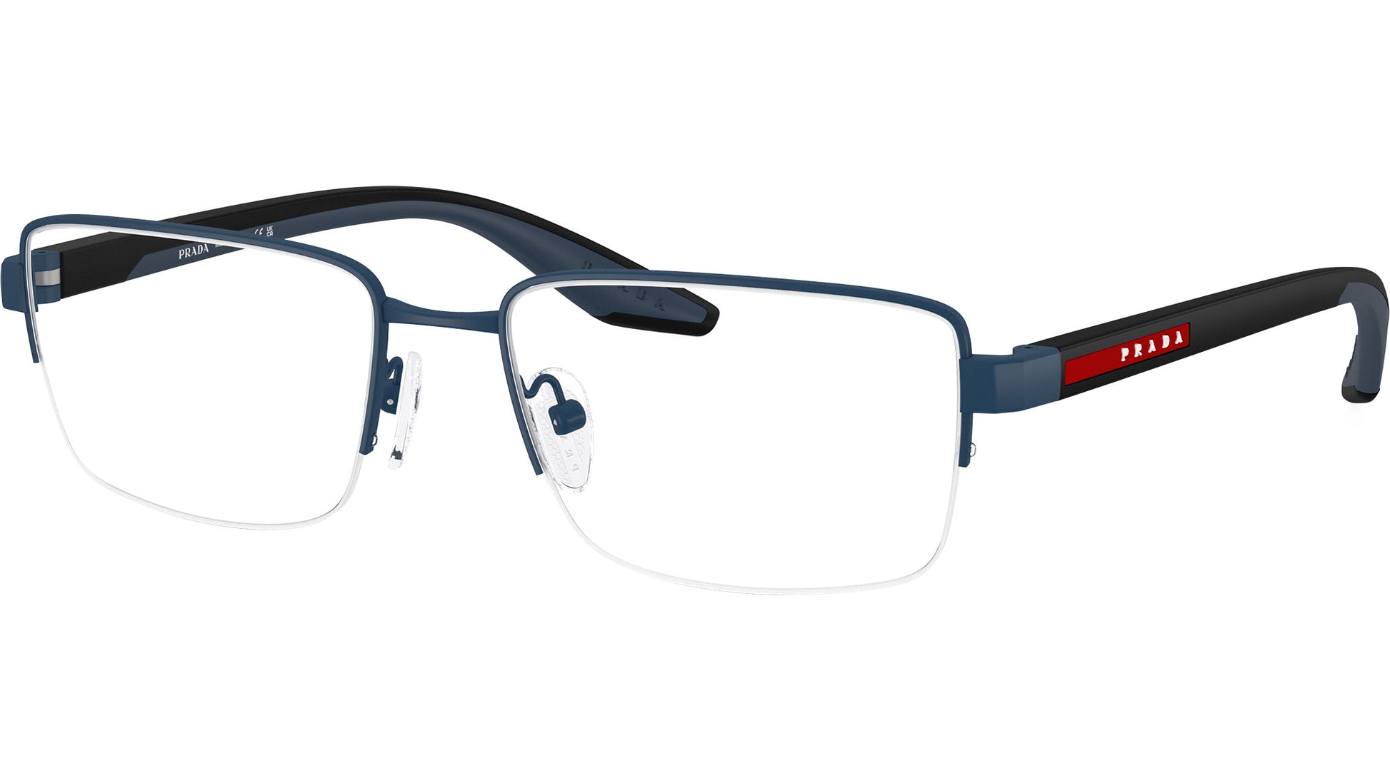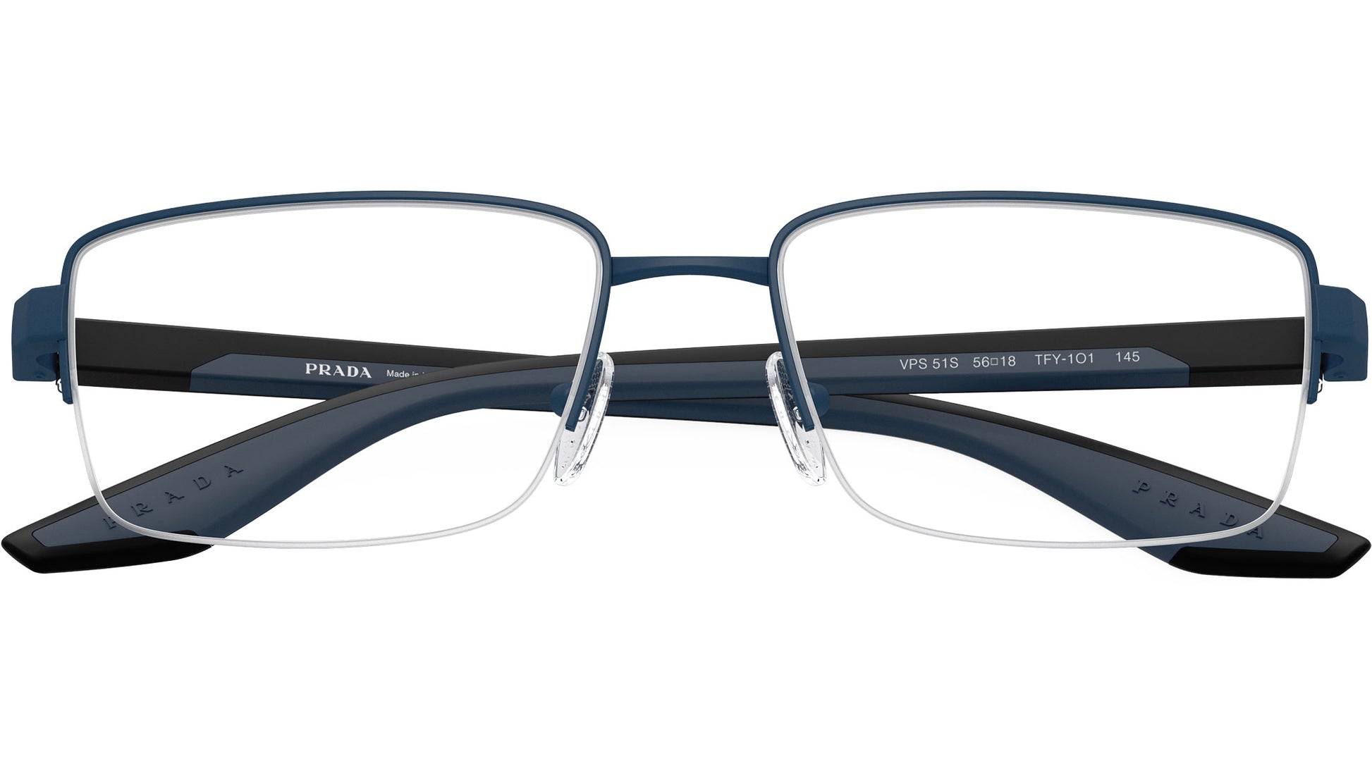 Prada Linea Rossa PS 51SV TFY1O1 glasses for men, featuring matte blue d-frame metal frame and demo lenses. Adjustable nosepads. Brand line: Lifestyle. Style code: PS51SV. Color code: TFY1O1. Made in Italy. Authorized Prada Sport online reseller. Your glasses will include the original case and accessories and are covered by a 12-month global warranty.