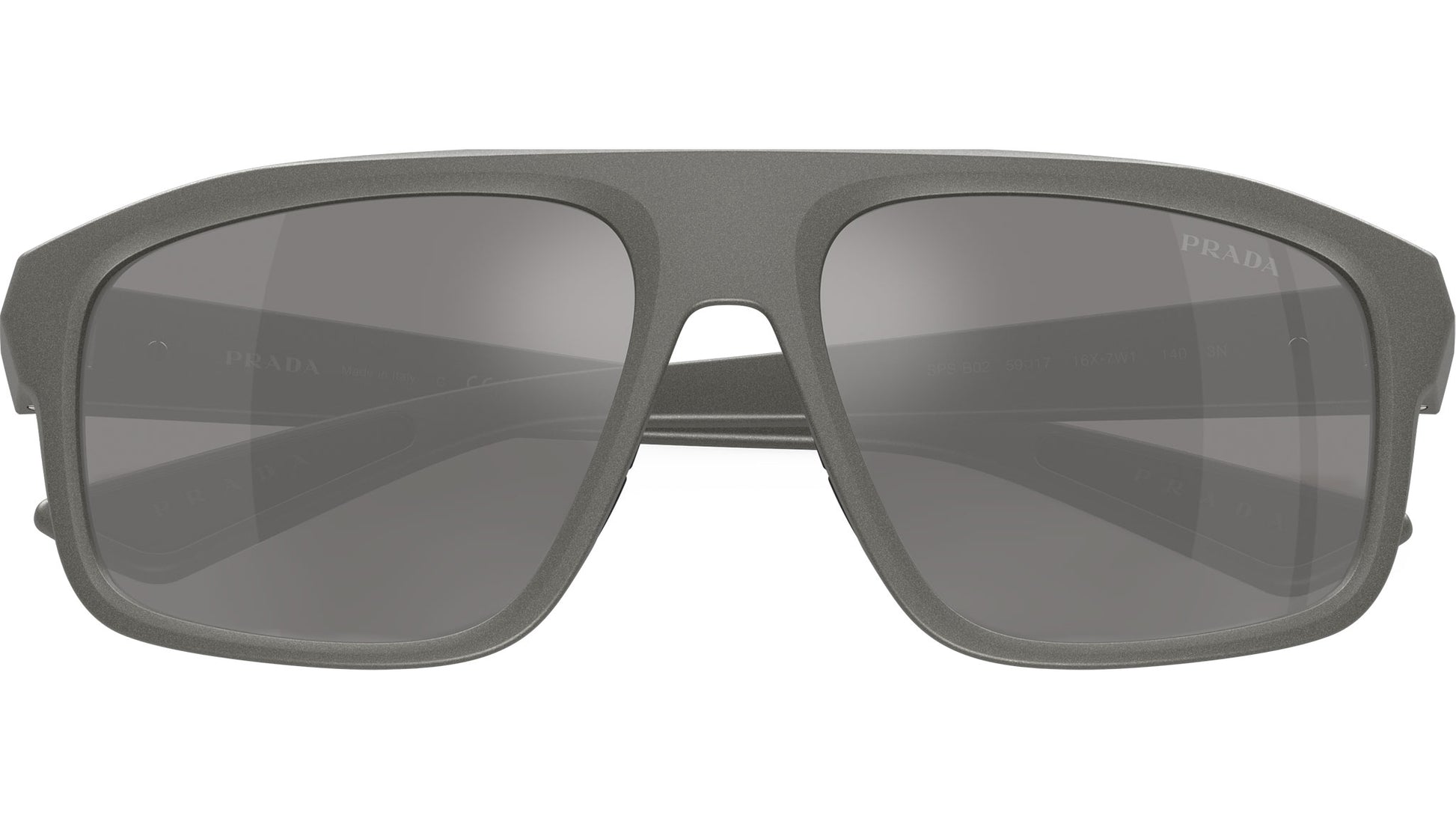 Prada Linea Rossa PS B02S 16X7W1 sunglasses for men, featuring metal grey geometric injection frame and grey mirror silver polyamide lenses. High bridge fit. Brand line: Lifestyle. Style code: PSB02S. Color code: 16X7W1. Made in Italy. Authorized Prada Sport online reseller. Your glasses will include the original case and accessories and are covered by a 12-month global warranty.