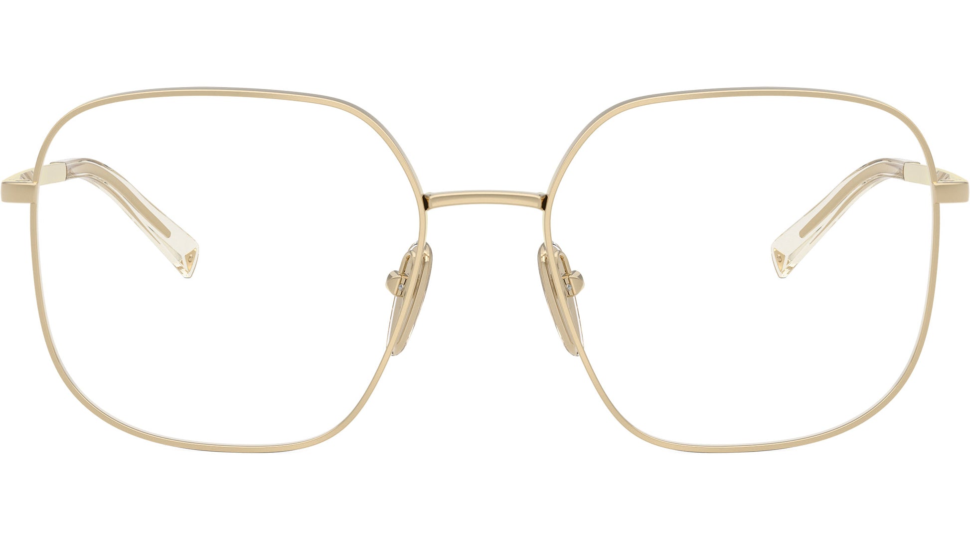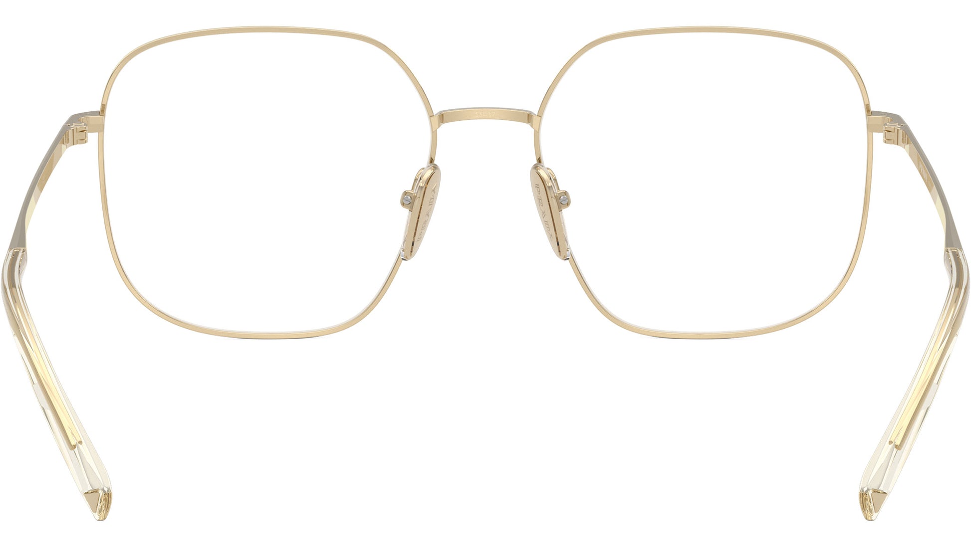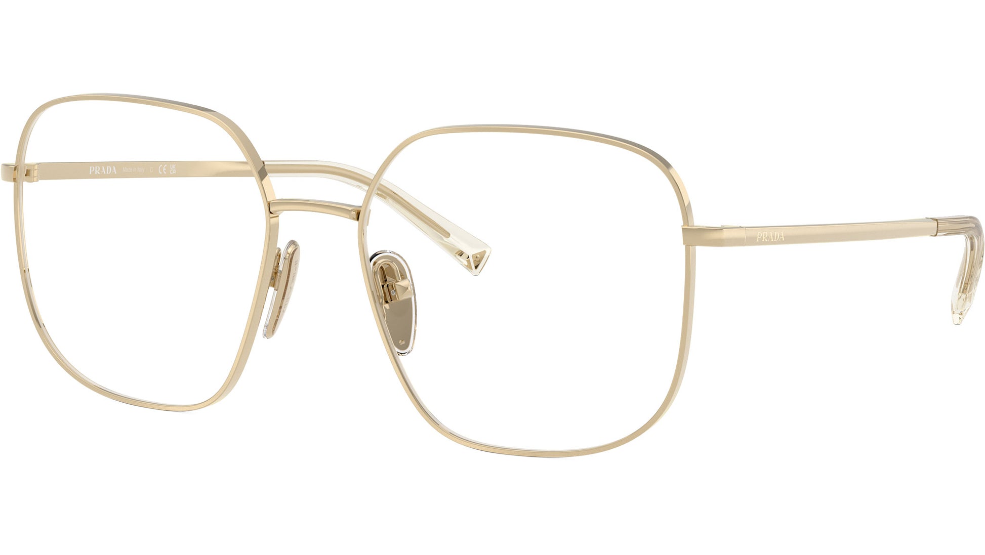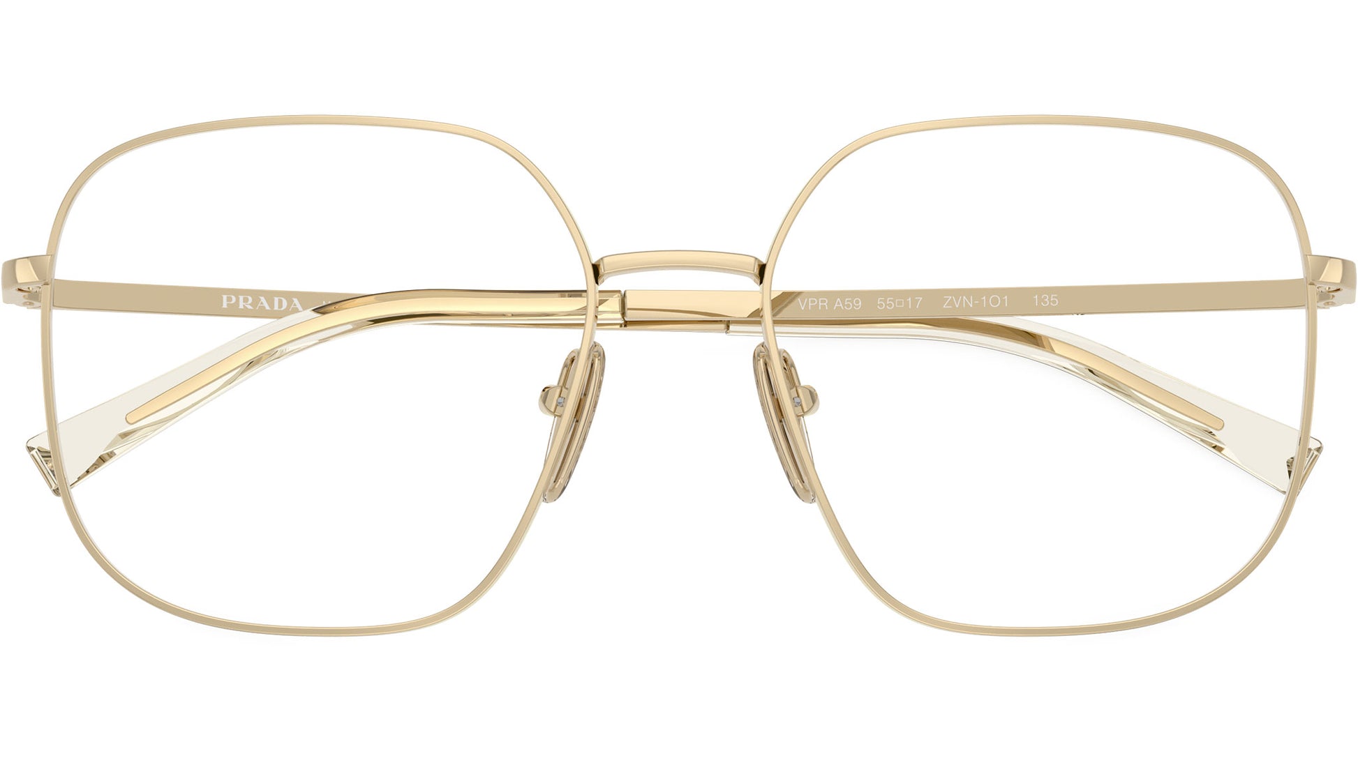 Prada PR A59V ZVN1O1 glasses for women, featuring pale gold squared stainless steel frame and demo lens. Adjustable nosepads. Brand line: Signature. Style code: PRA59V. Color code: ZVN1O1. Made in Italy. Authorized Prada online reseller. Your glasses will include the original case and accessories and are covered by a 12-month global warranty.