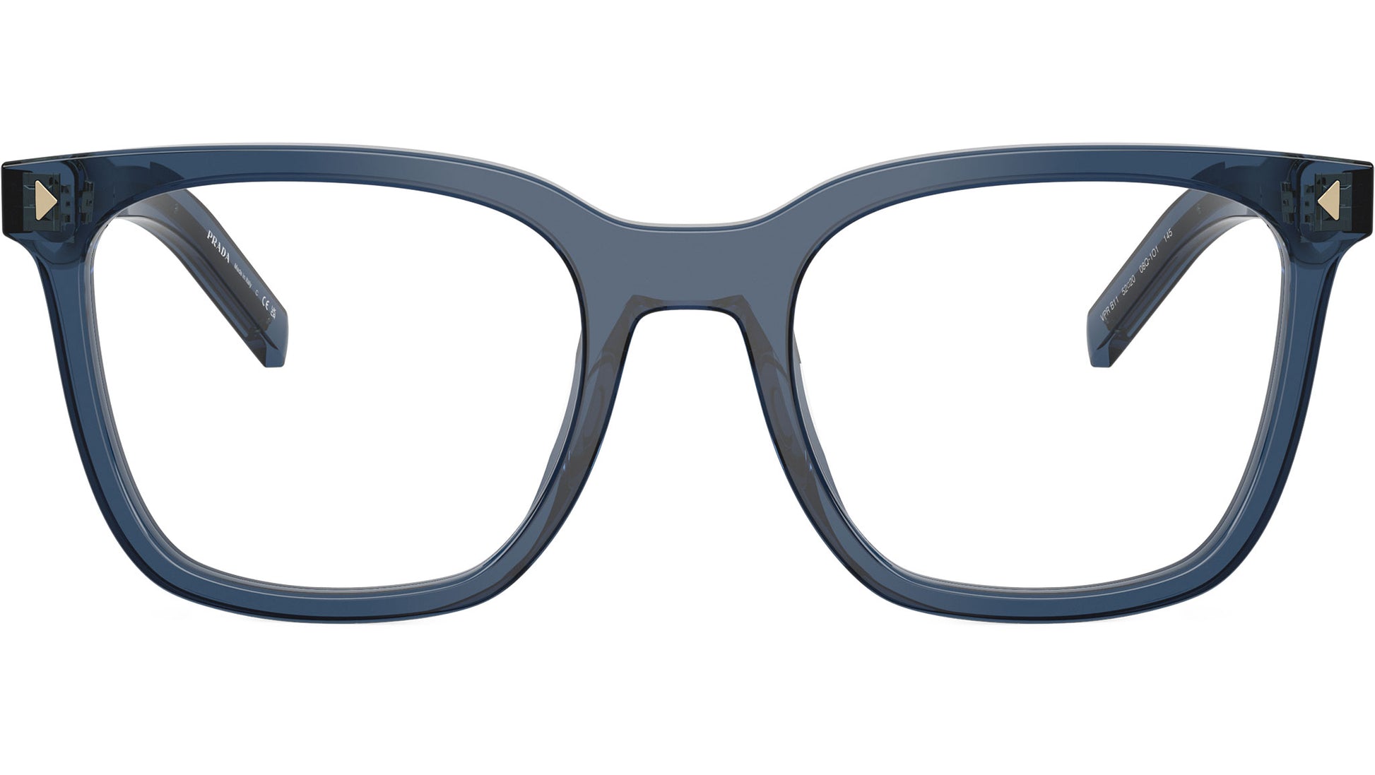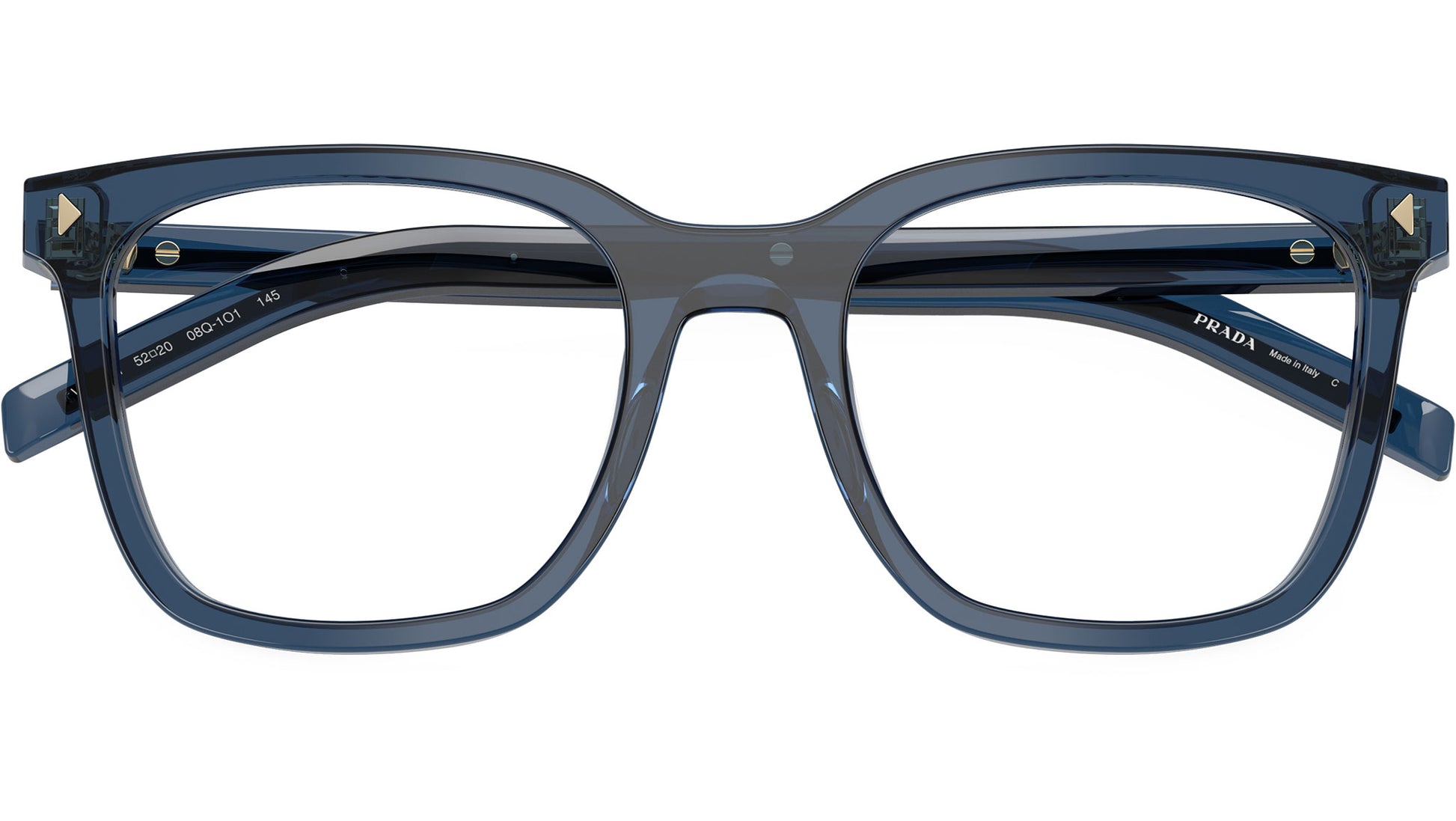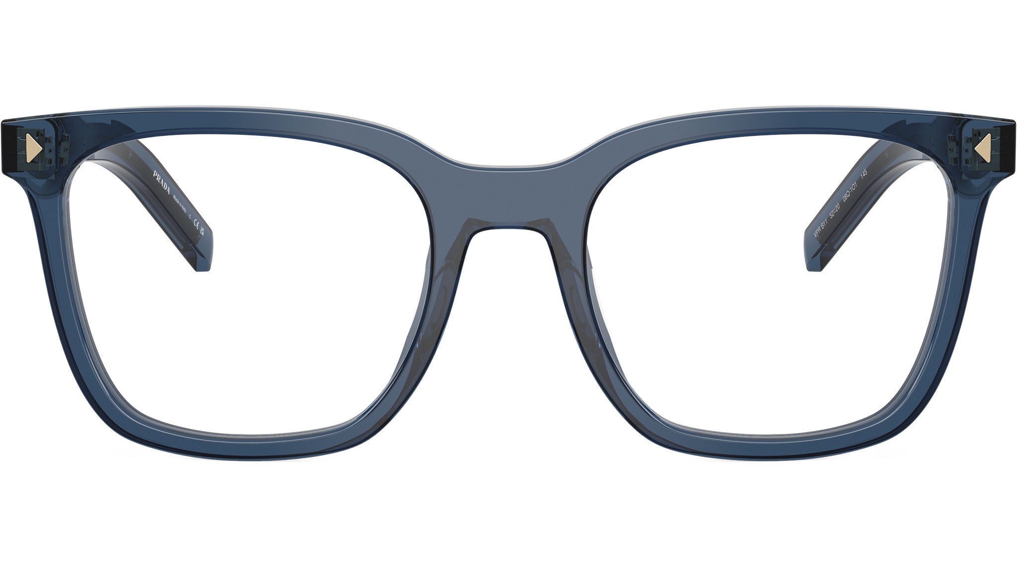 Prada PR B11V 08Q1O1 glasses for women, featuring blue crystal d-frame acetate frame and demo lens. High bridge fit. Brand line: Signature. Style code: PRB11V. Color code: 08Q1O1. Made in Italy. Authorized Prada online reseller. Your glasses will include the original case and accessories and are covered by a 12-month global warranty.