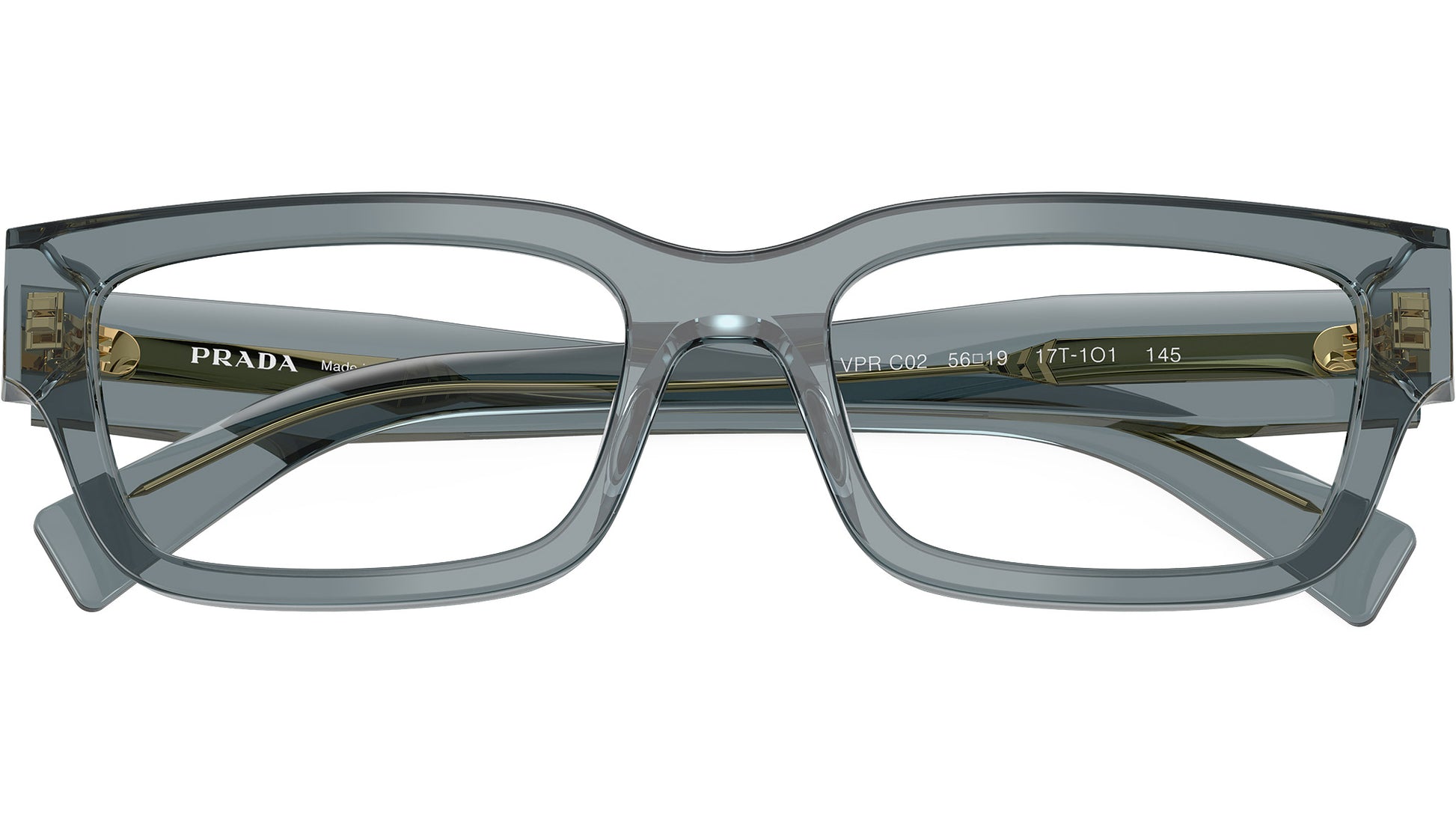 Prada PR C02V 17T1O1 glasses for men, featuring transparent ocean d-frame acetate frame and demo lens. High bridge fit. Brand line: Design. Style code: PRC02V. Color code: 17T1O1. Made in Italy. Authorized Prada online reseller. Your glasses will include the original case and accessories and are covered by a 12-month global warranty.