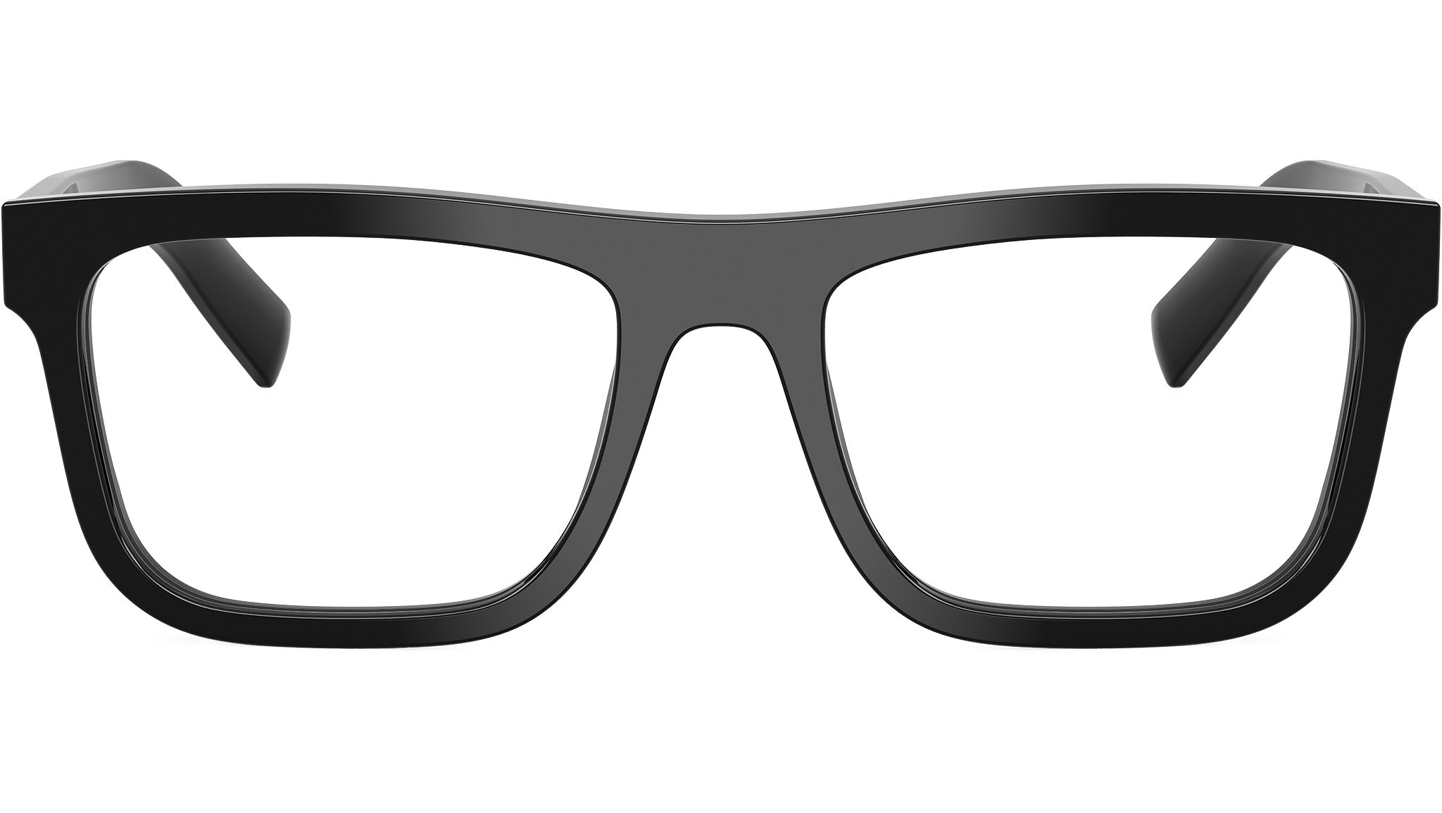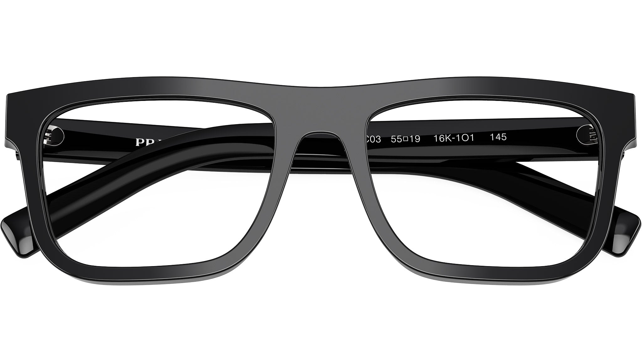 Prada PR C03V 16K1O1 glasses for men, featuring black d-frame acetate frame and demo lens. High bridge fit. Brand line: Essential. Style code: PRC03V. Color code: 16K1O1. Made in Italy. Authorized Prada online reseller. Your glasses will include the original case and accessories and are covered by a 12-month global warranty.