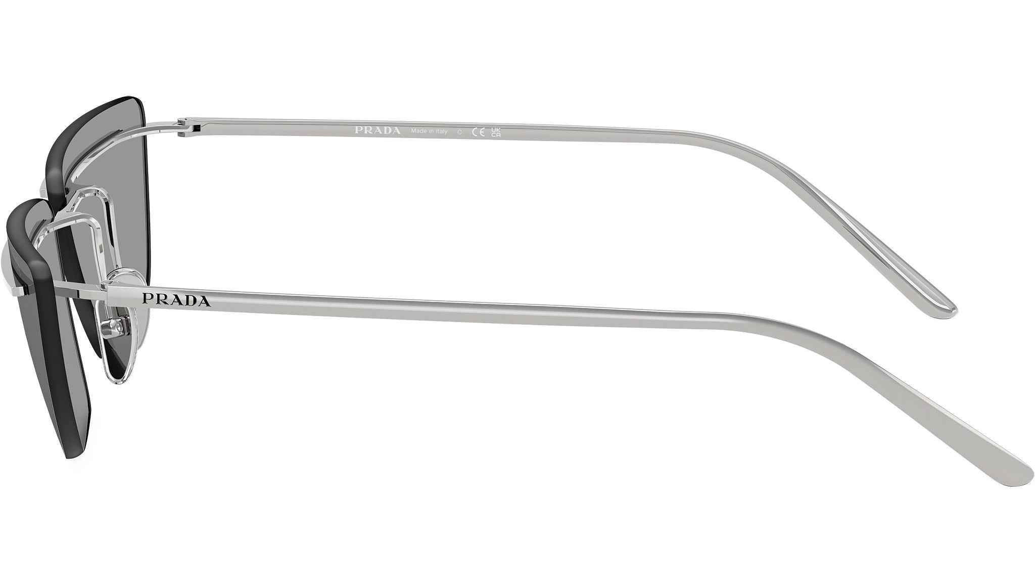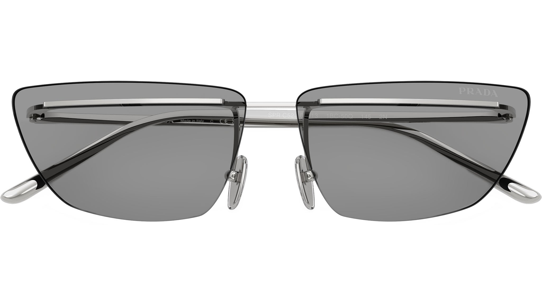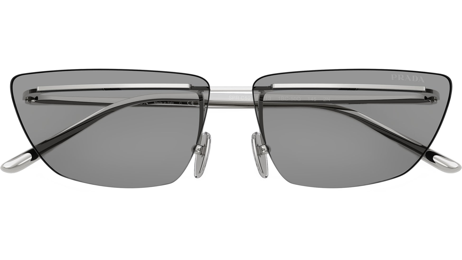 Prada PR C52S 1BC50Q sunglasses for women, featuring silver butterfly metal frame and grey bio polyamide lenses. Adjustable nosepads. Brand line: Essential. Style code: PRC52S. Color code: 1BC50Q. Made in Italy. Authorized Prada online reseller. Your glasses will include the original case and accessories and are covered by a 12-month global warranty.