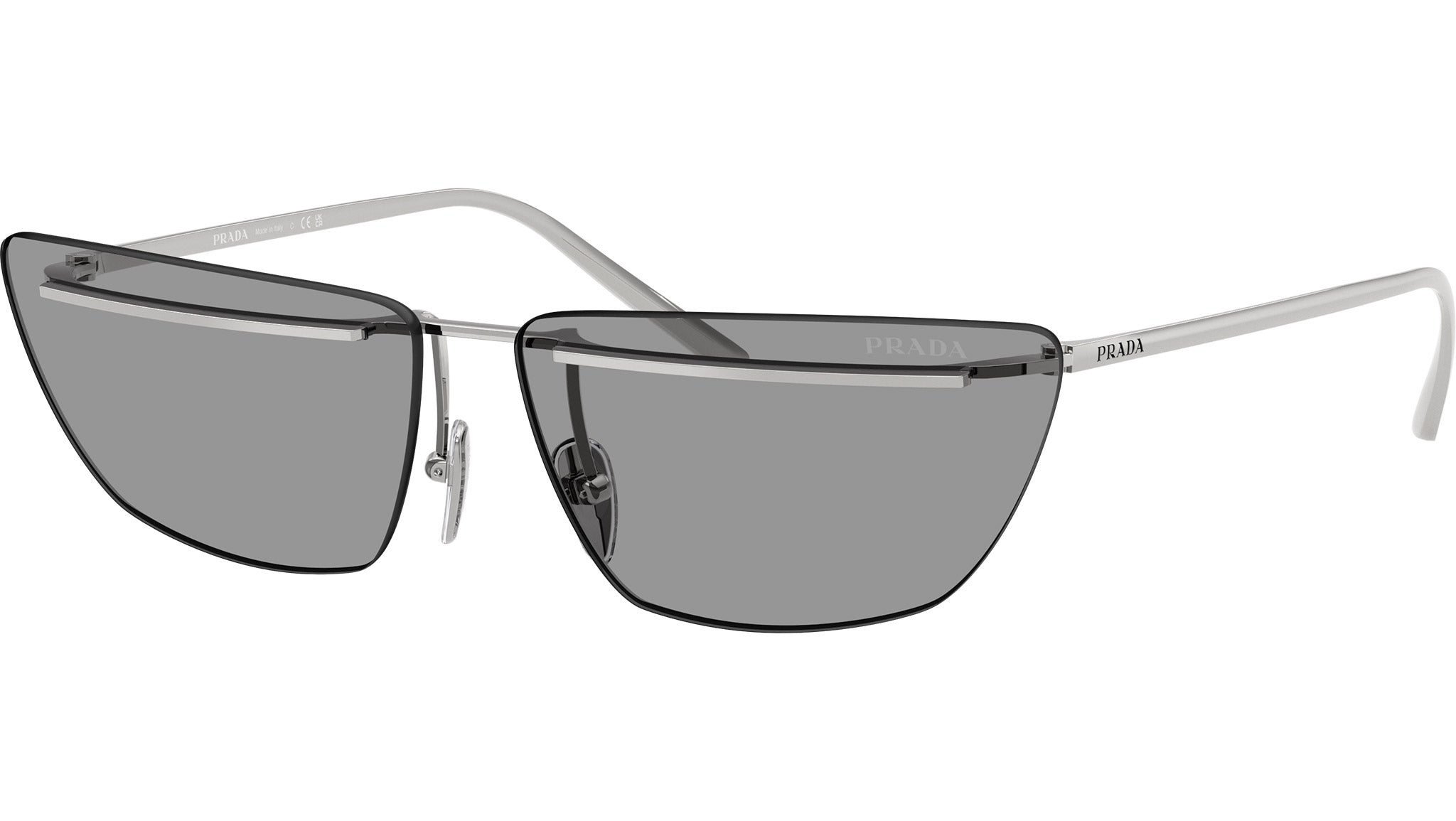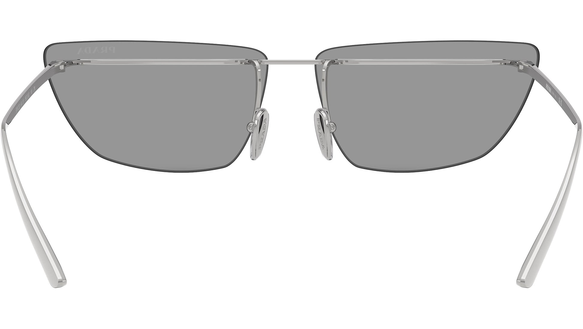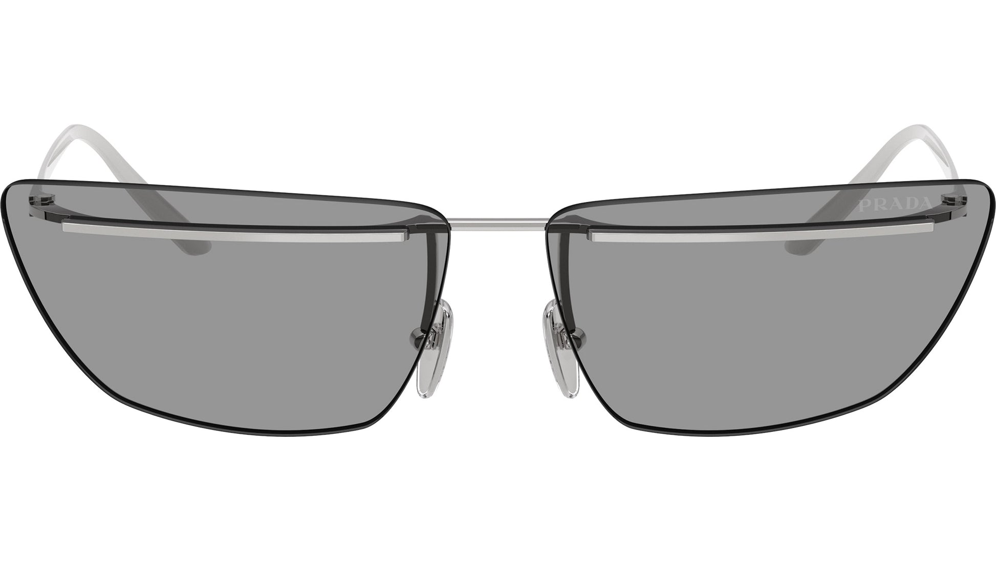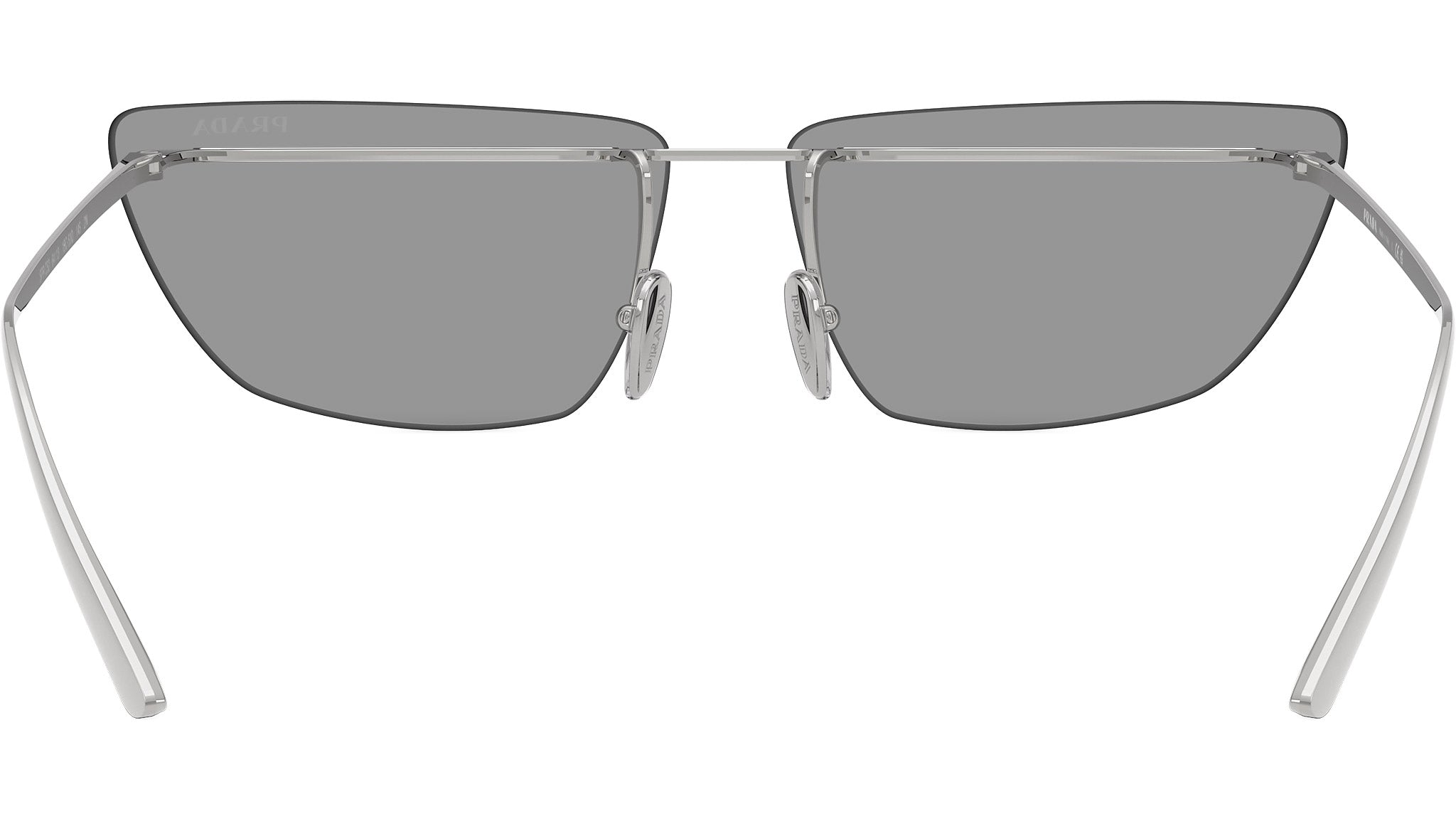 Prada PR C52S 1BC50Q sunglasses for women, featuring silver butterfly metal frame and grey bio polyamide lenses. Adjustable nosepads. Brand line: Essential. Style code: PRC52S. Color code: 1BC50Q. Made in Italy. Authorized Prada online reseller. Your glasses will include the original case and accessories and are covered by a 12-month global warranty.
