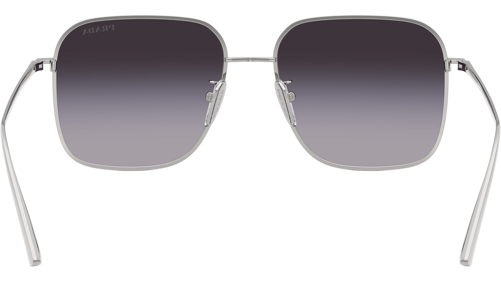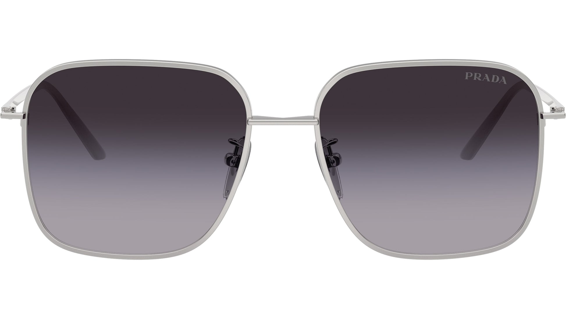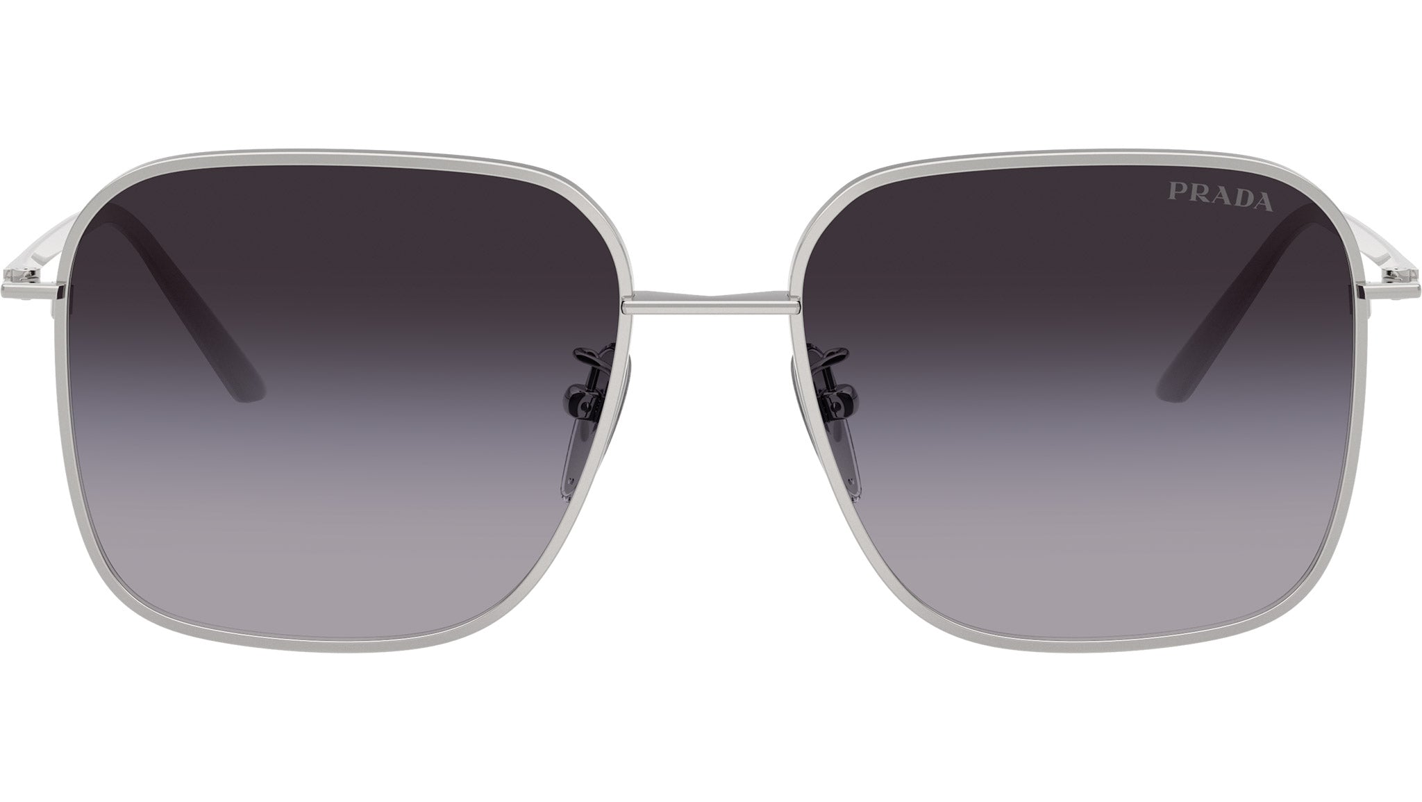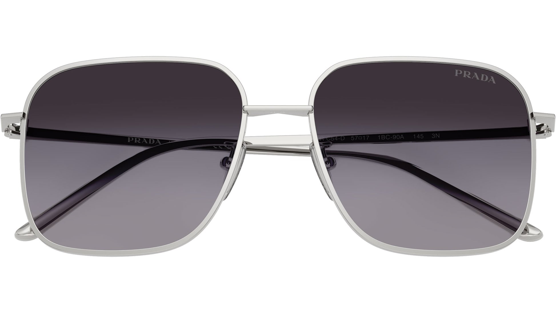 Prada PR C54SD 1BC90A sunglasses for women, featuring silver squared metal frame and grey gradient bio polyamide lenses. Low bridge fit. Brand line: Essential. Style code: PRC54SD. Color code: 1BC90A. Made in Italy. Authorized Prada online reseller. Your glasses will include the original case and accessories and are covered by a 12-month global warranty.