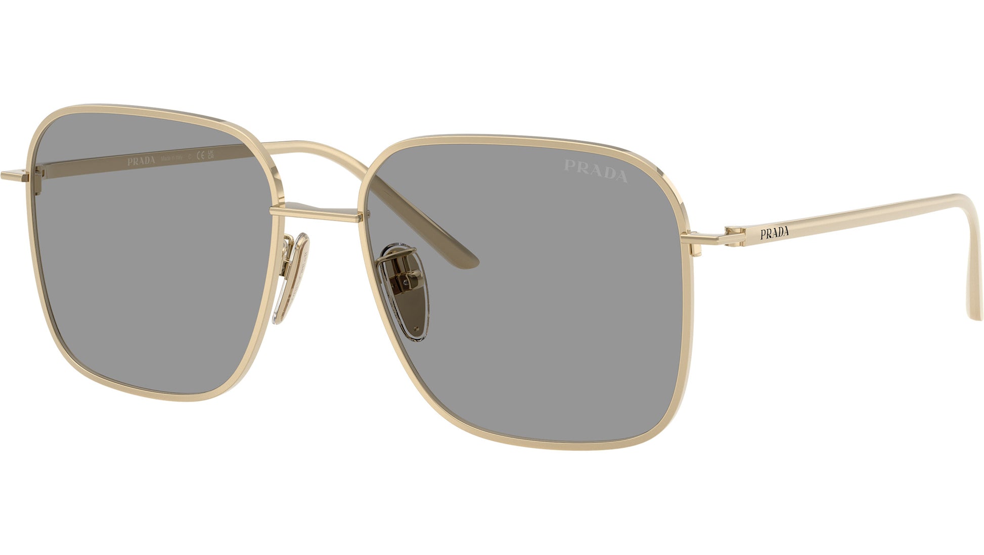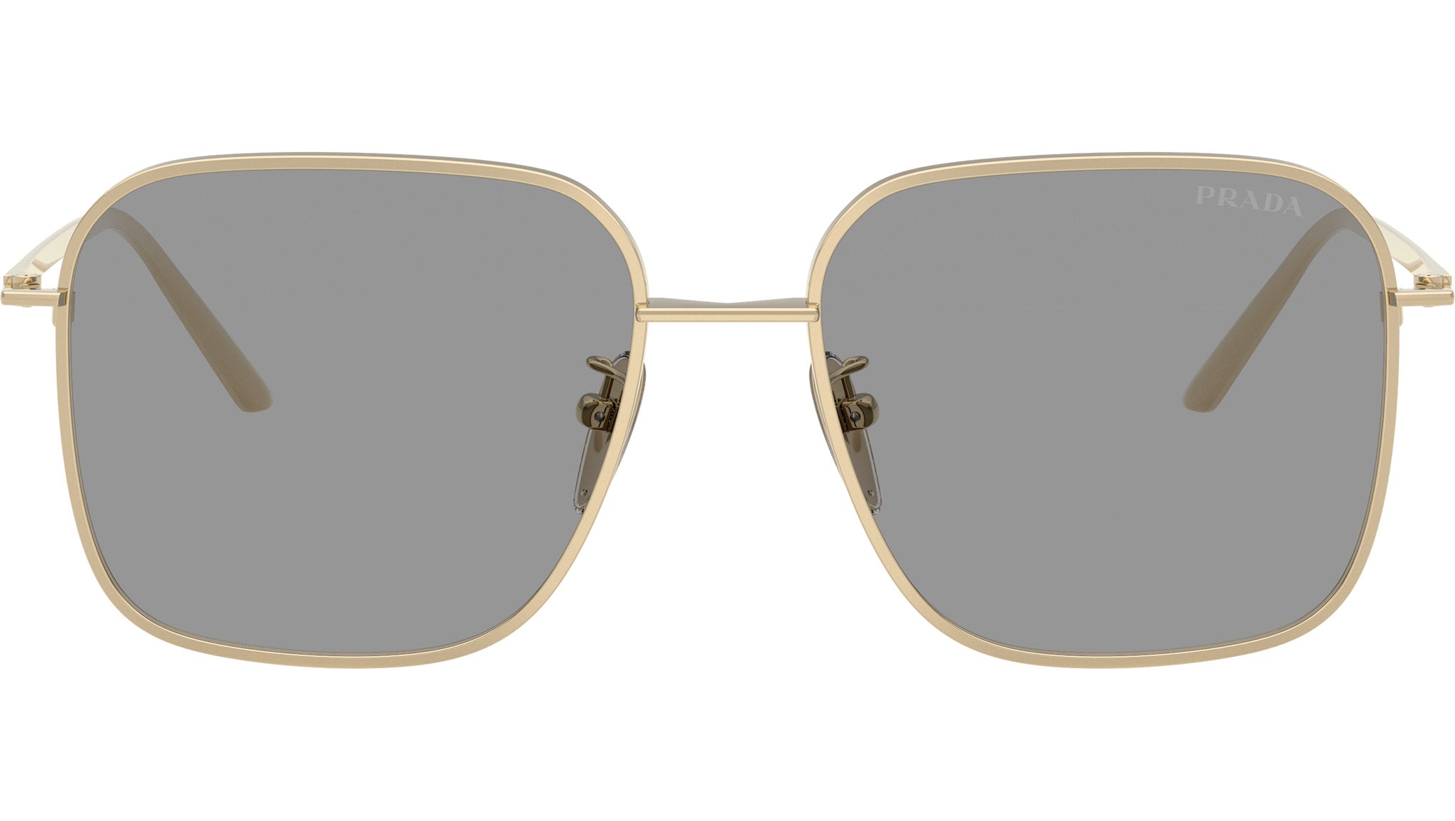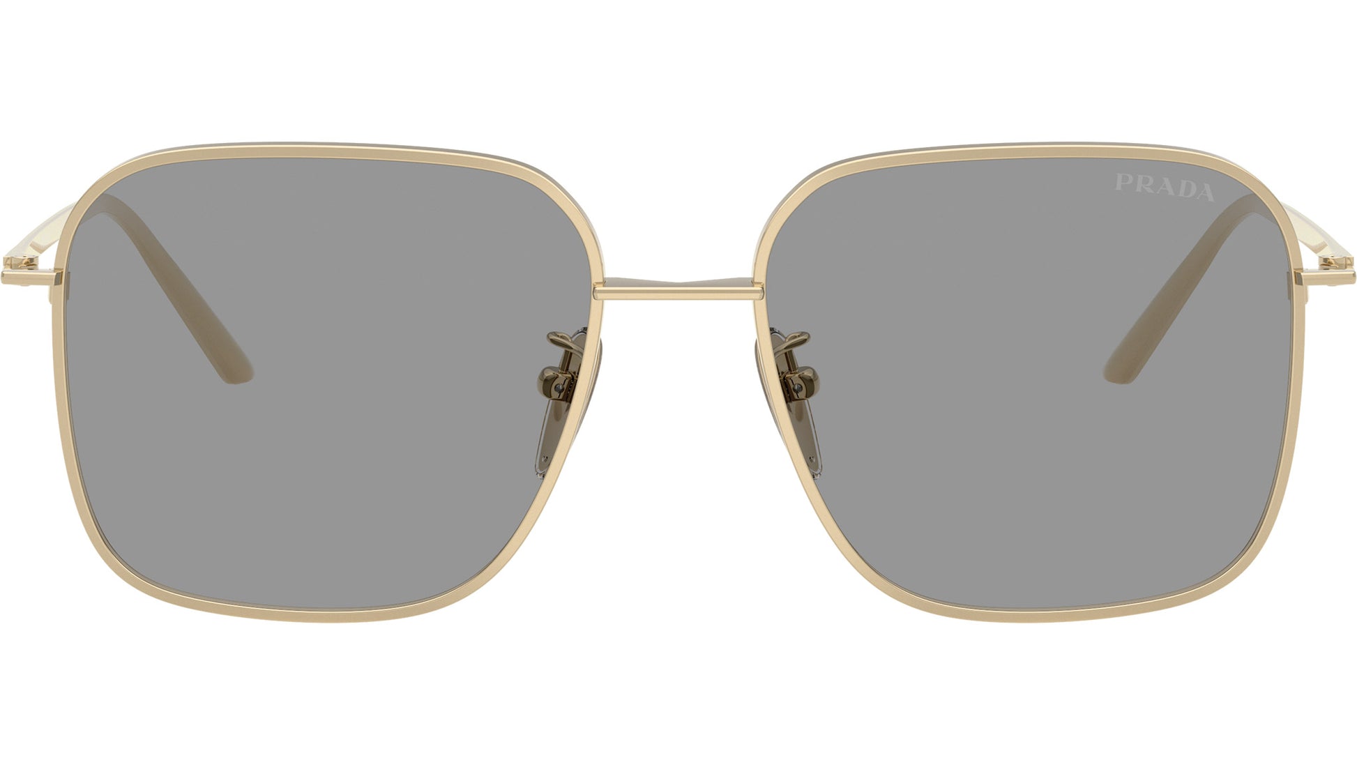 Prada PR C54SD ZVN50Q sunglasses for women, featuring pale gold squared metal frame and grey bio polyamide lenses. Low bridge fit. Brand line: Essential. Style code: PRC54SD. Color code: ZVN50Q. Made in Italy. Authorized Prada online reseller. Your glasses will include the original case and accessories and are covered by a 12-month global warranty.