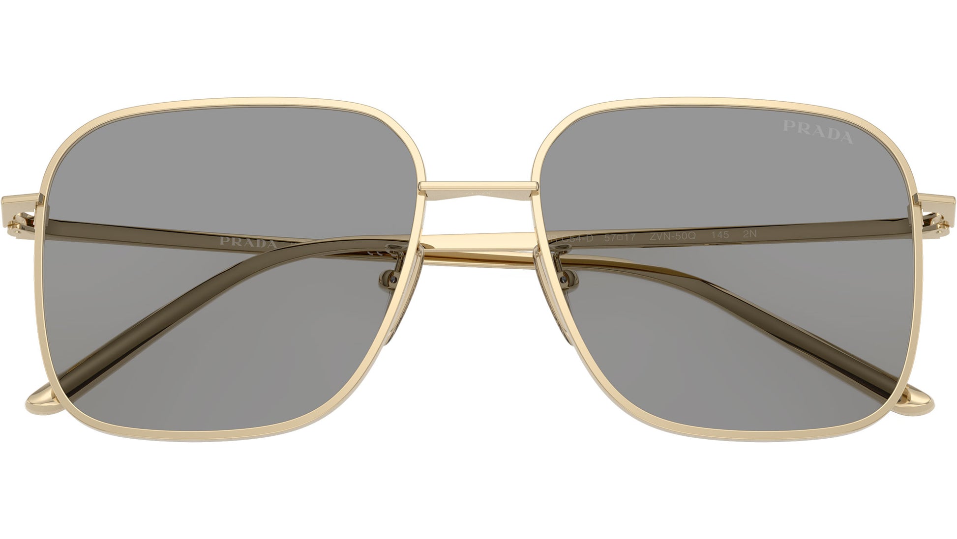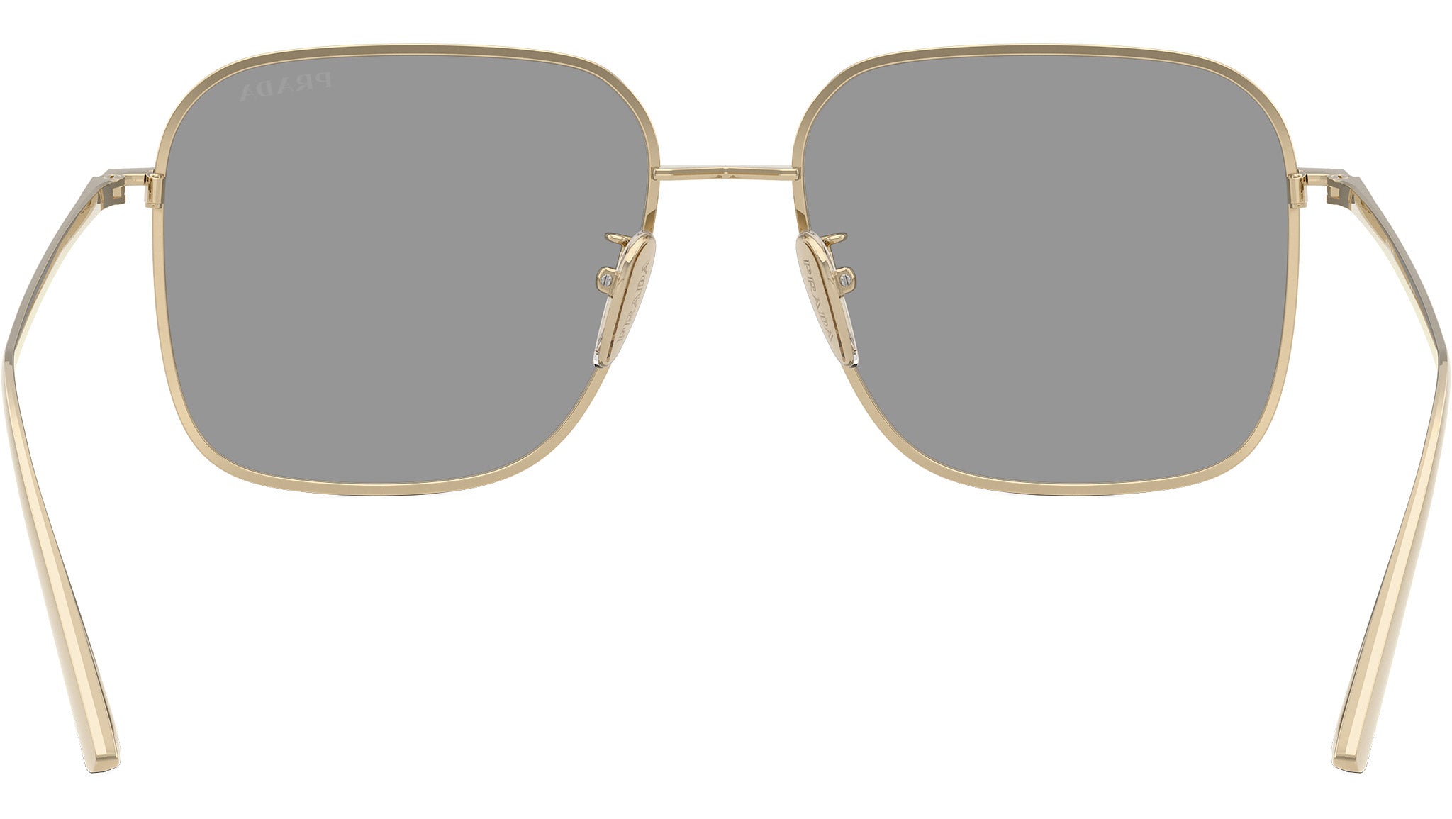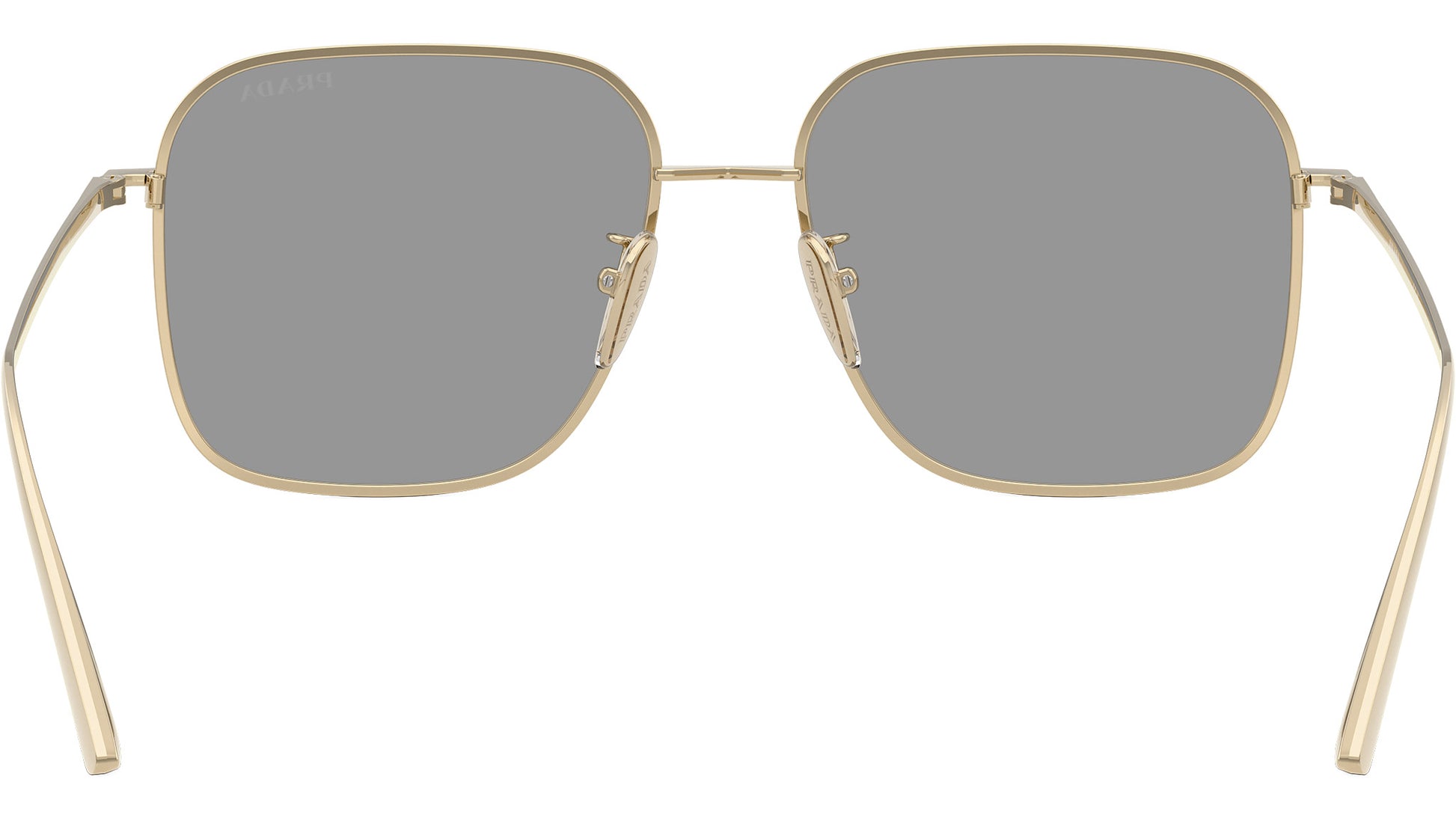 Prada PR C54SD ZVN50Q sunglasses for women, featuring pale gold squared metal frame and grey bio polyamide lenses. Low bridge fit. Brand line: Essential. Style code: PRC54SD. Color code: ZVN50Q. Made in Italy. Authorized Prada online reseller. Your glasses will include the original case and accessories and are covered by a 12-month global warranty.