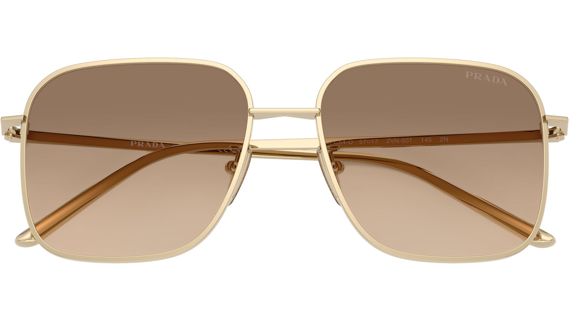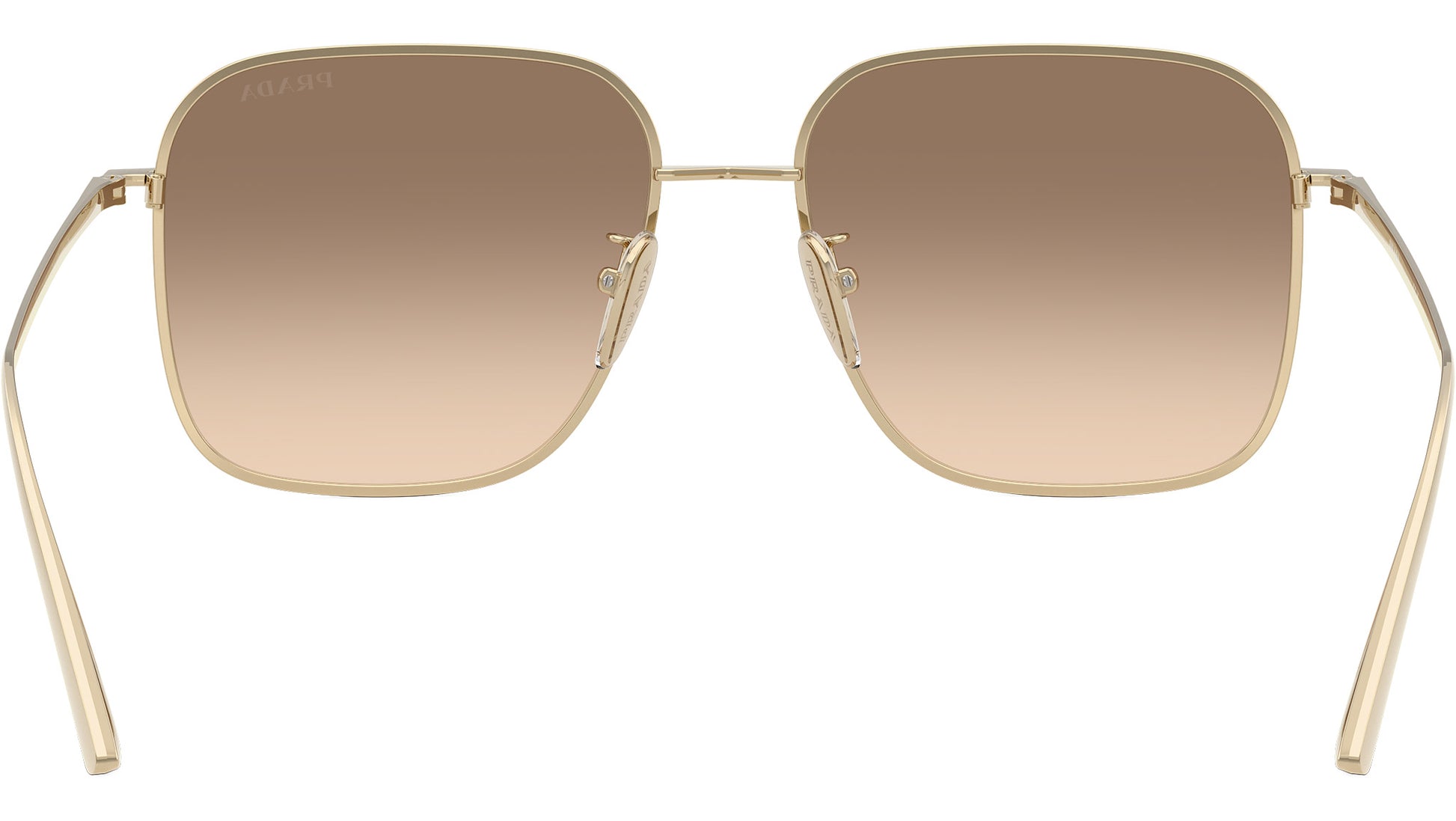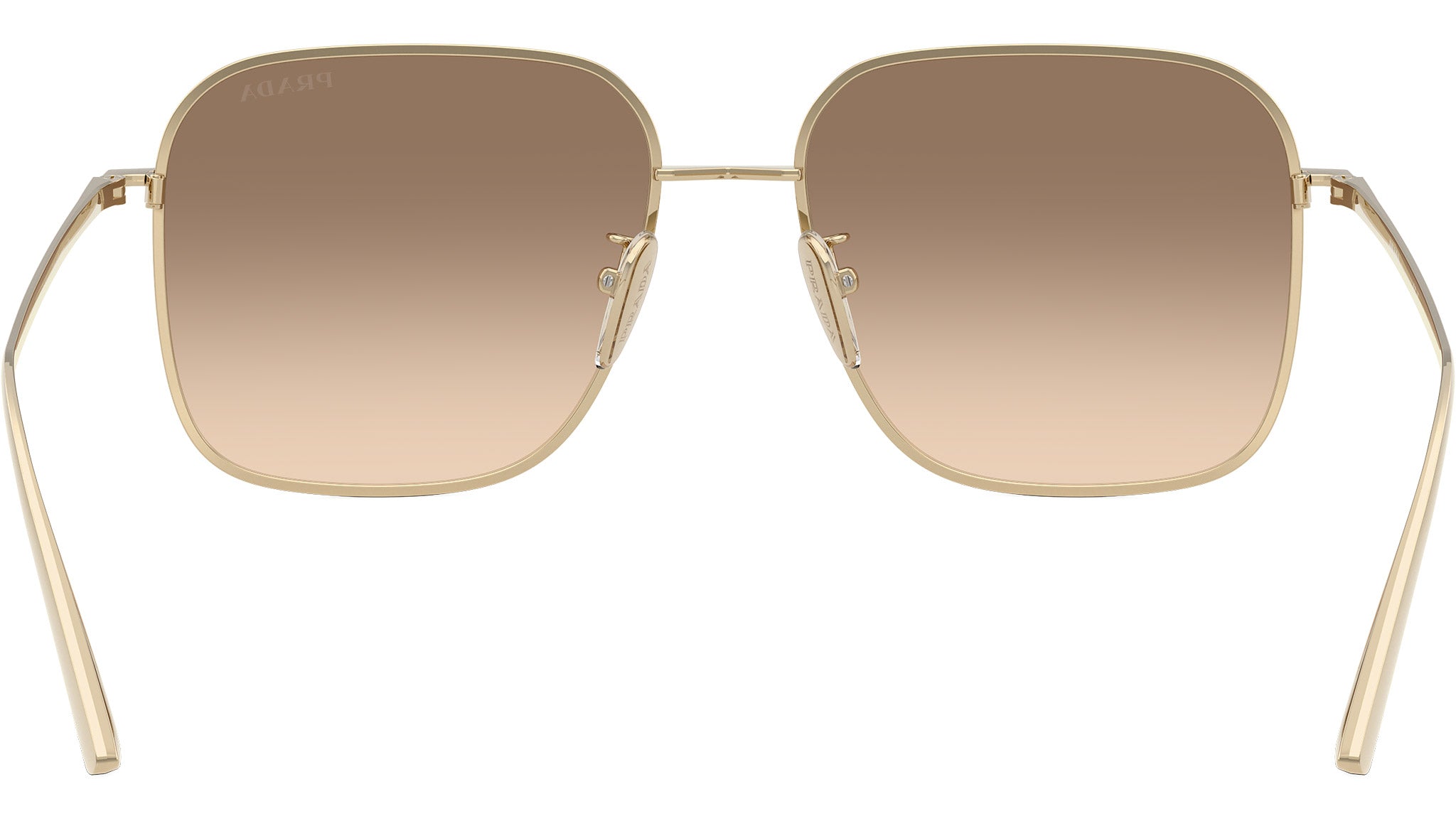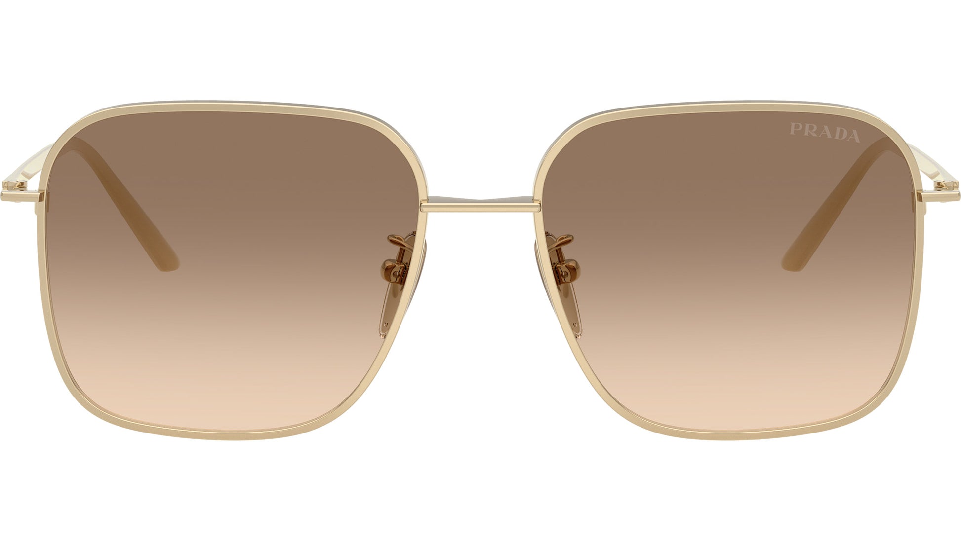 Prada PR C54SD ZVN50T sunglasses for women, featuring pale gold squared metal frame and light brown gradient light grey bio polyamide lenses. Low bridge fit. Brand line: Essential. Style code: PRC54SD. Color code: ZVN50T. Made in Italy. Authorized Prada online reseller. Your glasses will include the original case and accessories and are covered by a 12-month global warranty.
